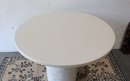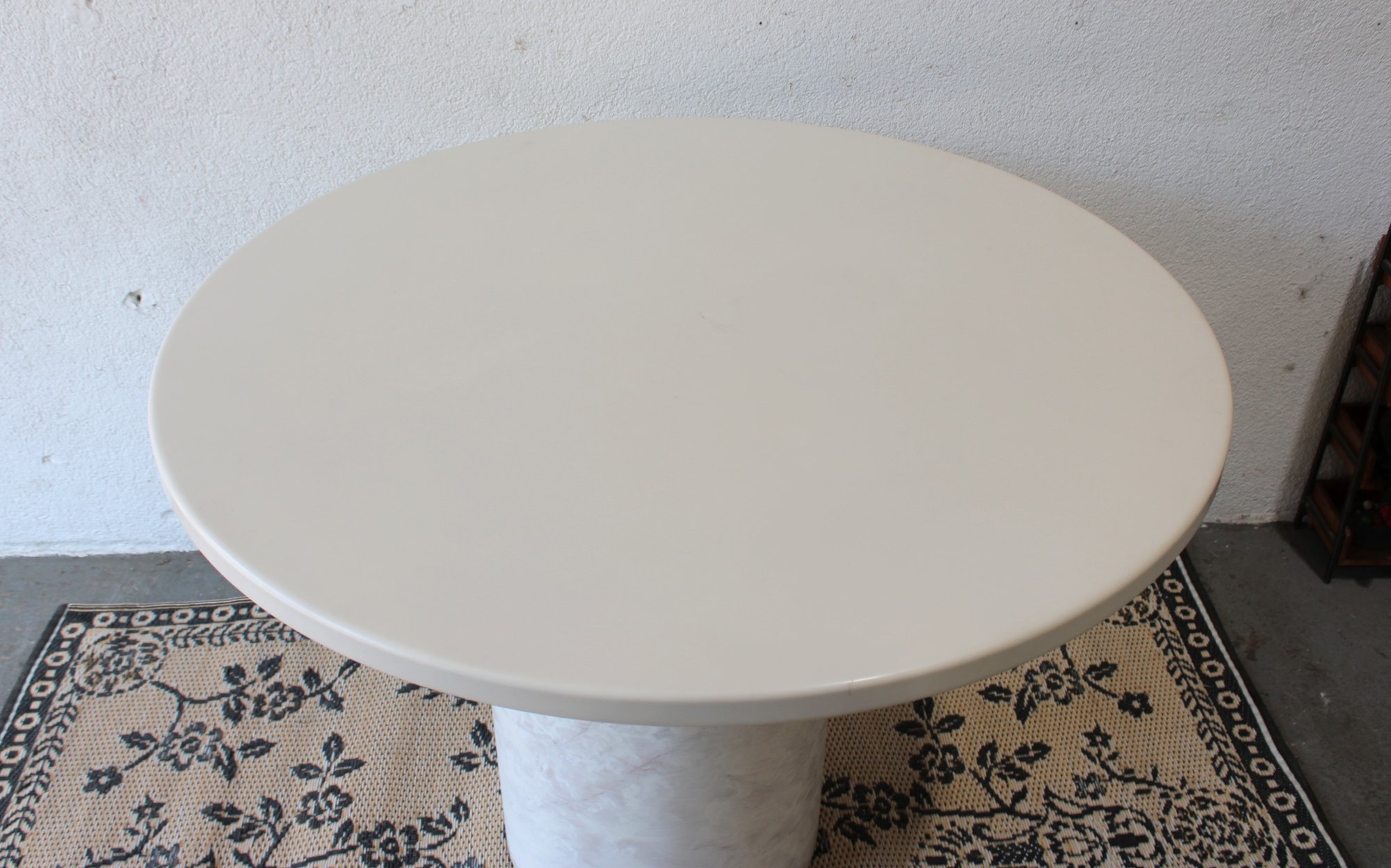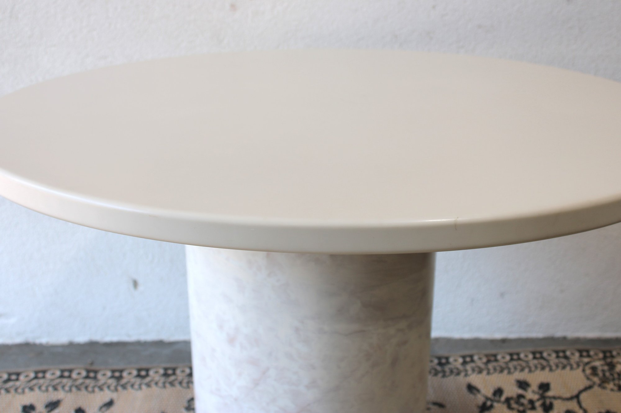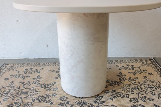 The minimalist design includes a smooth, light-toned tabletop paired with a sturdy cylindrical pedestal base finished in a subtle faux marble pattern. Its neutral color palette blends effortlessly with a variety of décor styles, from contemporary to Scandinavian-inspired interiors.