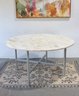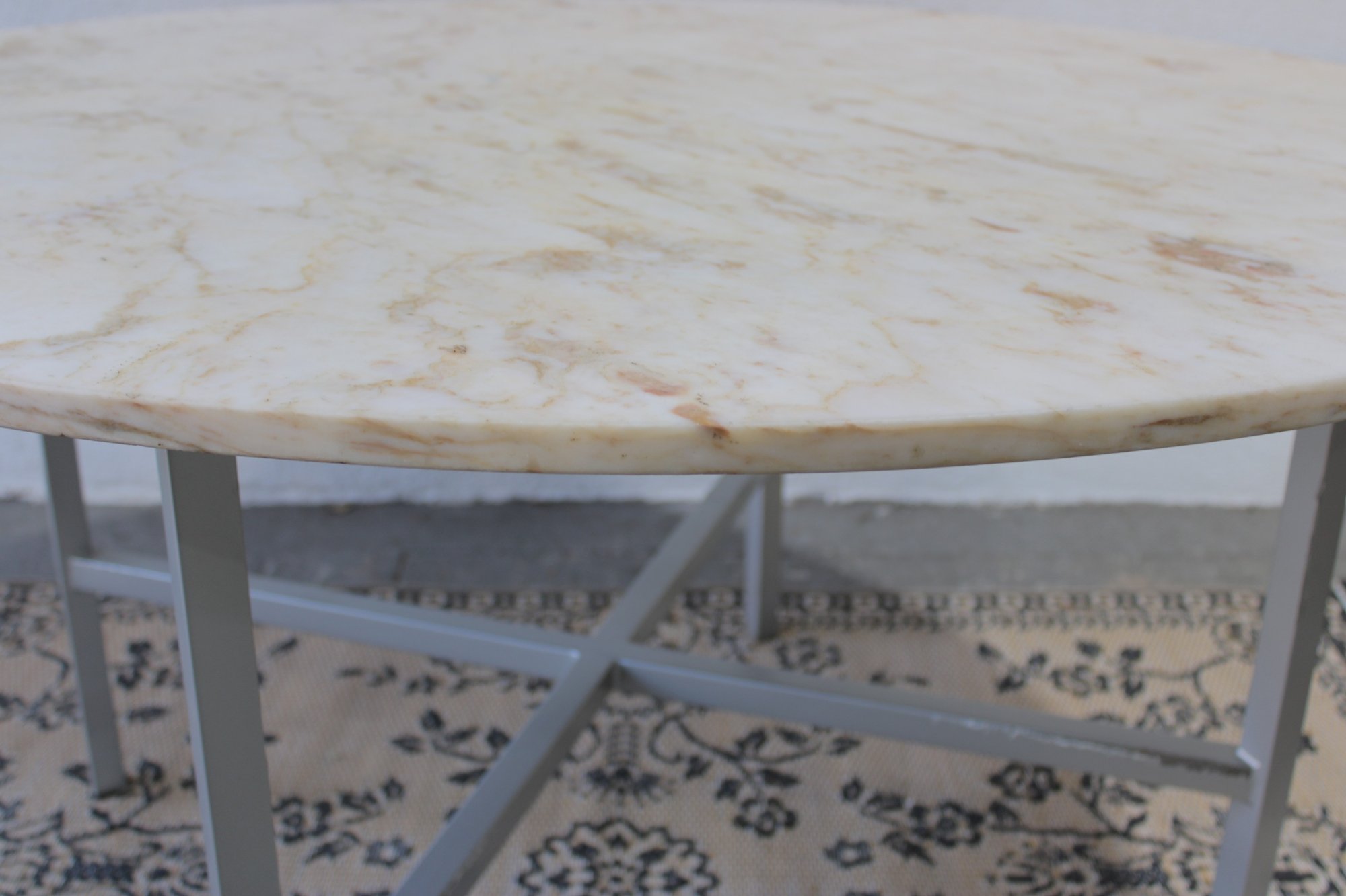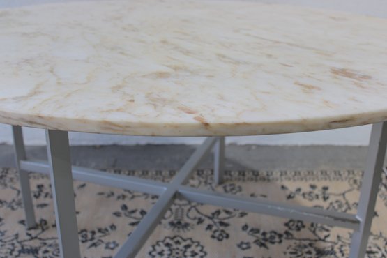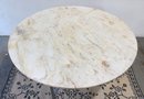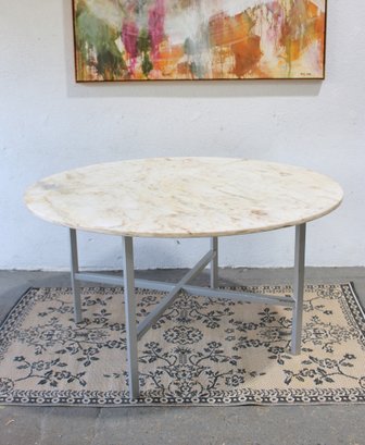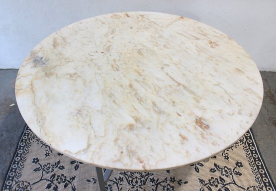 Sleek and stylish modern dining table featuring a round faux marble top paired with a clean white metal base. The tabletop showcases a soft, natural stone-look pattern with warm beige and cream tones, offering the elegance of marble with everyday practicality.