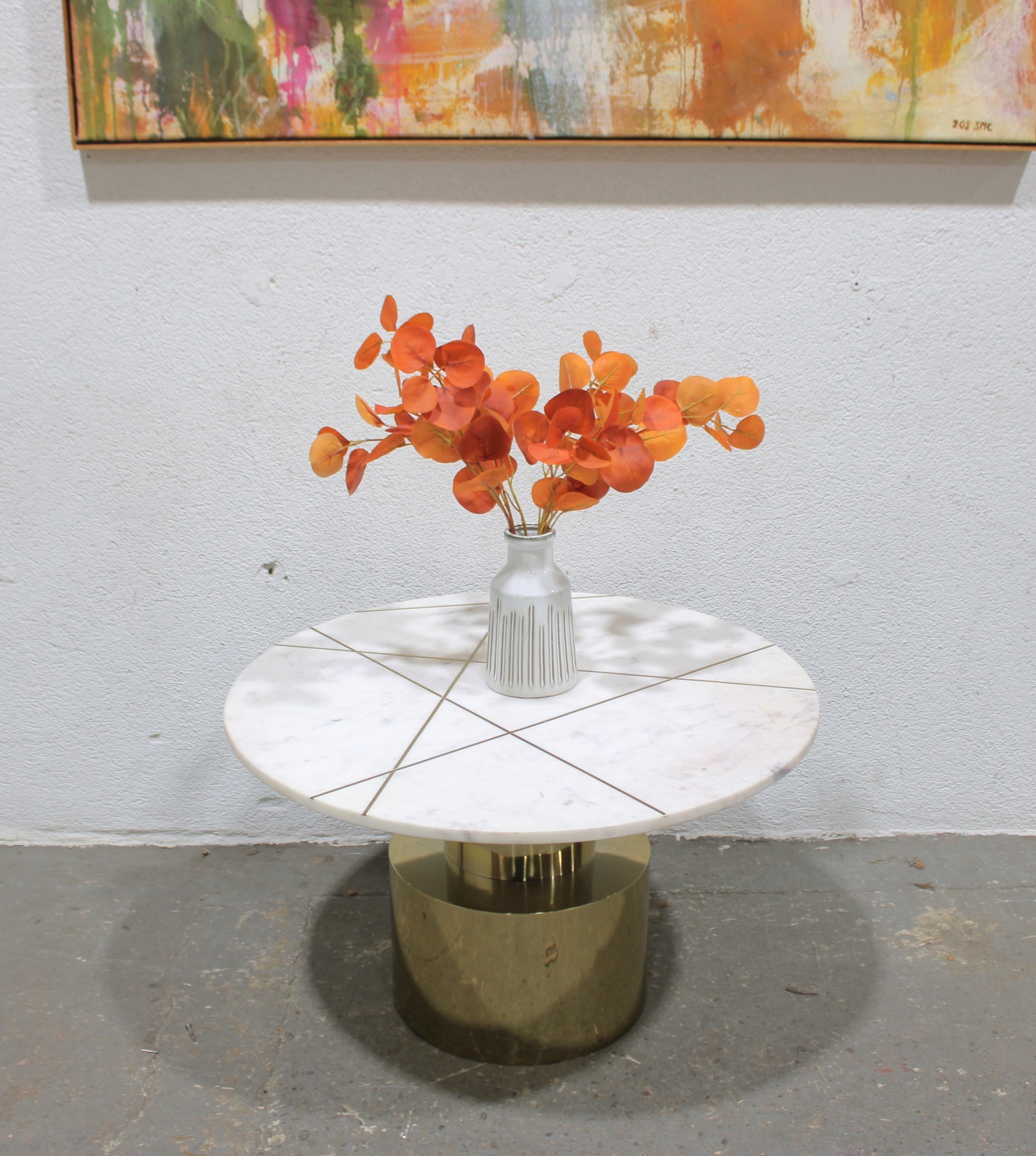 The combination of natural marble and metallic detailing offers a perfect balance of elegance and modern style, making this table ideal for living rooms, lounges, or upscale interiors. Its compact round shape makes it both functional and visually impactful.