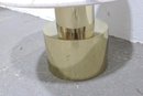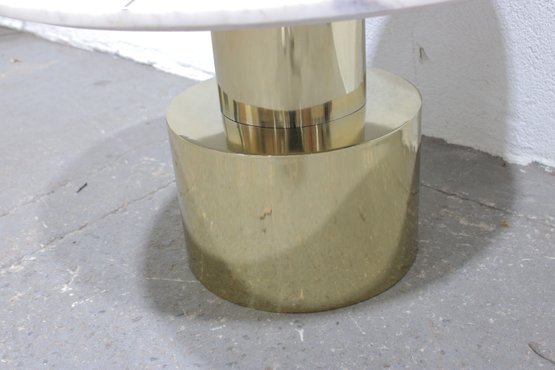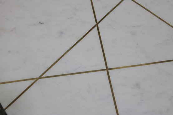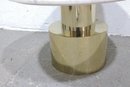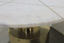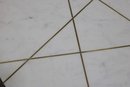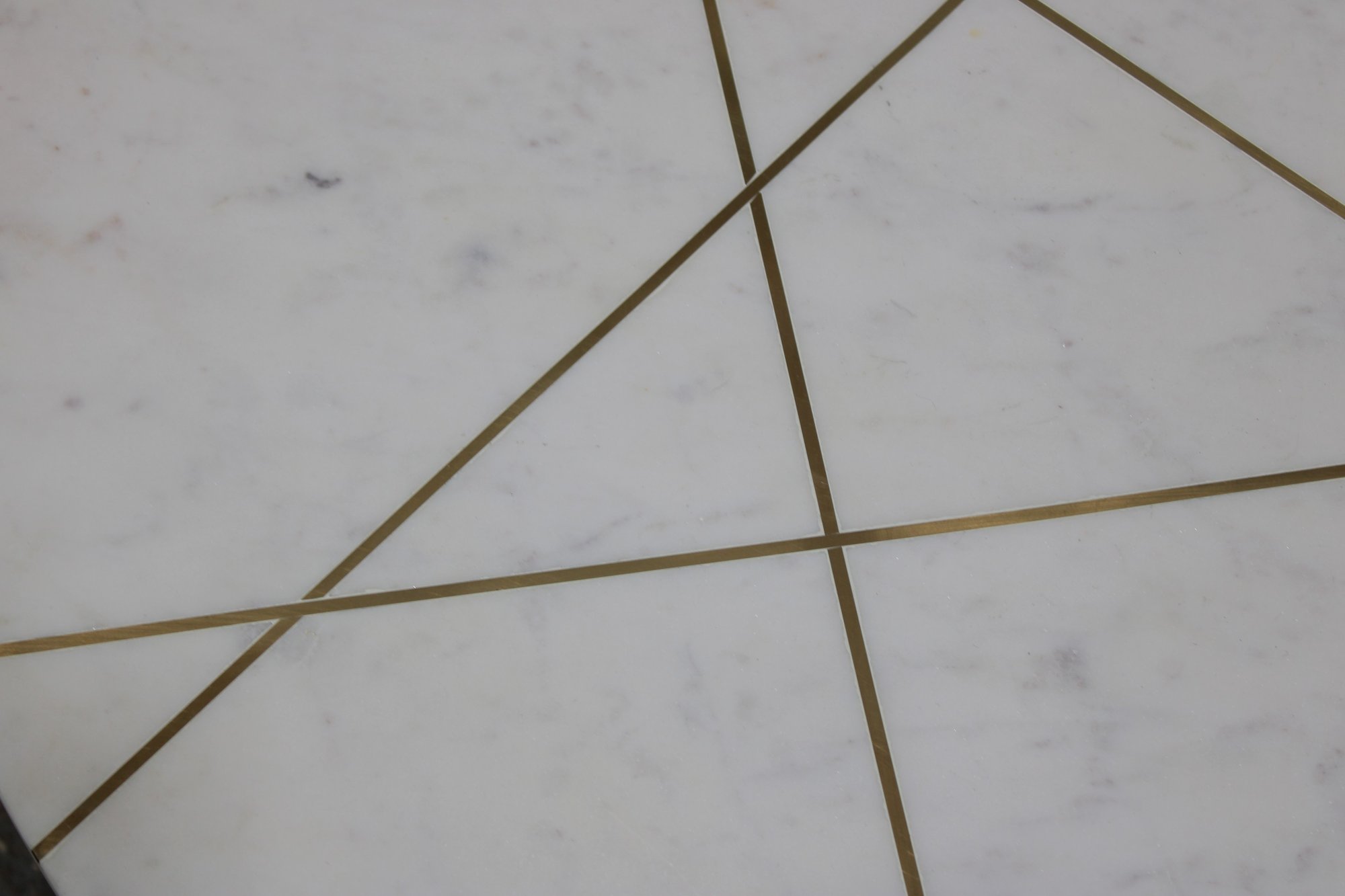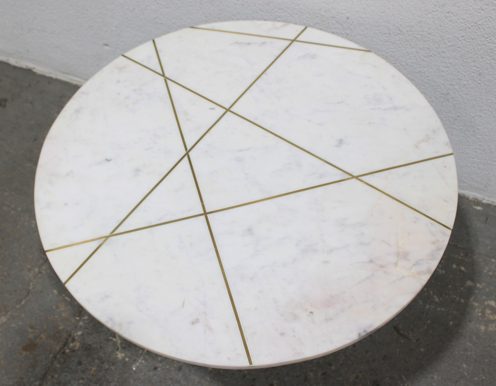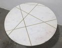Sophisticated contemporary coffee table featuring a round white marble top accented with striking brass inlay lines in a geometric pattern. The bold design is complemented by a polished brass pedestal base, creating a luxurious and modern statement piece.