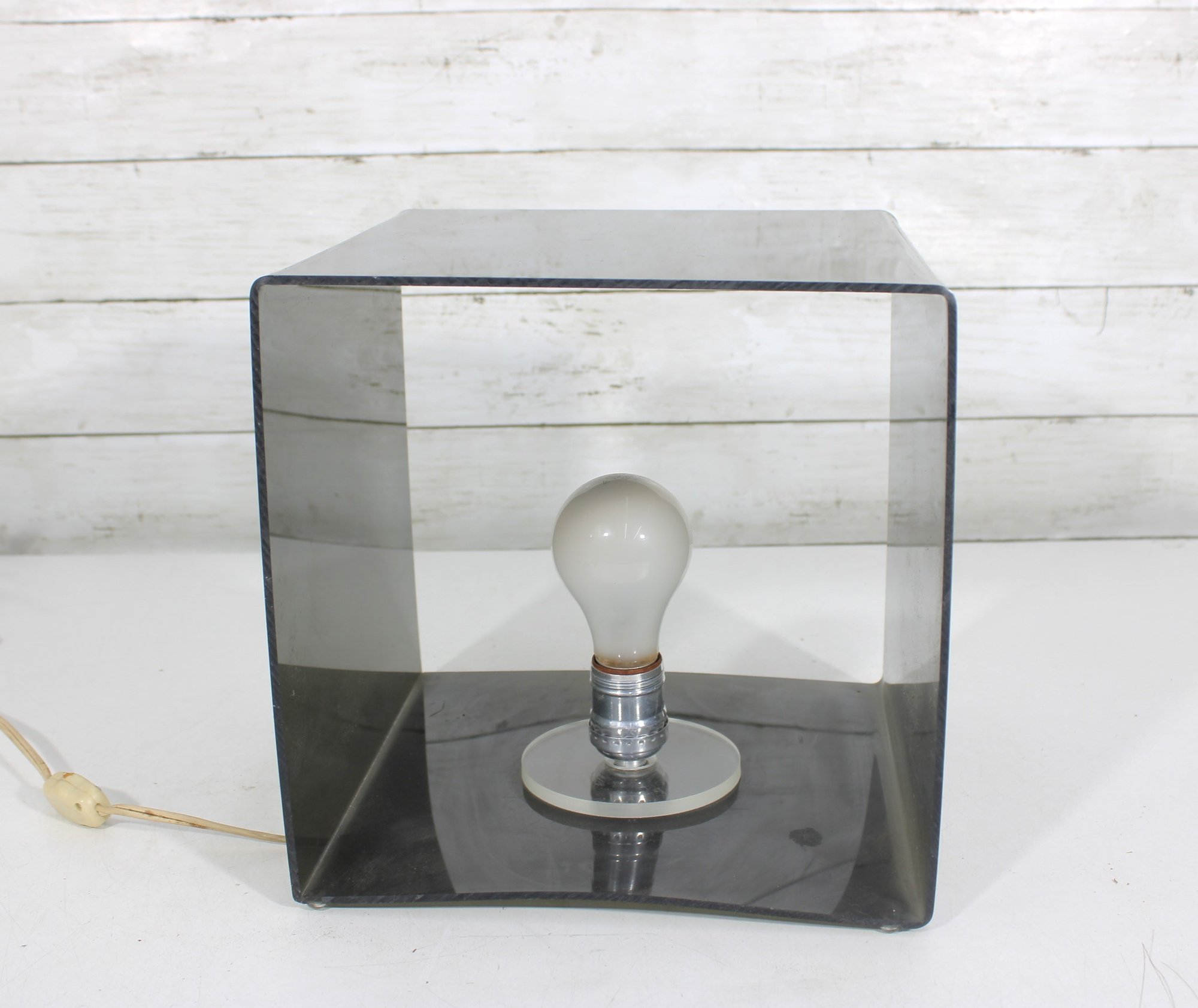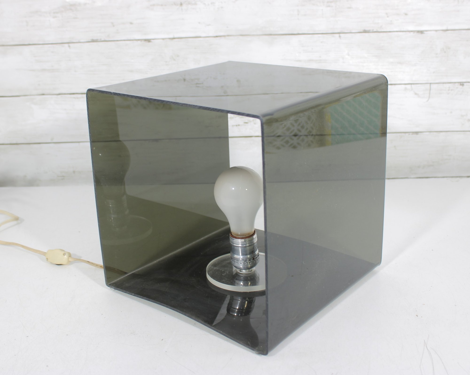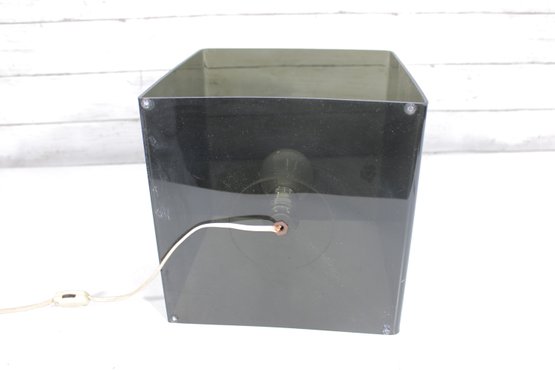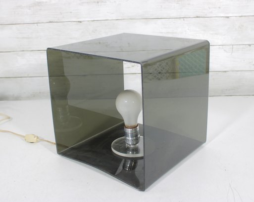 Unique modern cube table lamp featuring a sleek smoked acrylic shade with a minimalist open design. The tinted acrylic panels form a geometric cube that surrounds a single exposed bulb, creating a stylish contemporary look.