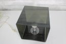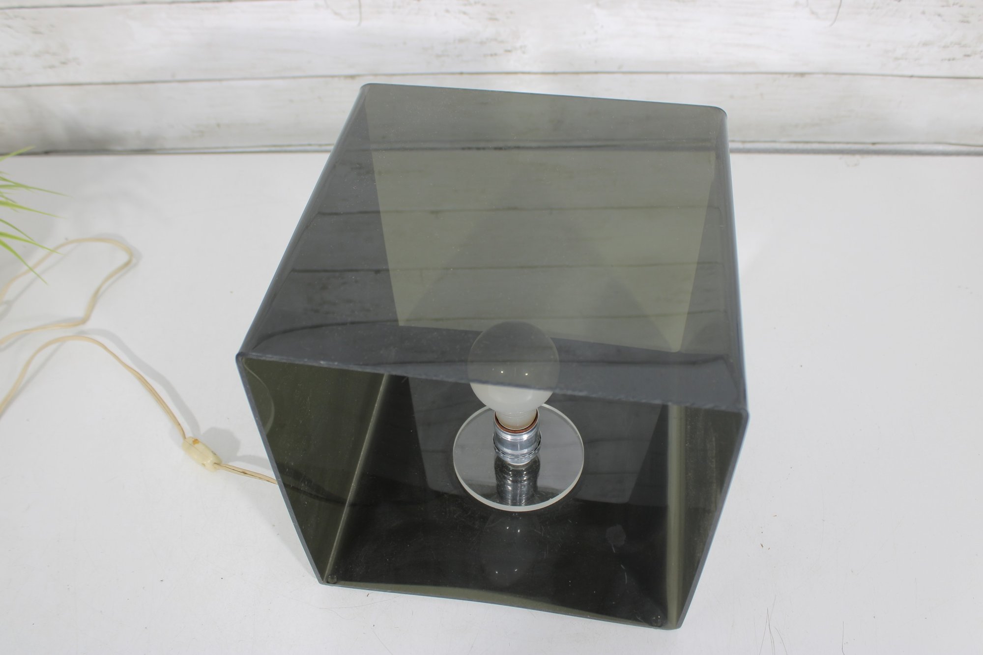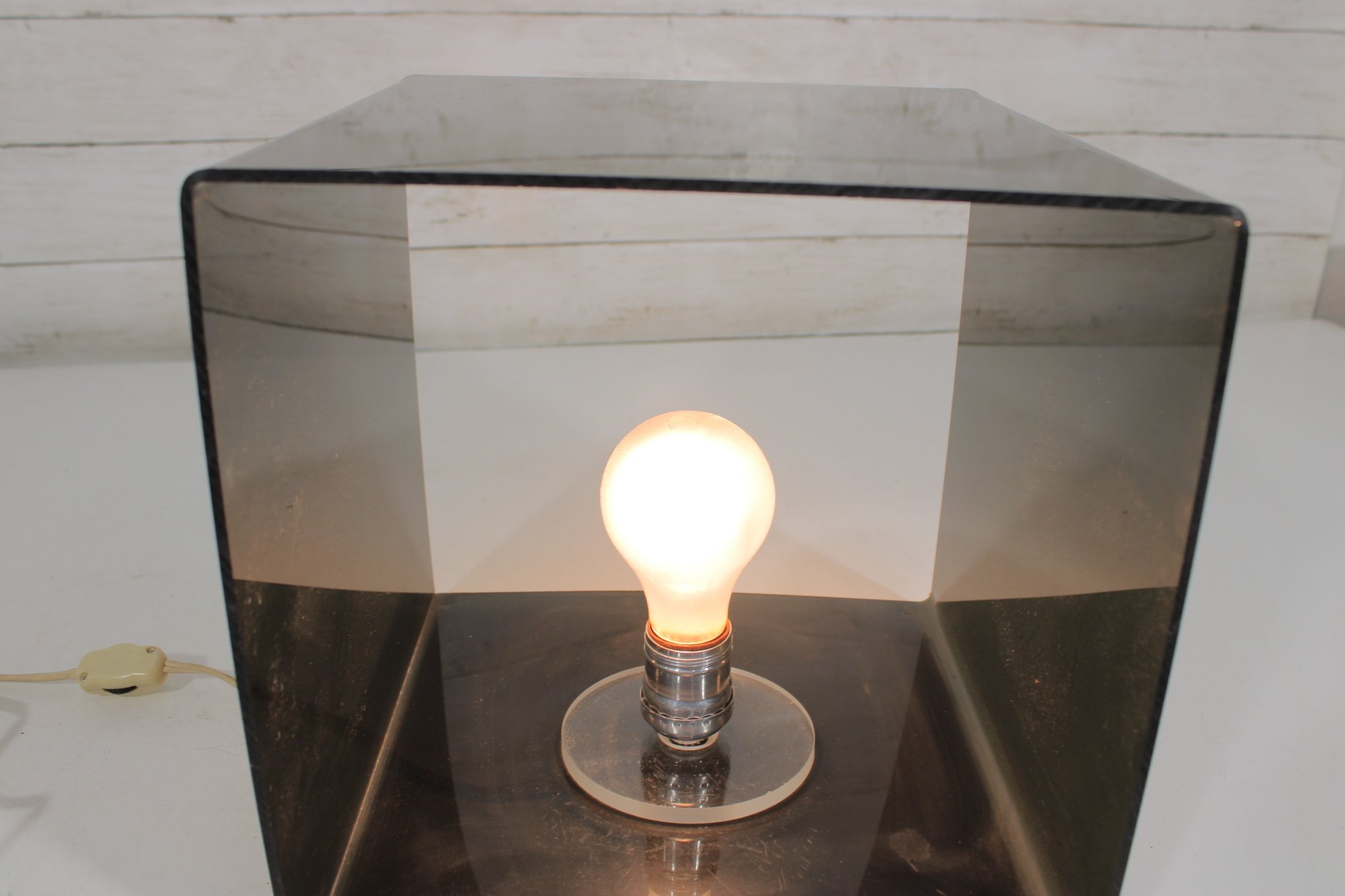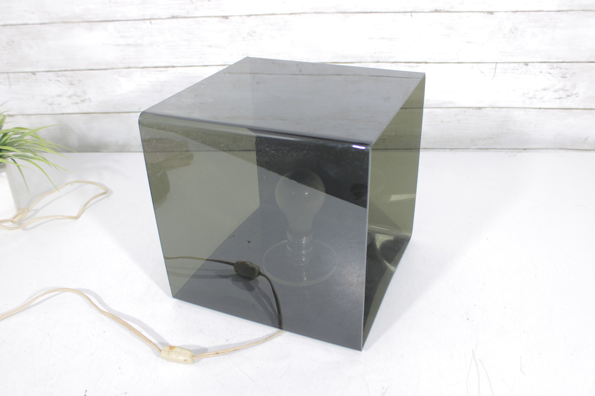 Unique modern cube table lamp featuring a sleek smoked acrylic shade with a minimalist open design. The tinted acrylic panels form a geometric cube that surrounds a single exposed bulb, creating a stylish contemporary look.