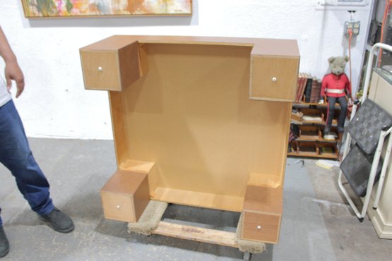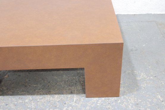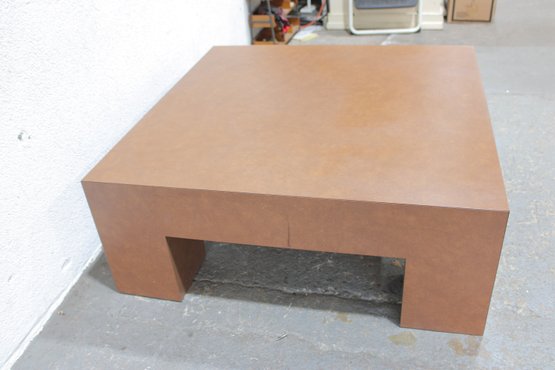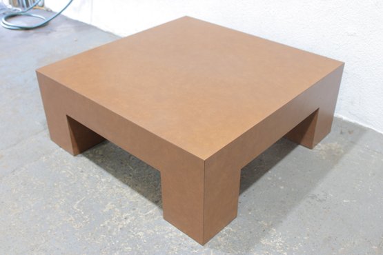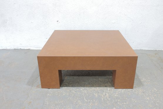 a modern square coffee table featuring a bold, minimalist block design with clean lines and a warm laminate finish. Its low-profile silhouette and substantial form make it a striking centerpiece for any living space.