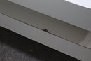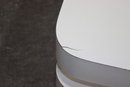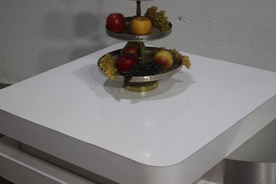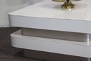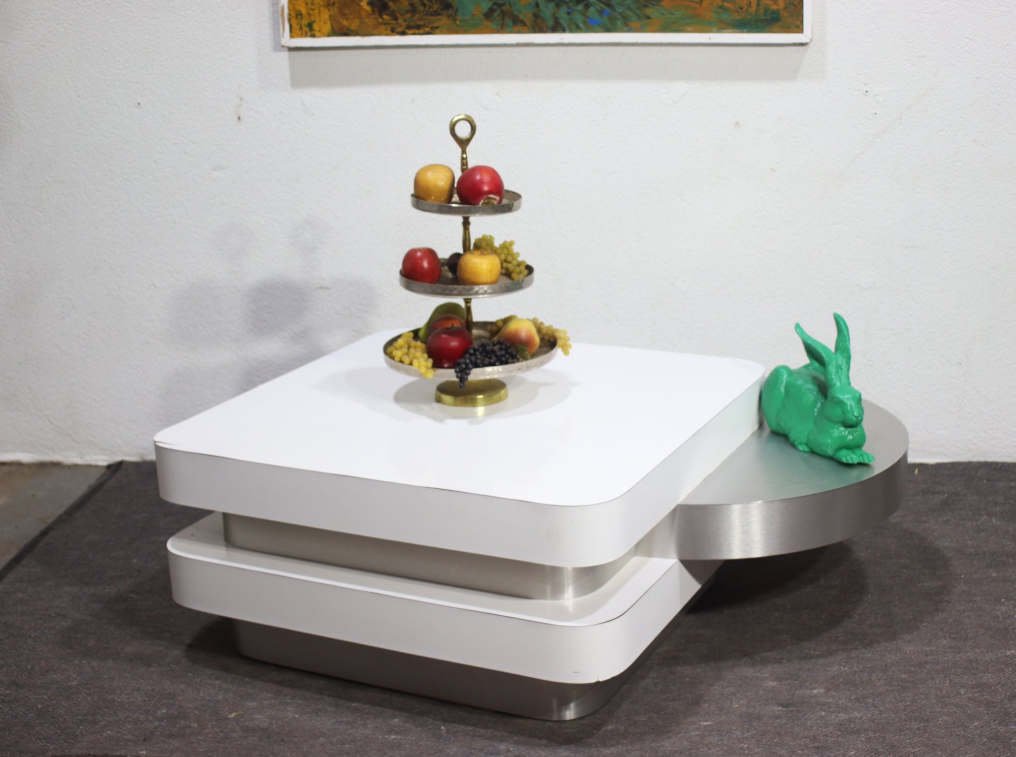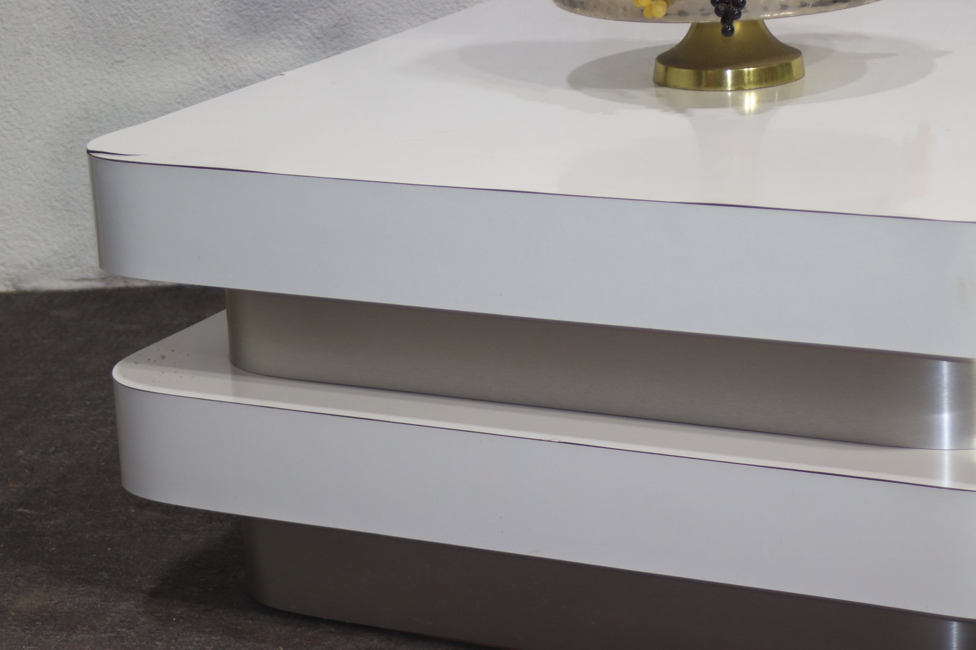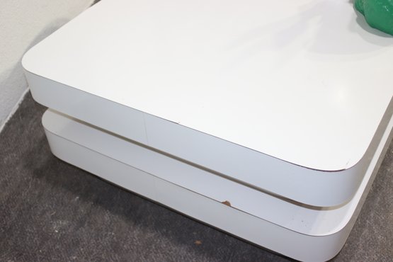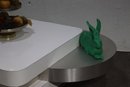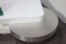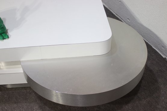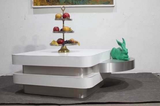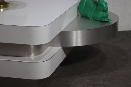 A stunning modern swivel coffee table with a sleek, multi-tiered design featuring white lacquered surfaces and brushed aluminum accents. This sculptural statement piece has rotating stacked layers, allowing for dynamic configurations and extra surface space when needed.