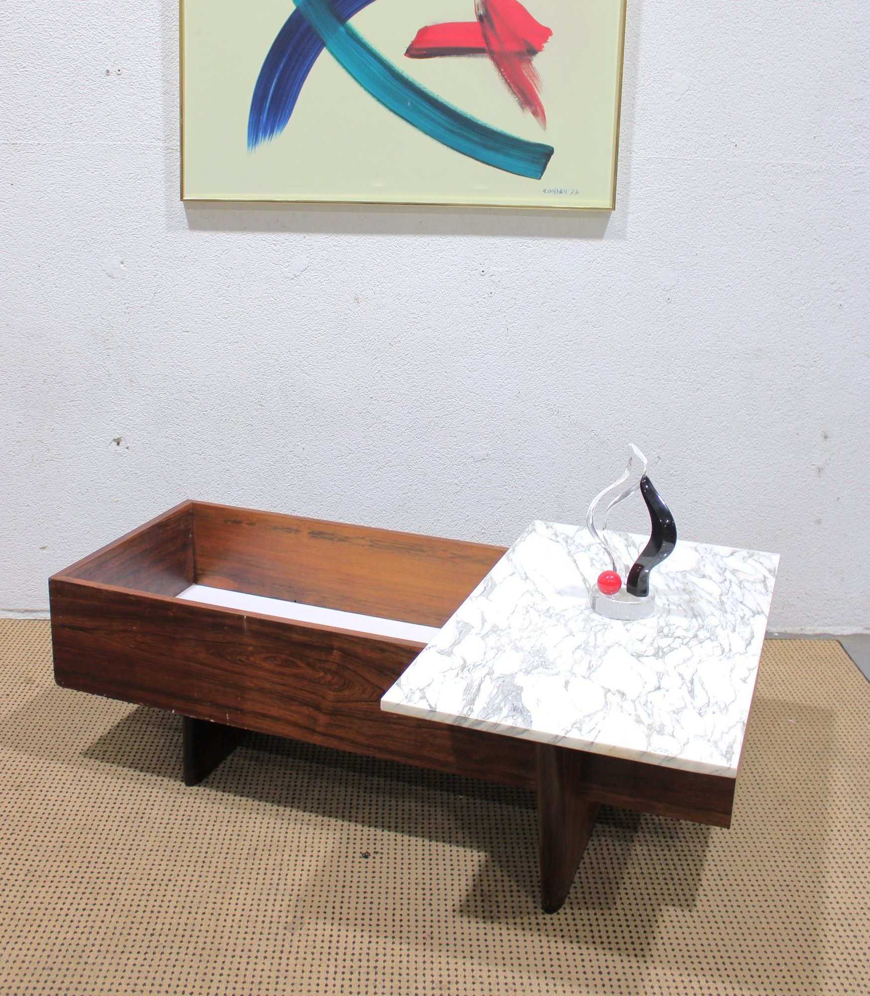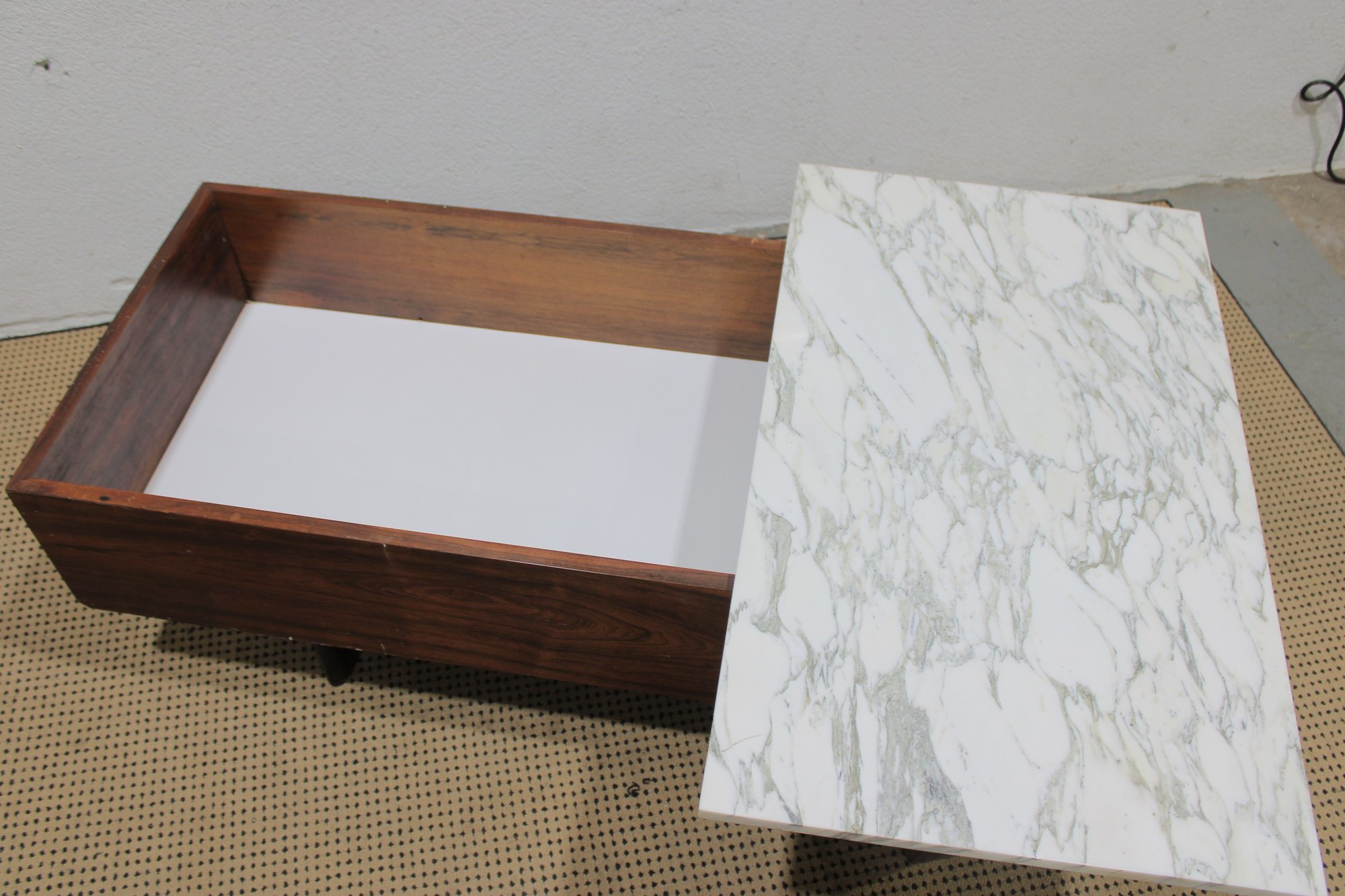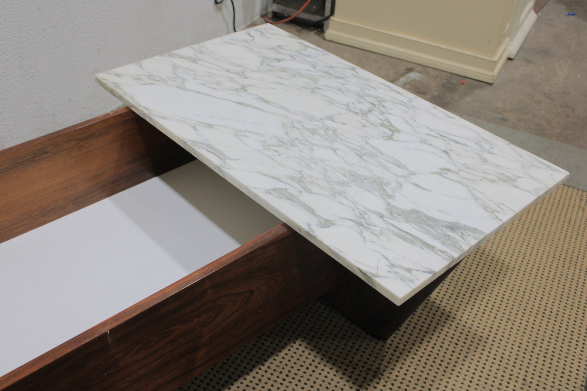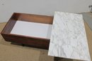 Striking modern coffee table featuring a rich walnut-tone wood base paired with a sleek white marble top. This unique design combines clean architectural lines with functional storage, making it both stylish and practical.
