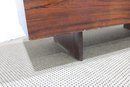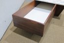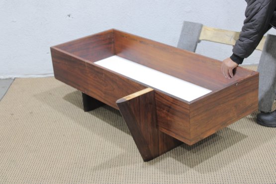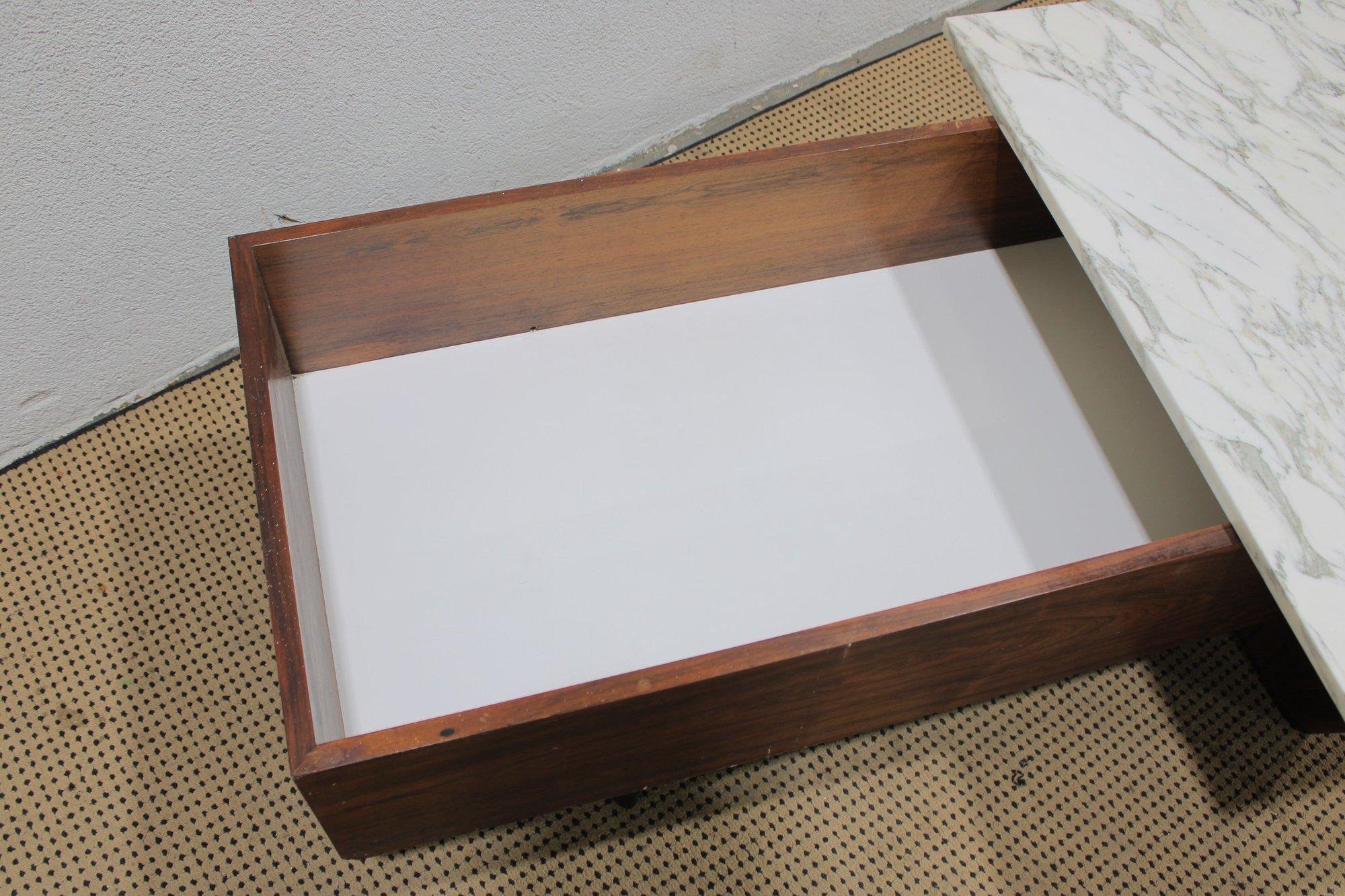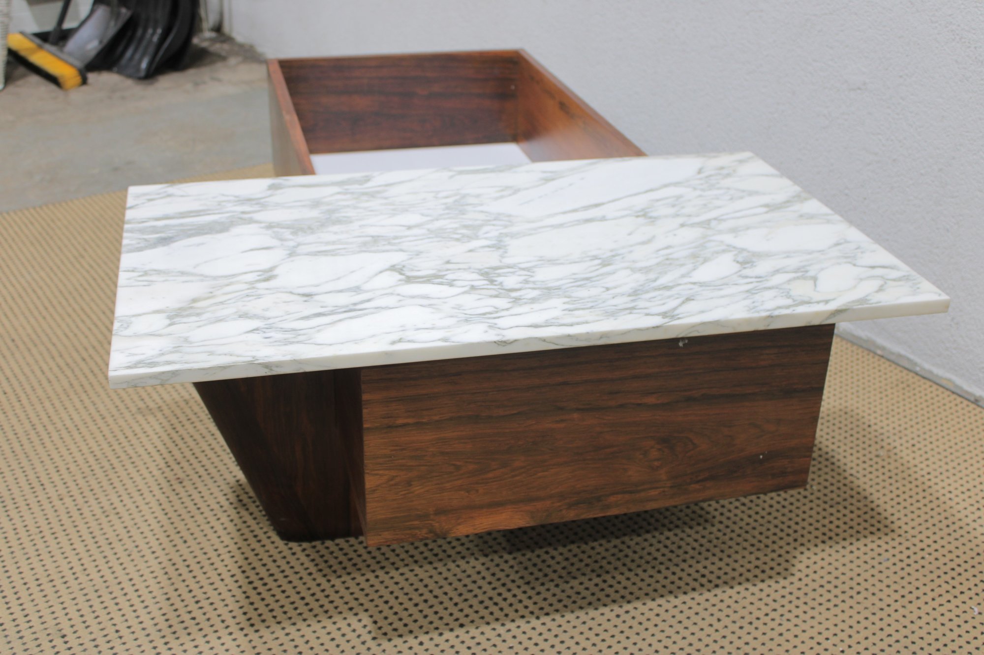 Striking modern coffee table featuring a rich walnut-tone wood base paired with a sleek white marble top. This unique design combines clean architectural lines with functional storage, making it both stylish and practical.