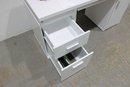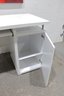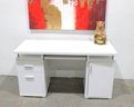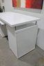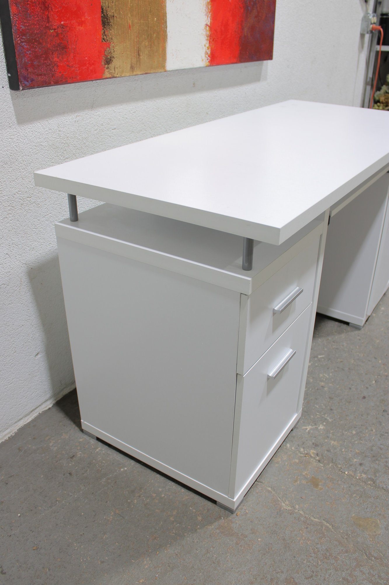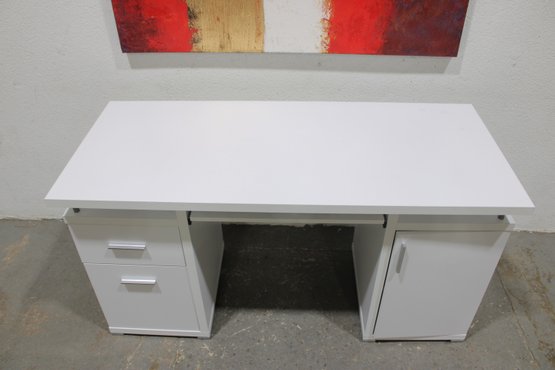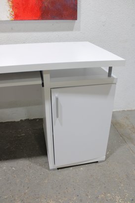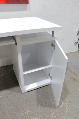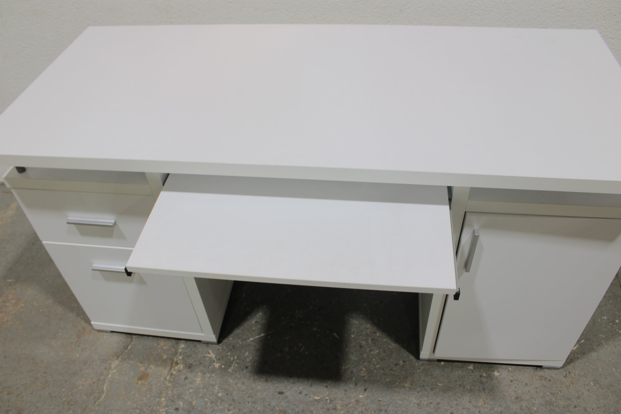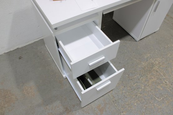 The desk features a spacious work surface with a sleek, minimalist design. On the left side, there is a two-drawer unit ideal for organizing office supplies or documents. On the right side, a cabinet with an interior shelf provides additional enclosed storage, perfect for larger items or equipment.
