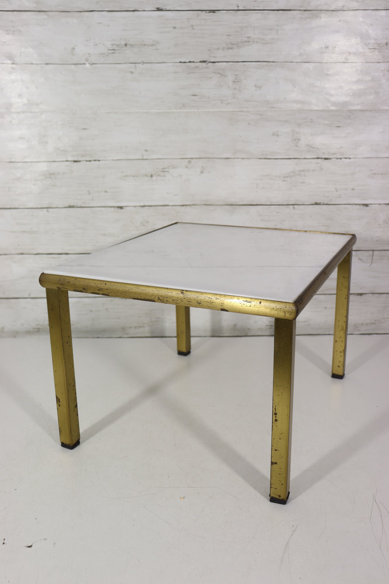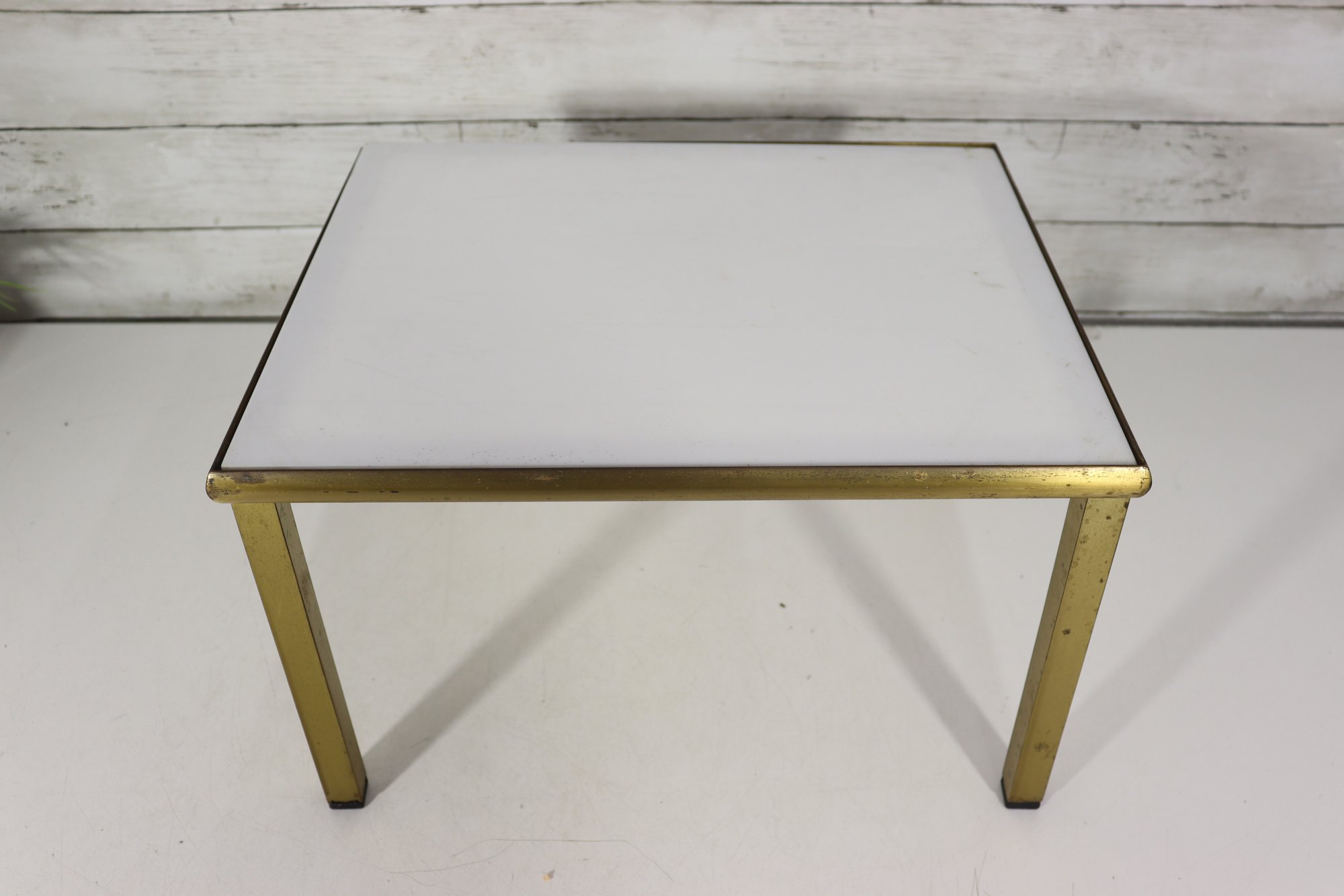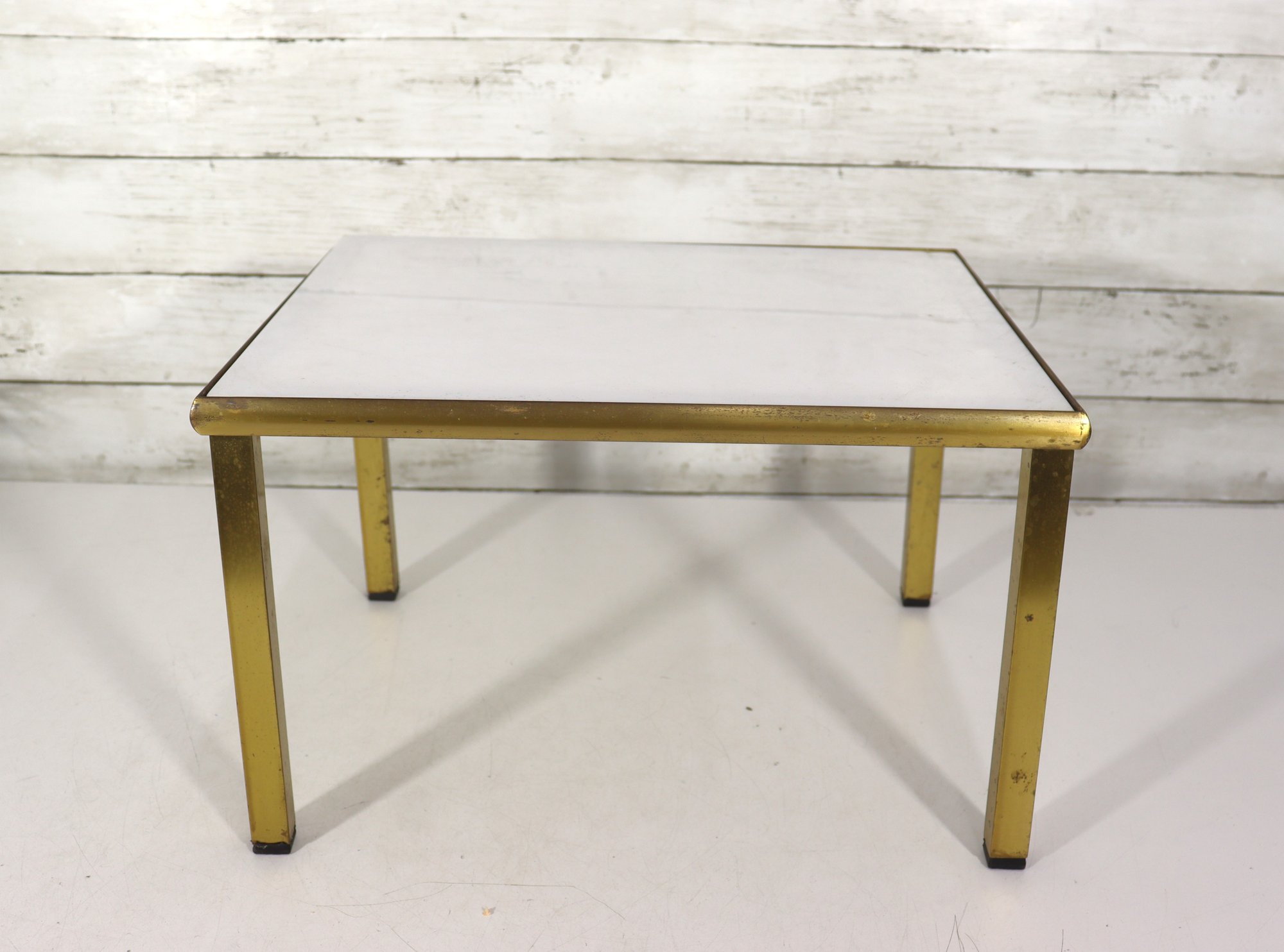 The table’s compact size makes it ideal as a side table, accent table, or low display table next to seating or at the end of a sofa. The brass-tone frame provides warm contrast against the crisp white surface, allowing it to blend easily with a variety of décor styles.