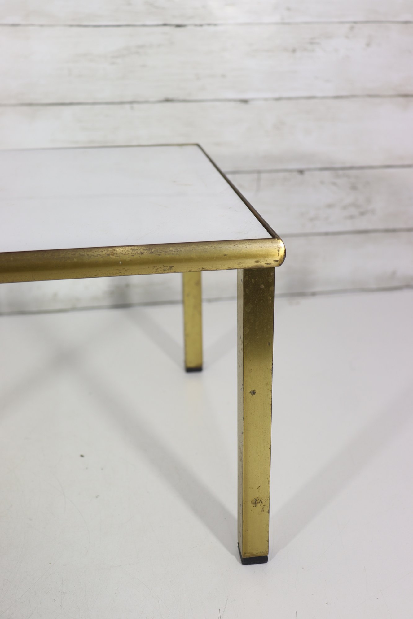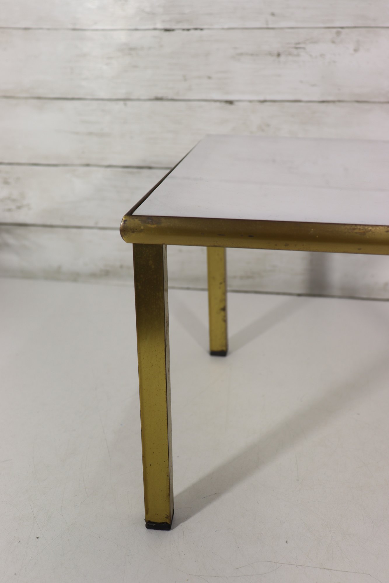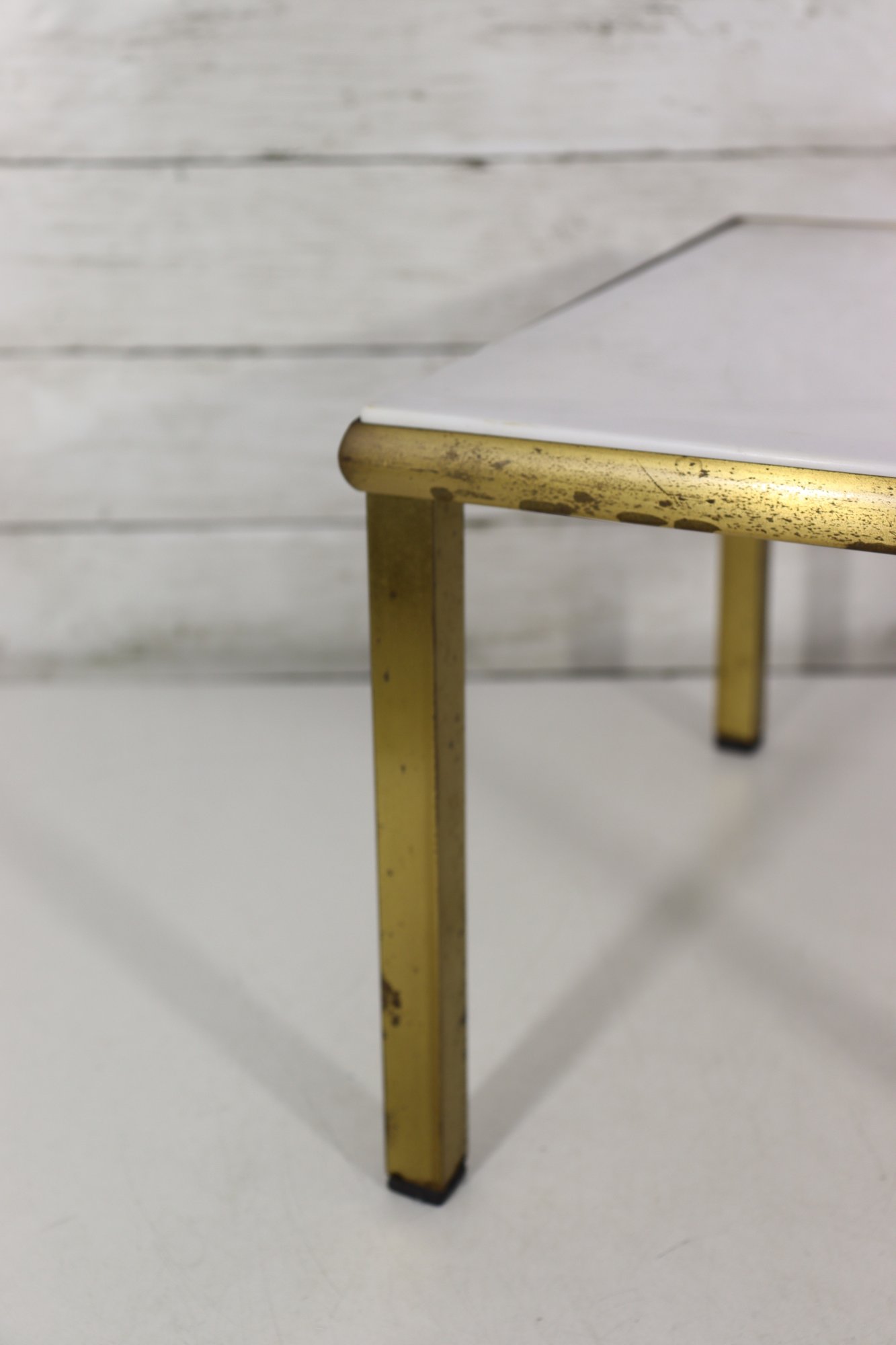 The table’s compact size makes it ideal as a side table, accent table, or low display table next to seating or at the end of a sofa. The brass-tone frame provides warm contrast against the crisp white surface, allowing it to blend easily with a variety of décor styles.