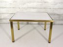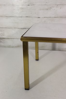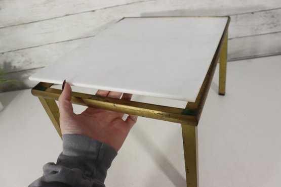 a sleek modern side table featuring a white rectangular top paired with a brass-tone metal frame and legs. The clean lines and simple form give this piece a timeless, mid-century–inspired look that works well in modern, contemporary, or minimalist interiors.