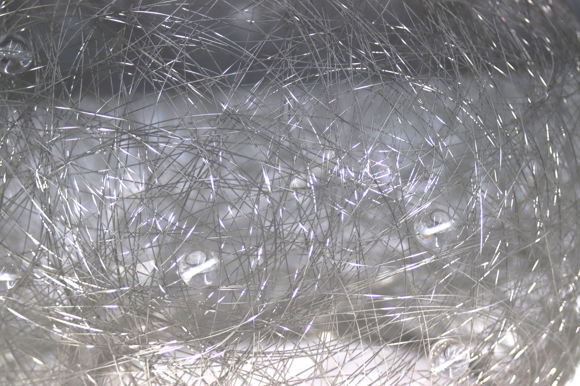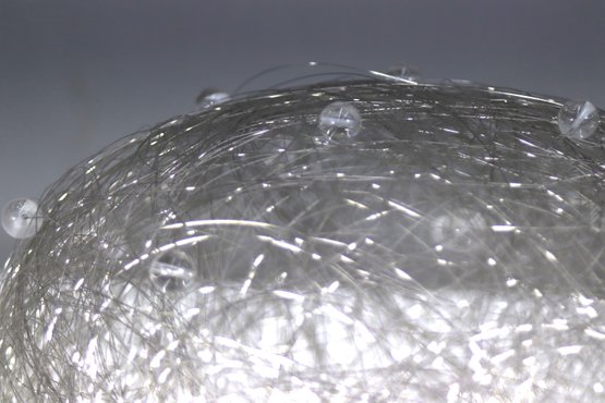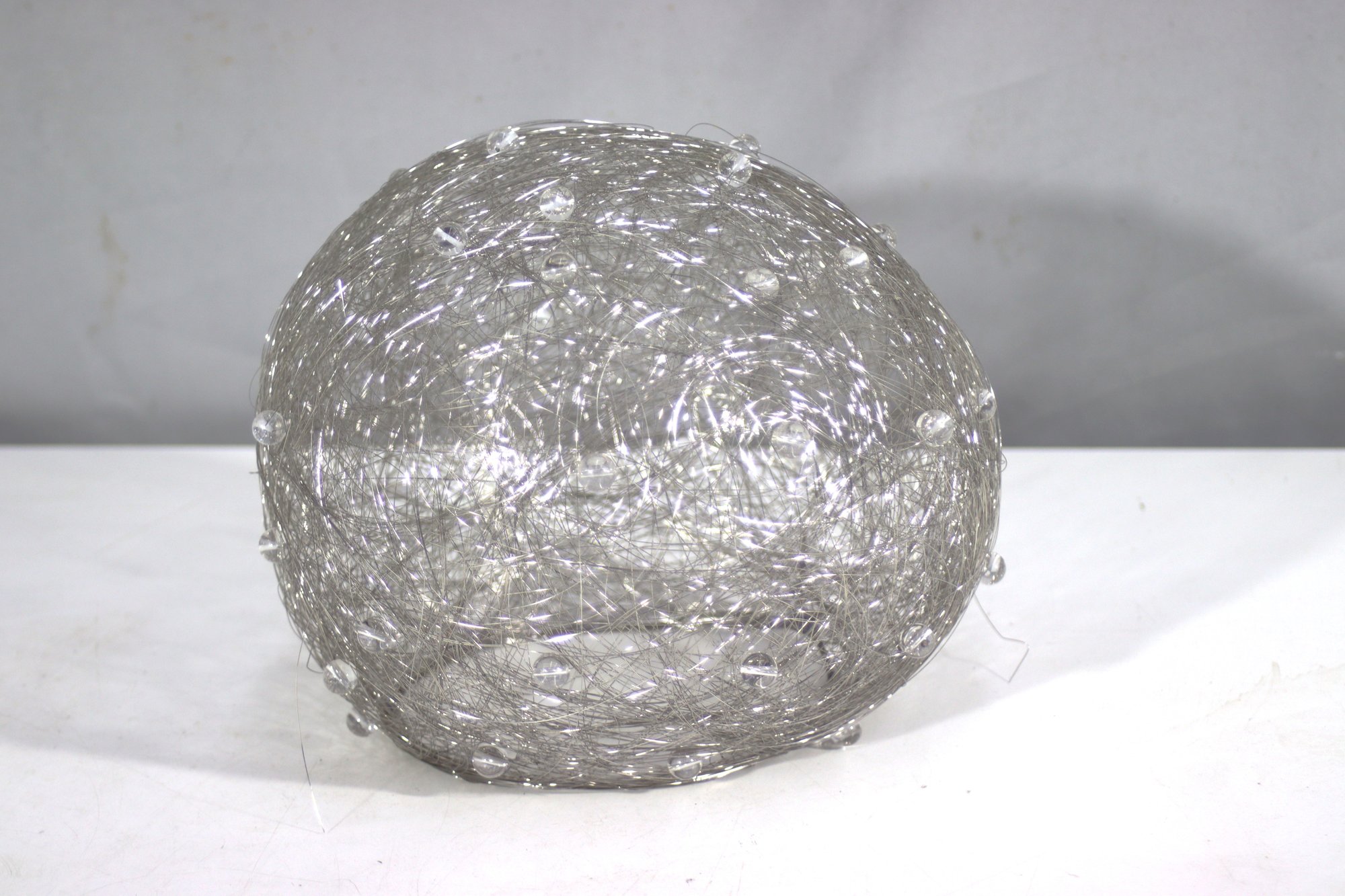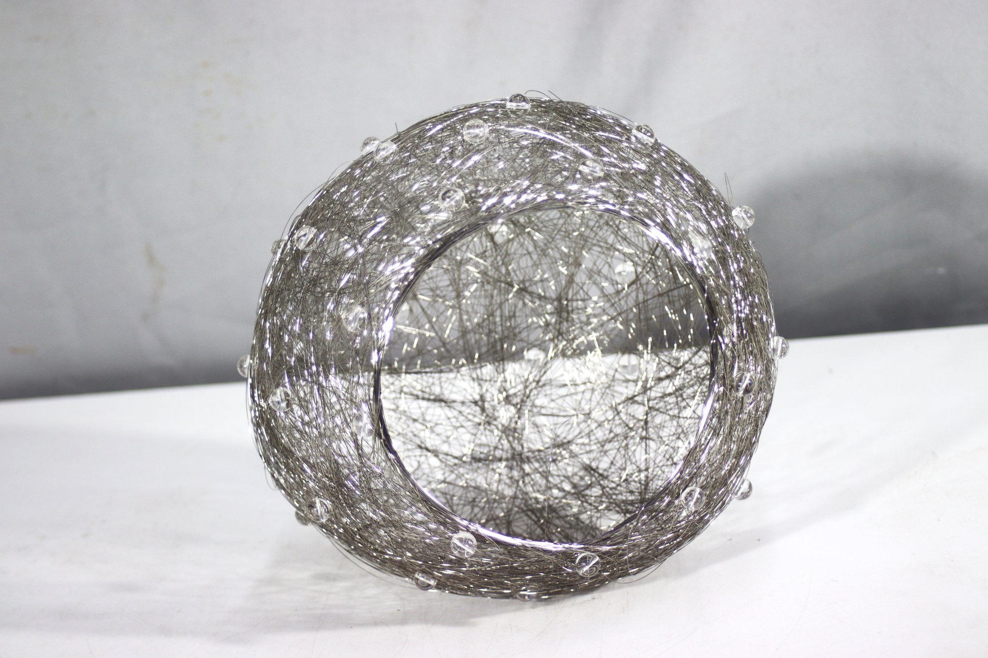 This stunning modern wire and bead lamp shade is a one-of-a-kind decorative lighting piece, perfect for adding a touch of contemporary style to any space. The design features intricately woven silver-tone wire strands, accented with clear bead embellishments, creating a shimmering effect when illuminated.