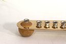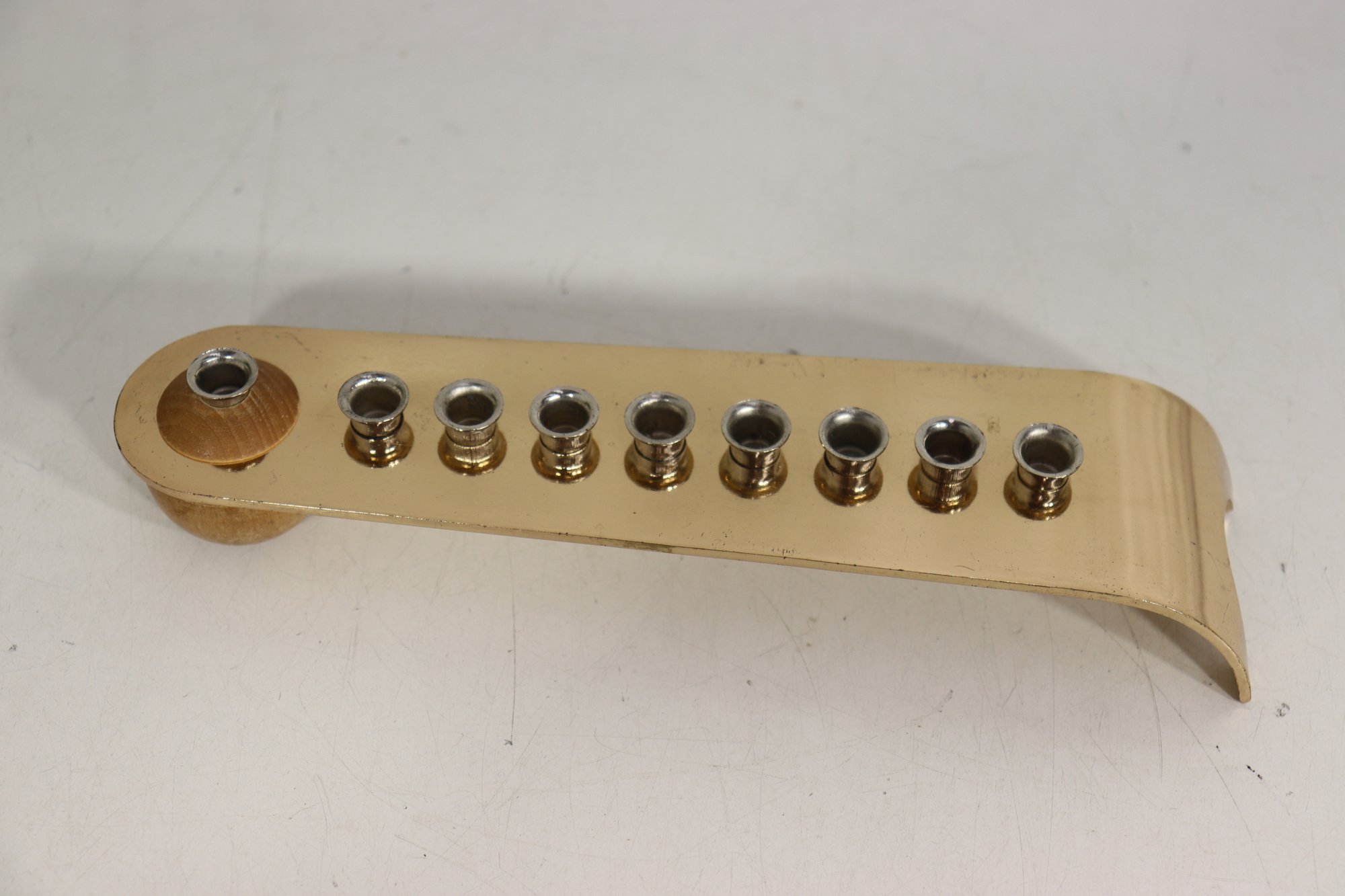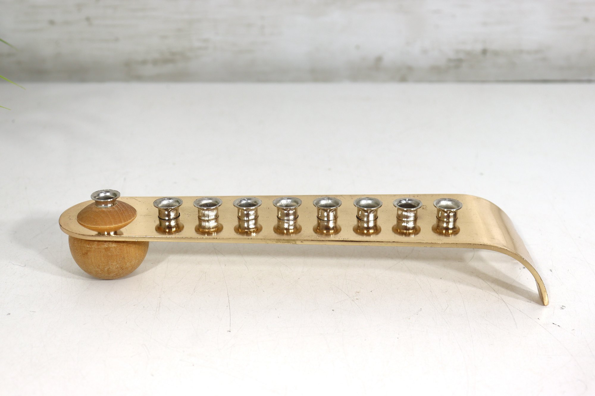 a modern-style Hanukkah menorah crafted from light-toned wood with metal candle cups. The elongated, gently curved form creates a clean, minimalist look, while the raised shamash holder is positioned at one end in traditional fashion.