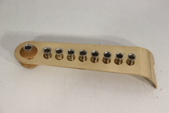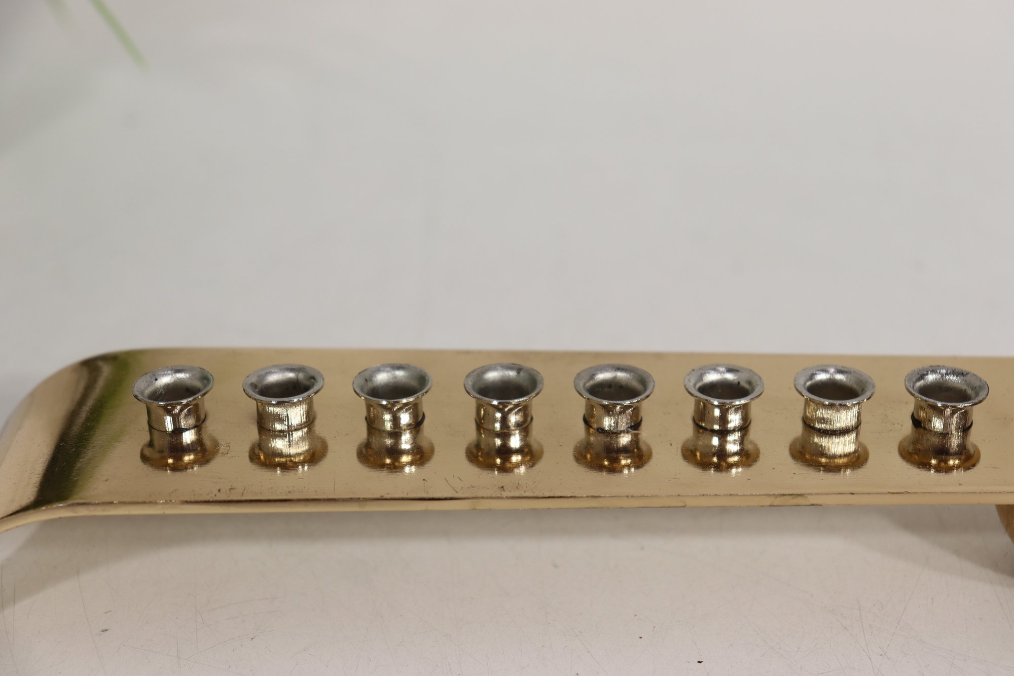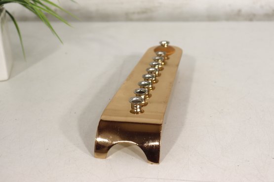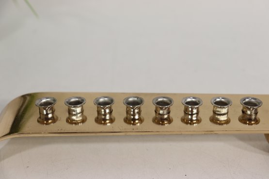 The menorah holds eight candles plus the shamash, with evenly spaced metal inserts designed to hold standard Hanukkah candles securely. Its contemporary design makes it a striking and functional piece for modern or traditional Judaica displays.