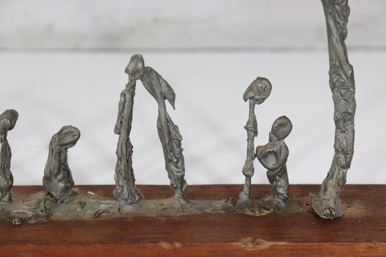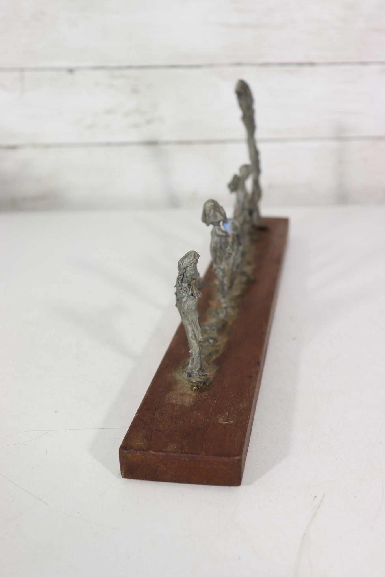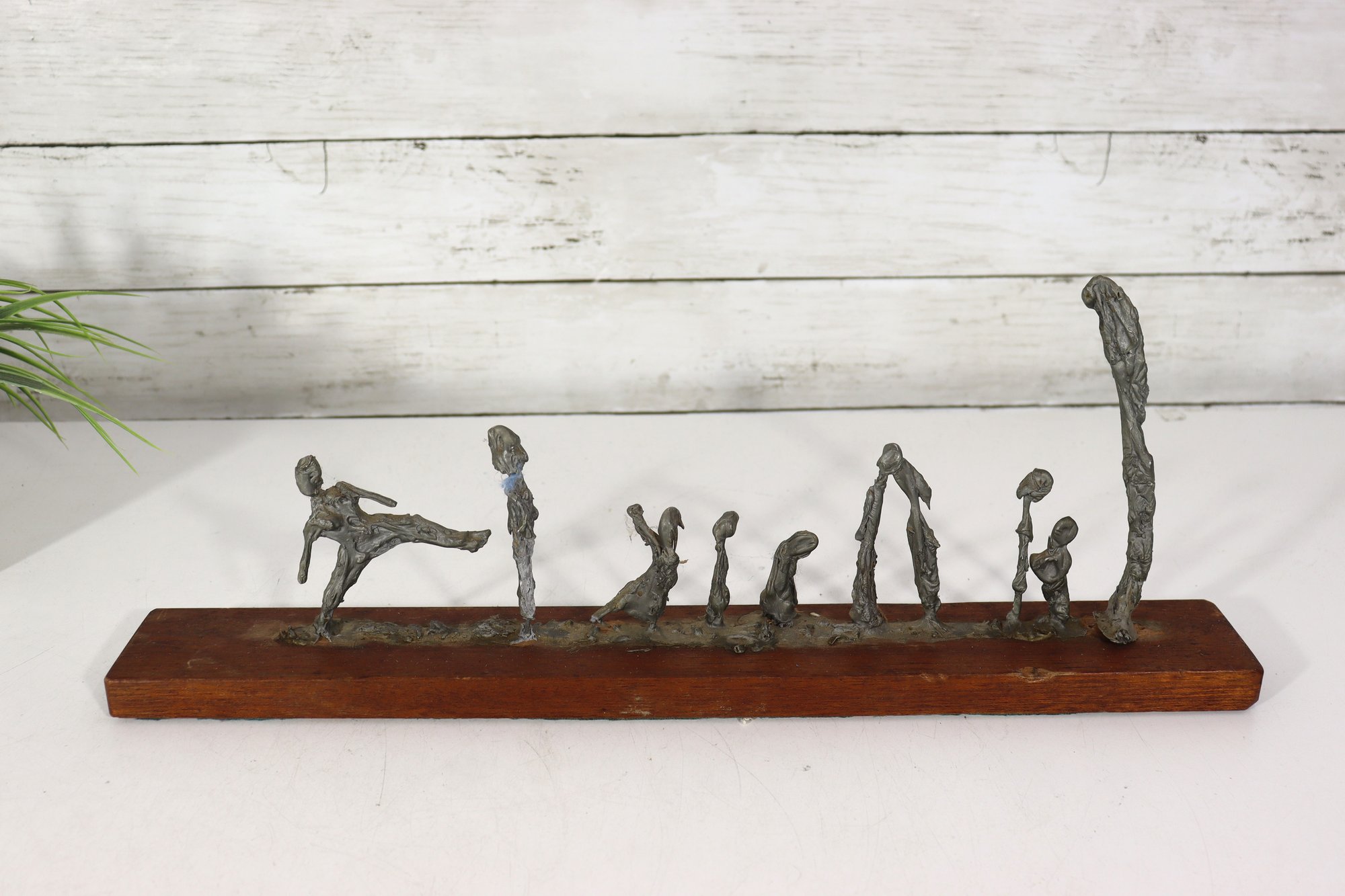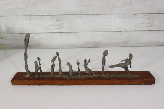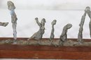a modernist abstract figural sculpture composed of multiple stylized cast metal figures mounted on a long wooden base. The figures are rendered in an expressive, elongated style, each posed in a different gesture or stance, creating a dynamic visual narrative across the length of the piece.