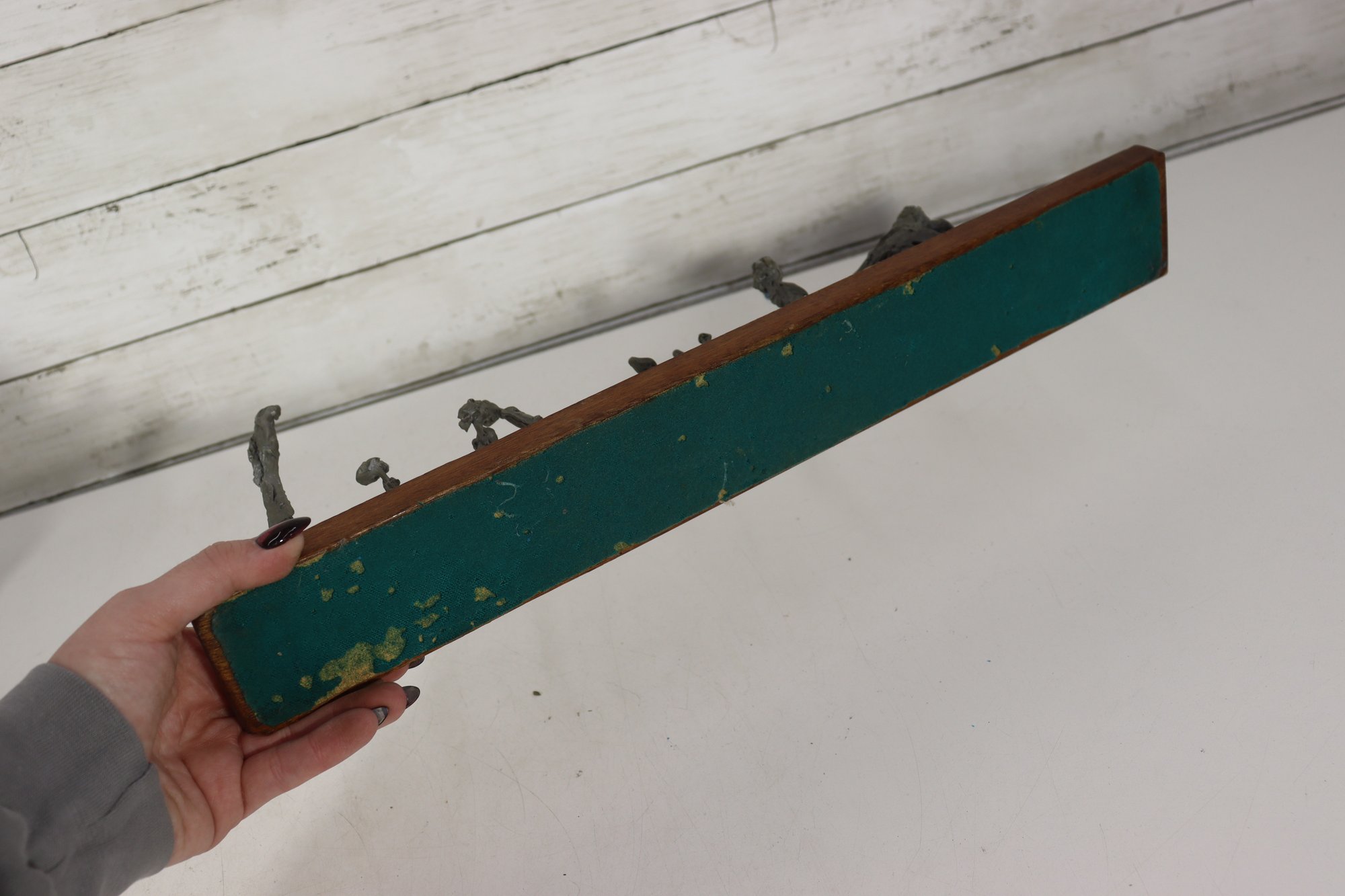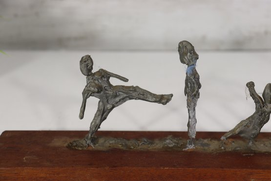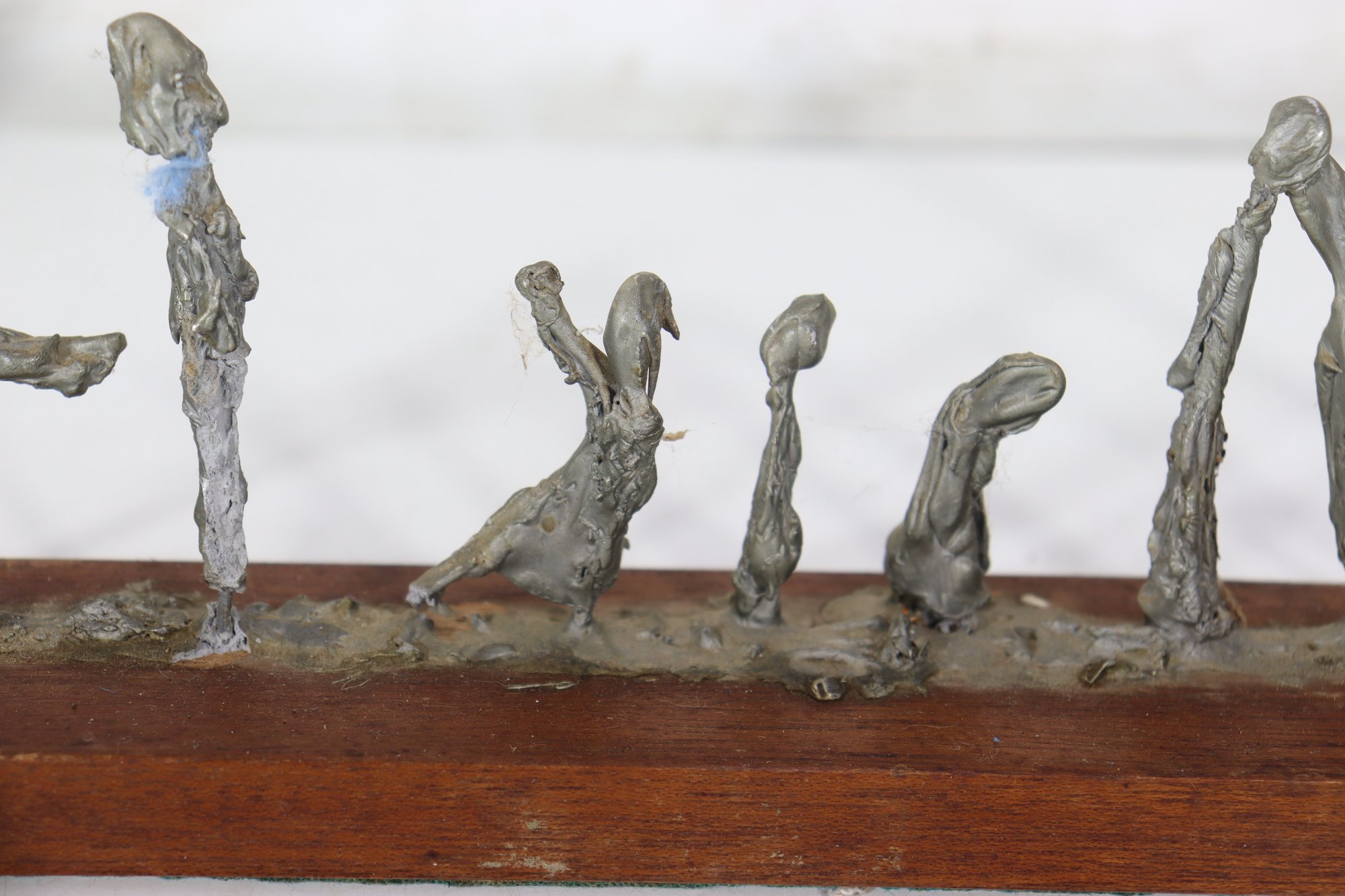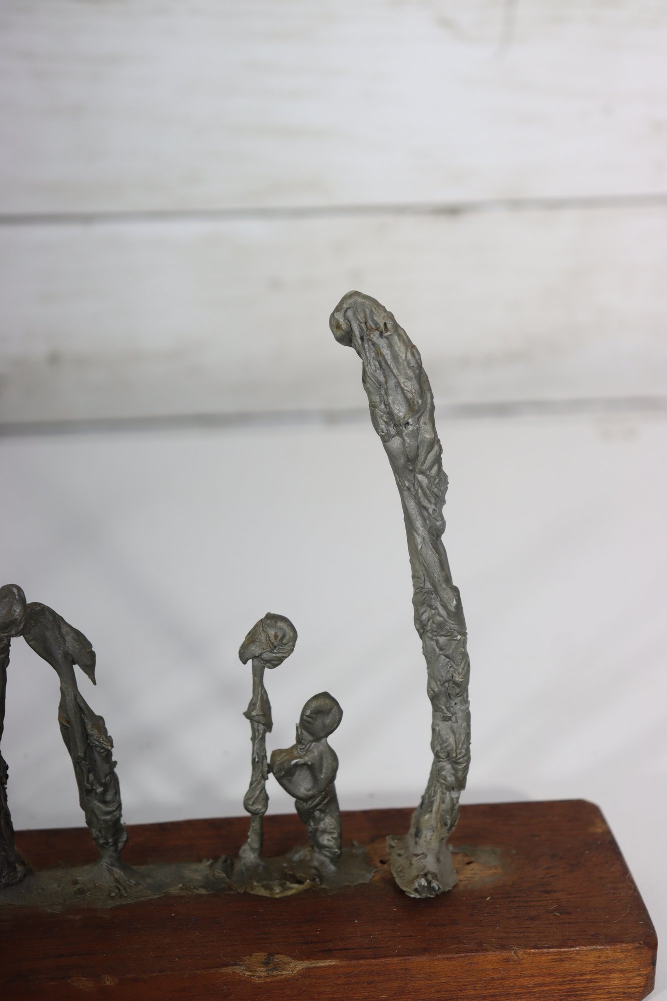 a modernist abstract figural sculpture composed of multiple stylized cast metal figures mounted on a long wooden base. The figures are rendered in an expressive, elongated style, each posed in a different gesture or stance, creating a dynamic visual narrative across the length of the piece.