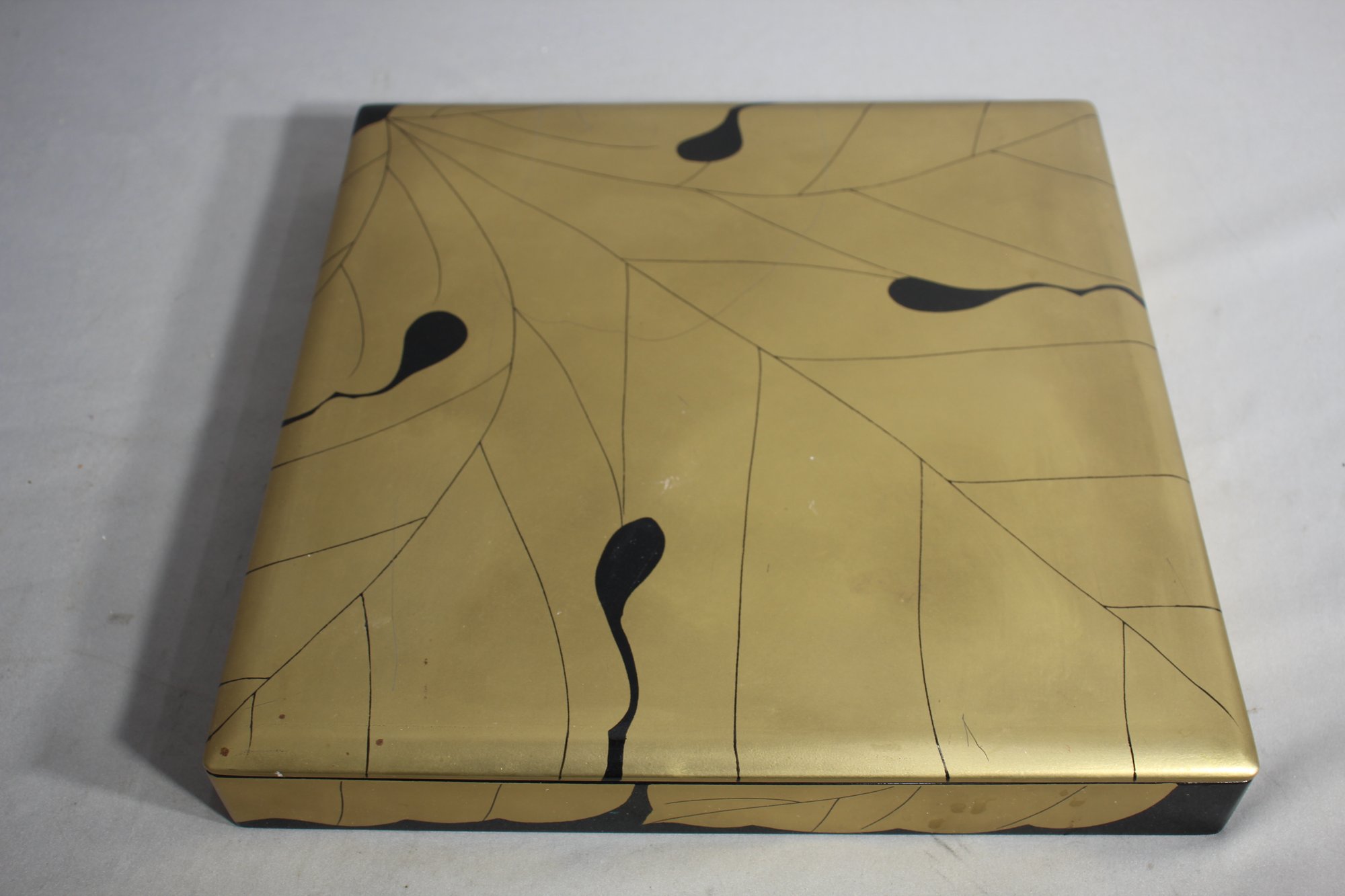 Measuring approximately 2"x14"x14, this lacquer box boasts a spacious interior perfect for safeguarding your cherished keepsakes, jewelry, or important mementos. Its abstract design, characterized by stark black accents against a gleaming golden background, plays a mesmerizing visual symphony that will captivate any observer.
