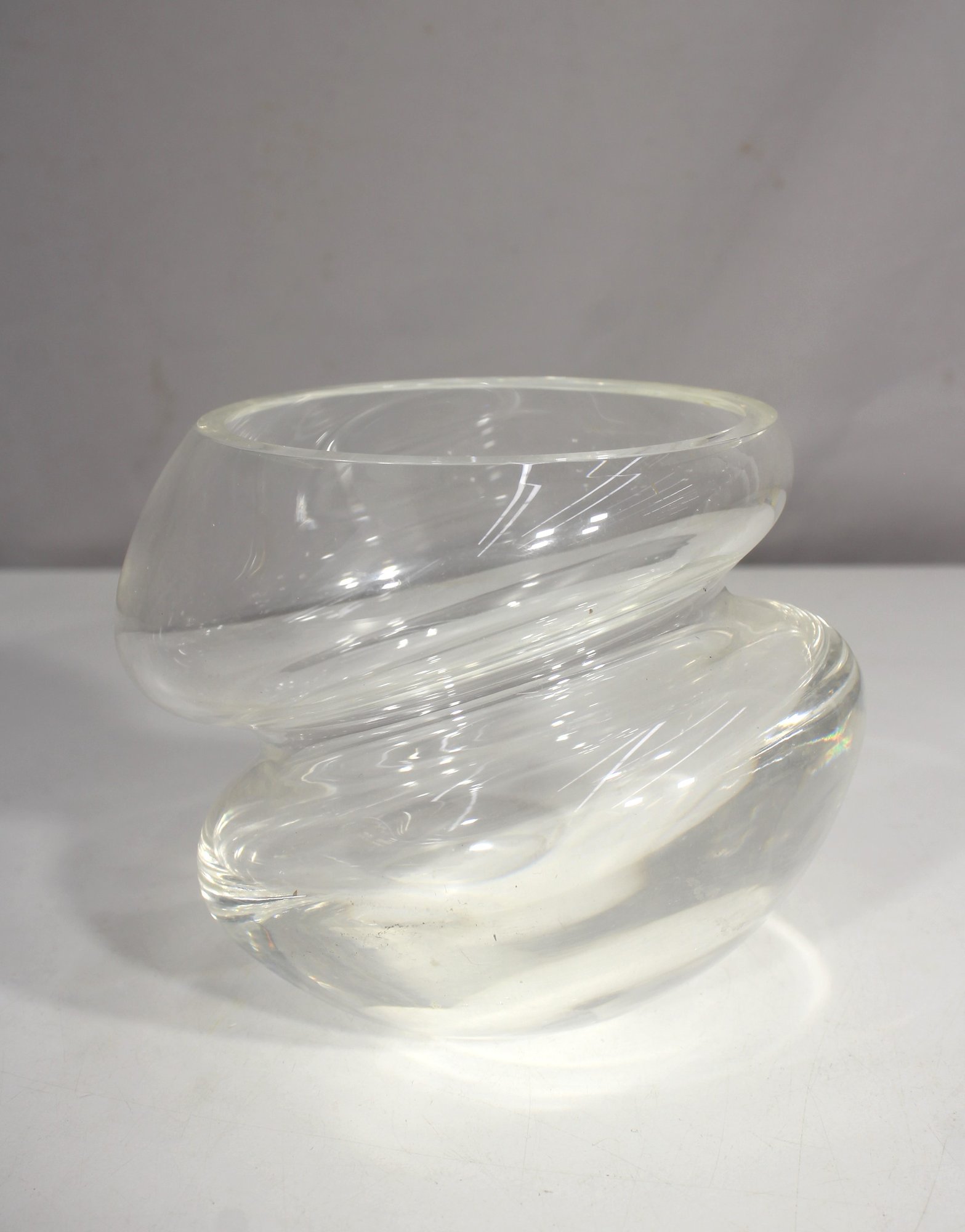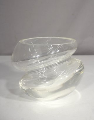 Add a striking statement piece to your glass collection with this hand-blown modernist clear art glass vase, featuring a bold twisted form and fluid organic lines. Standing approximately 5.5 inches tall, the piece showcases exceptional clarity and balance, with sculptural curves that give it a dynamic, almost kinetic appearance.