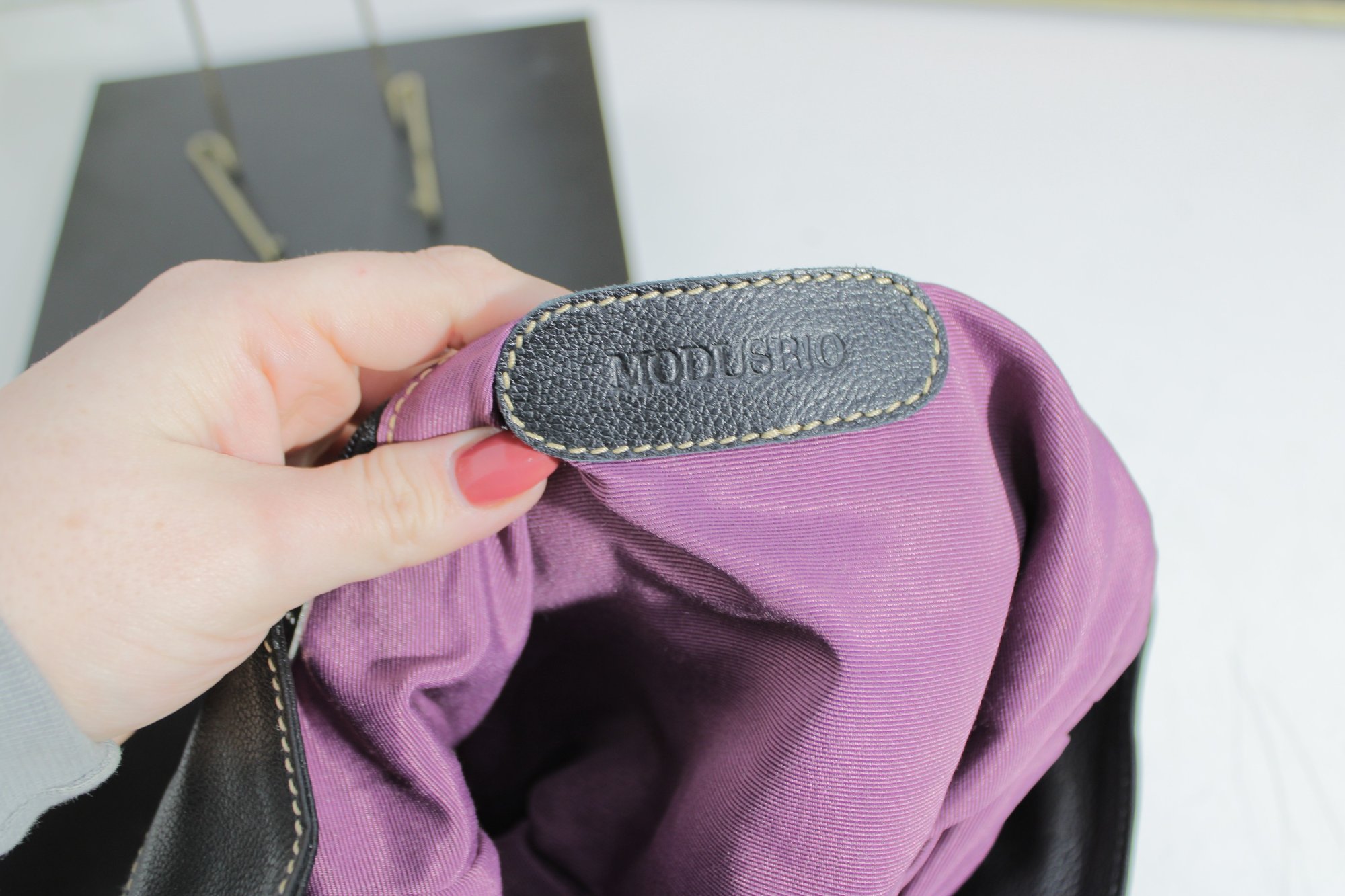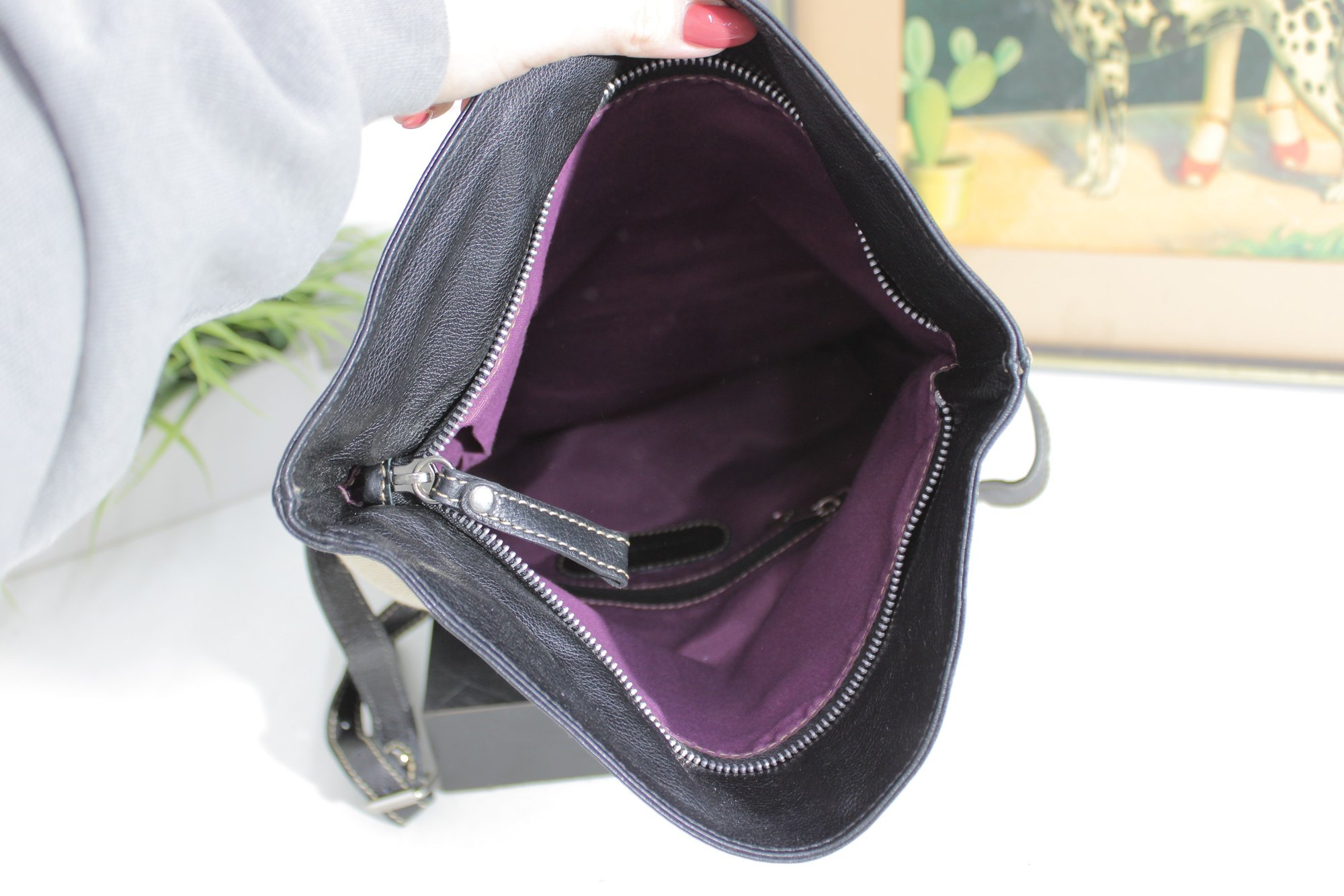 The front features a horizontal zip pocket for easy access, while the top opens wide to a fully lined interior in rich purple fabric with ample room for daily essentials. Adjustable shoulder strap allows for comfortable crossbody or shoulder wear. Clean lines, quality materials, and a neutral palette make this bag endlessly versatile for everyday or travel use.