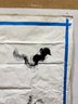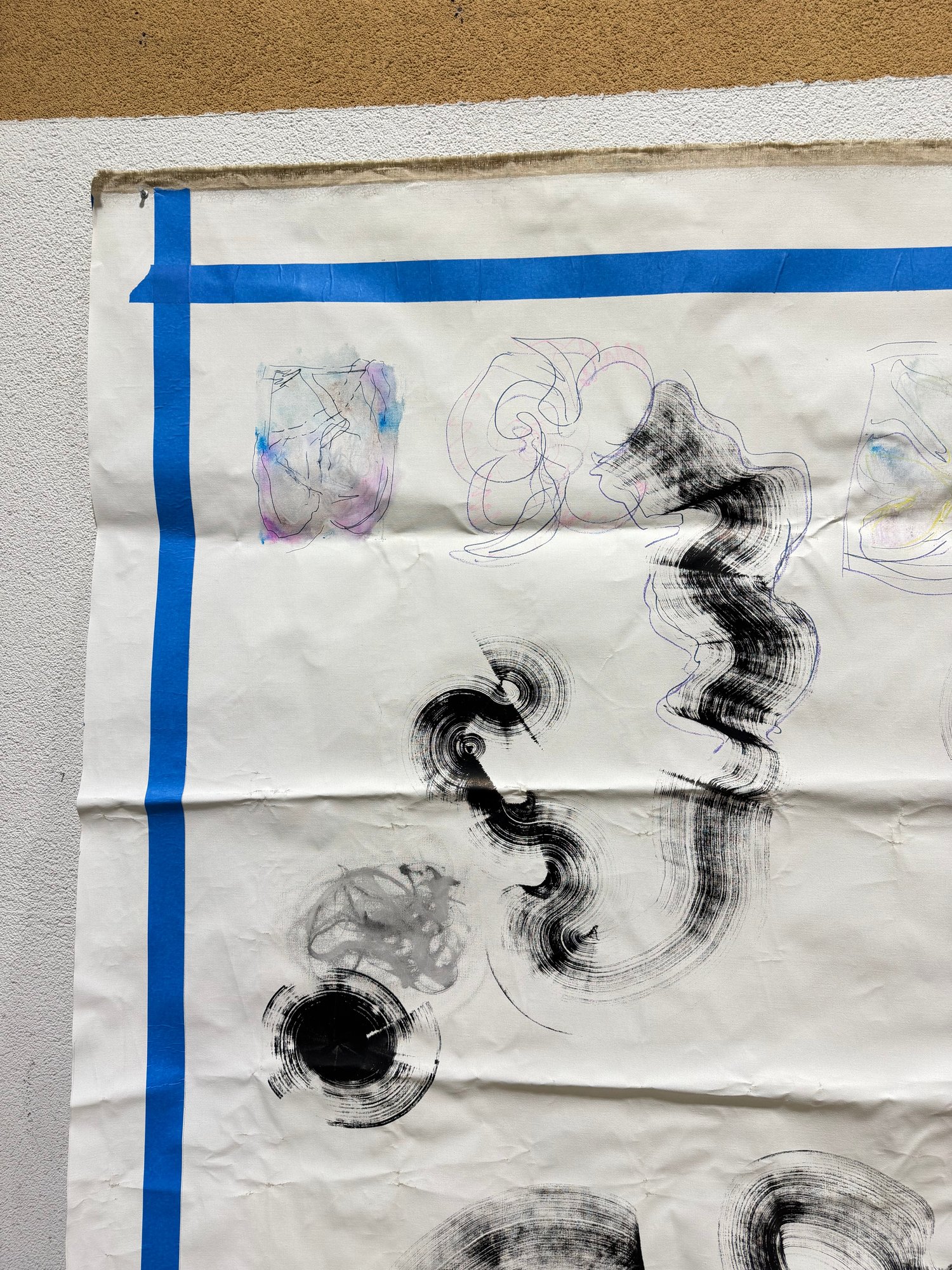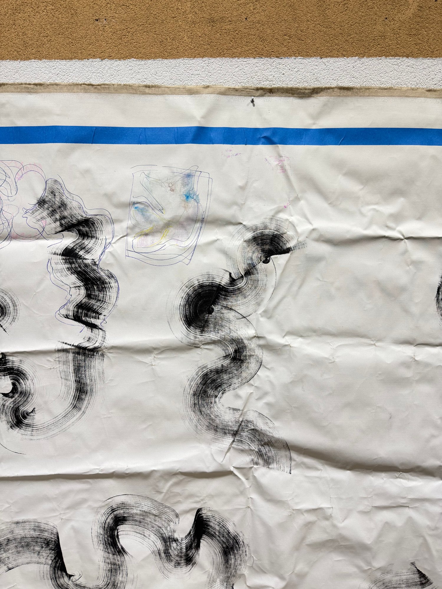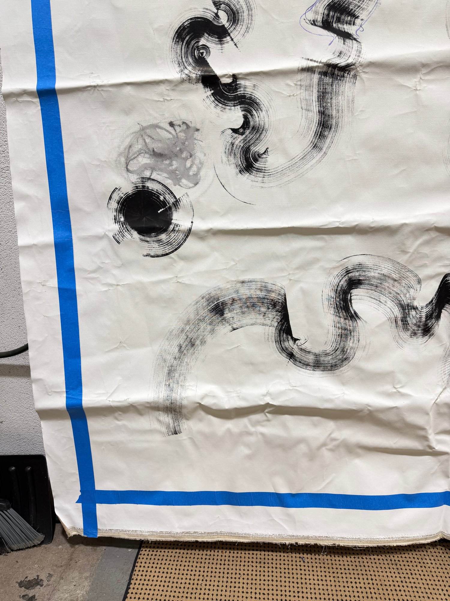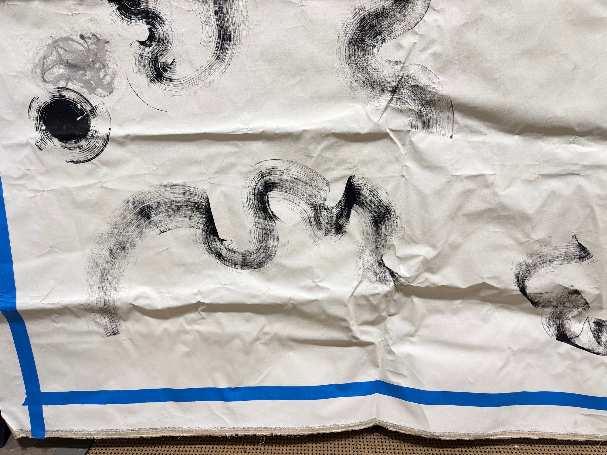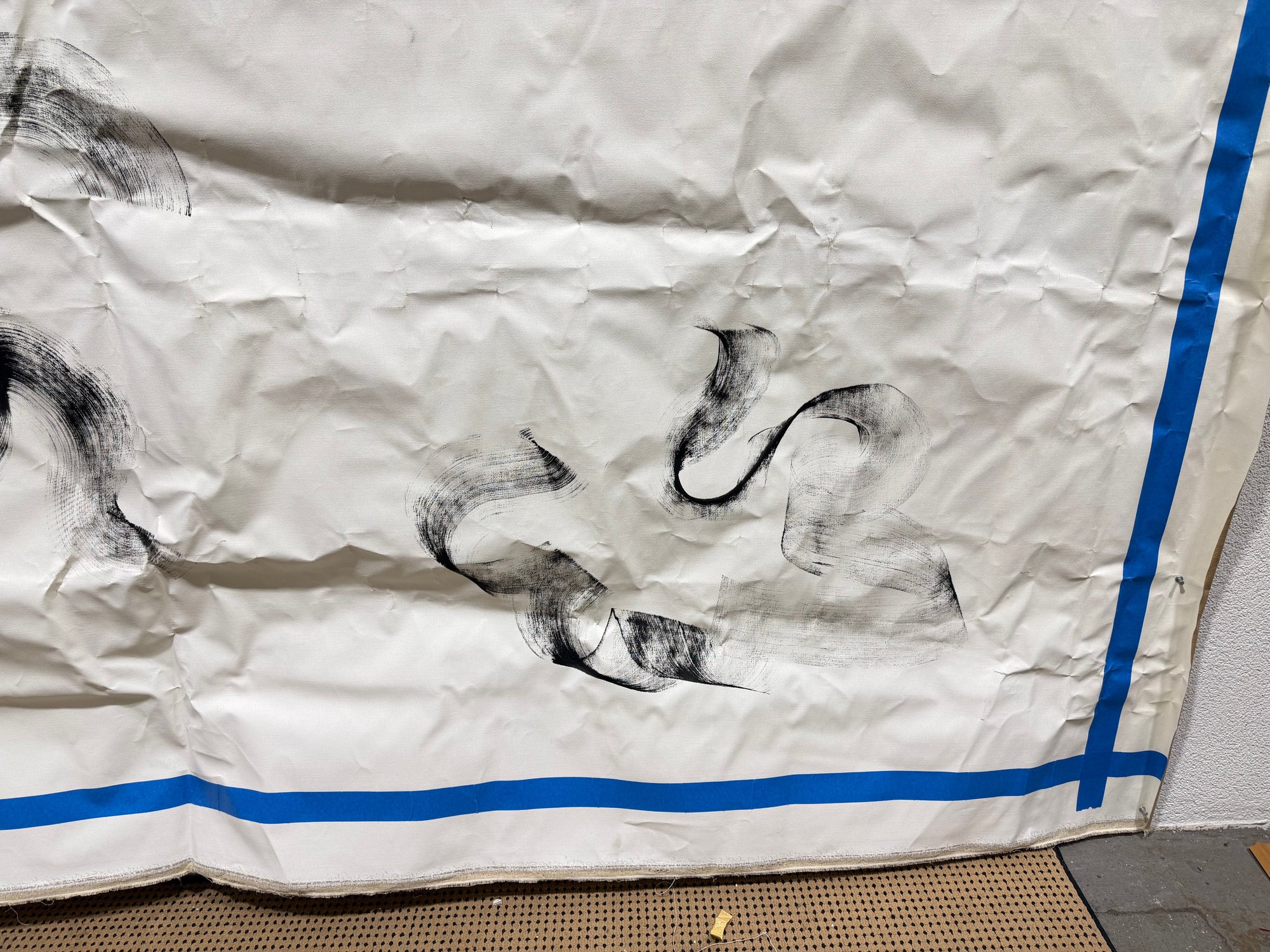 This piece appears to have originated as a studio drop cloth or working canvas, transformed through expressive mark-making into a compelling work of contemporary art. The blue taped border frames the composition, emphasizing its scale and giving it a striking, graphic edge.