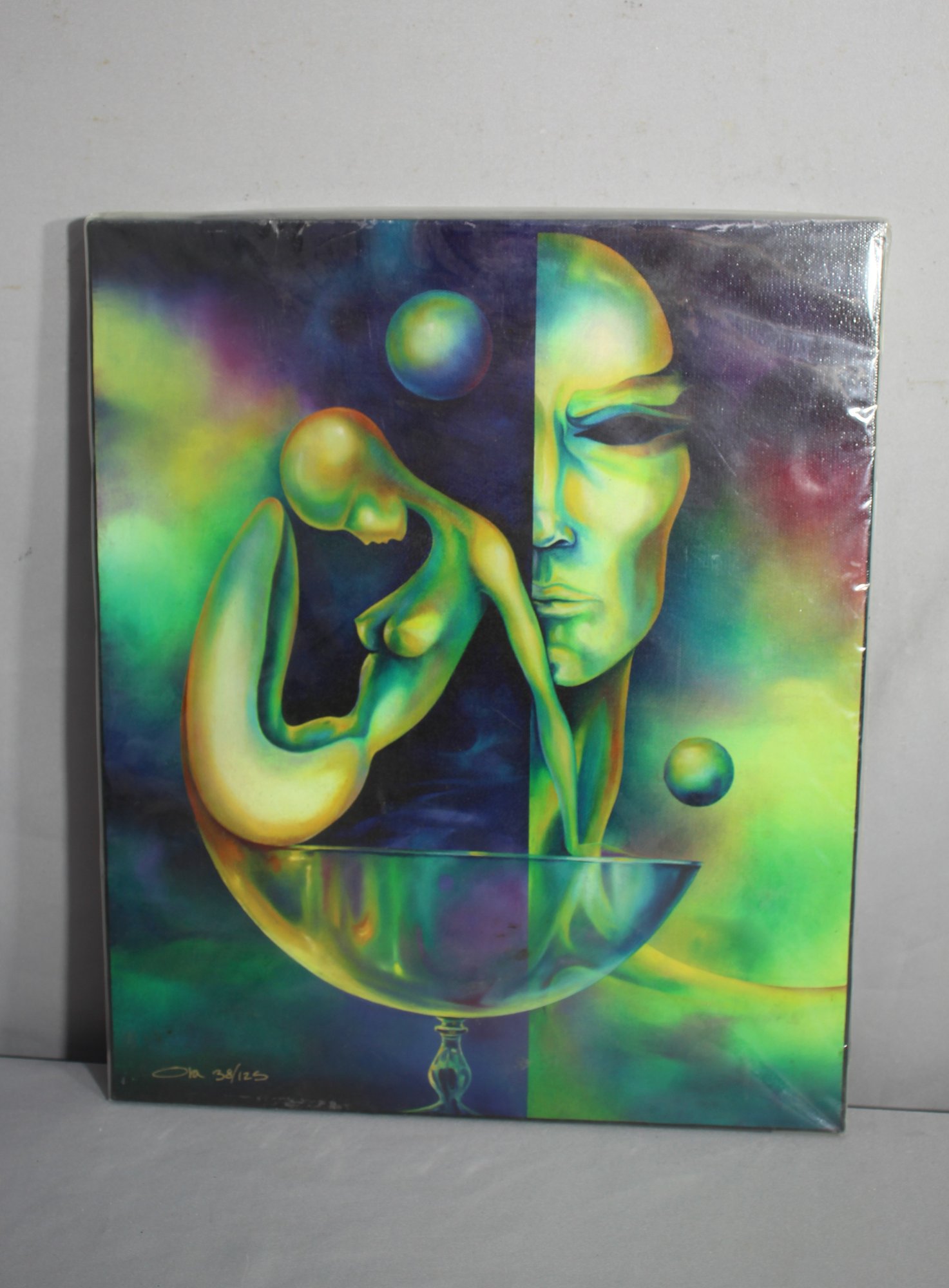 The artwork features an ethereal composition of human-like figures and celestial spheres set against a backdrop of swirling, iridescent colors. Central to the piece is a split image, where one side of a face aligns with a figure cradling another, suggesting themes of reflection, connection, or duality. The painting's luminous color palette, using greens, blues, and yellows, adds a dreamlike quality, hinting at otherworldly or spiritual narratives.