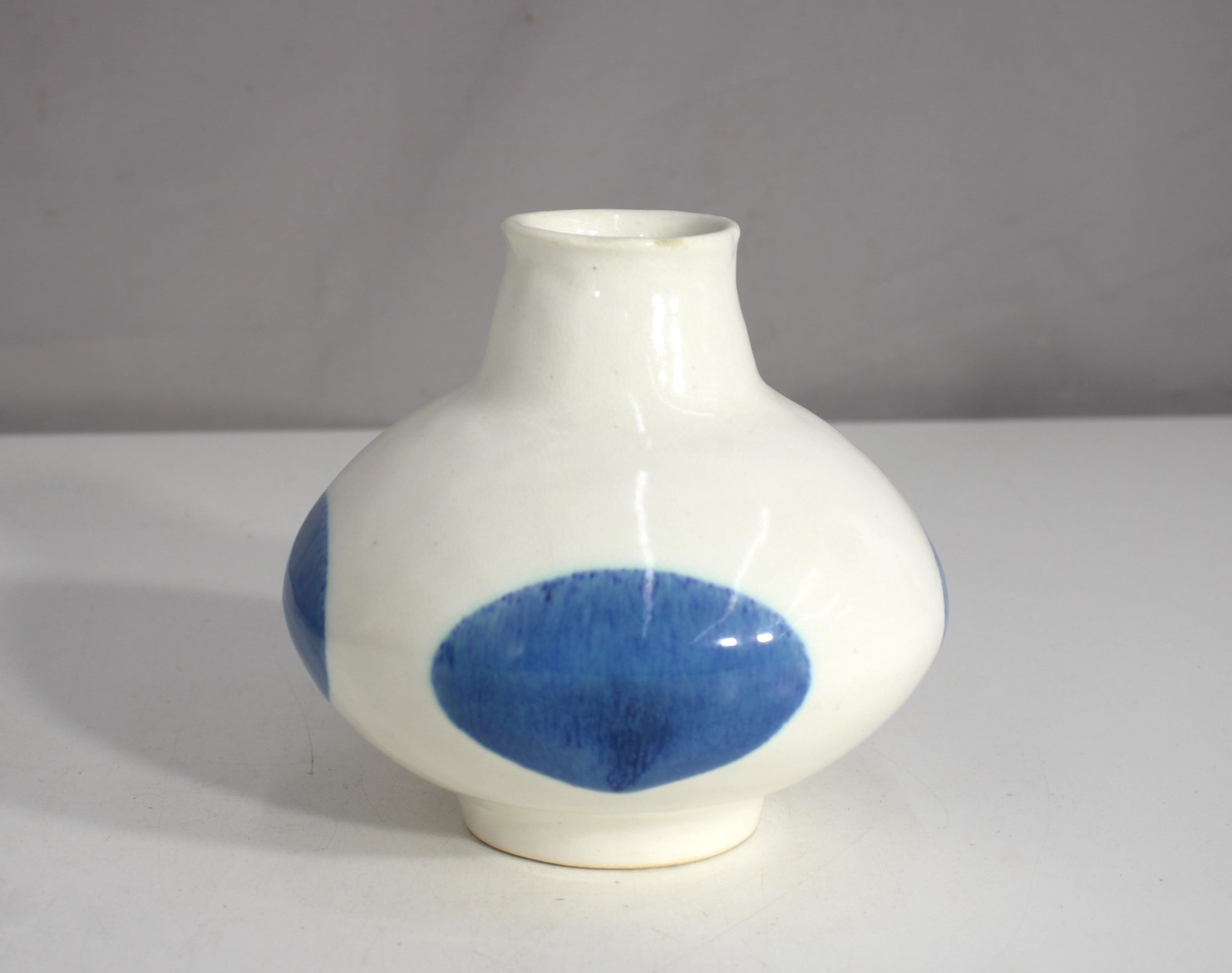 Offered is a beautifully crafted studio pottery vase by Moore, standing approximately 5.5 inches tall. The vase features a clean white glaze with bold blue hand-painted oval accents, creating a distinctly modernist and minimalist look. The form is rounded with a narrow neck, perfect for showcasing dried botanicals or as a sculptural accent on its own.