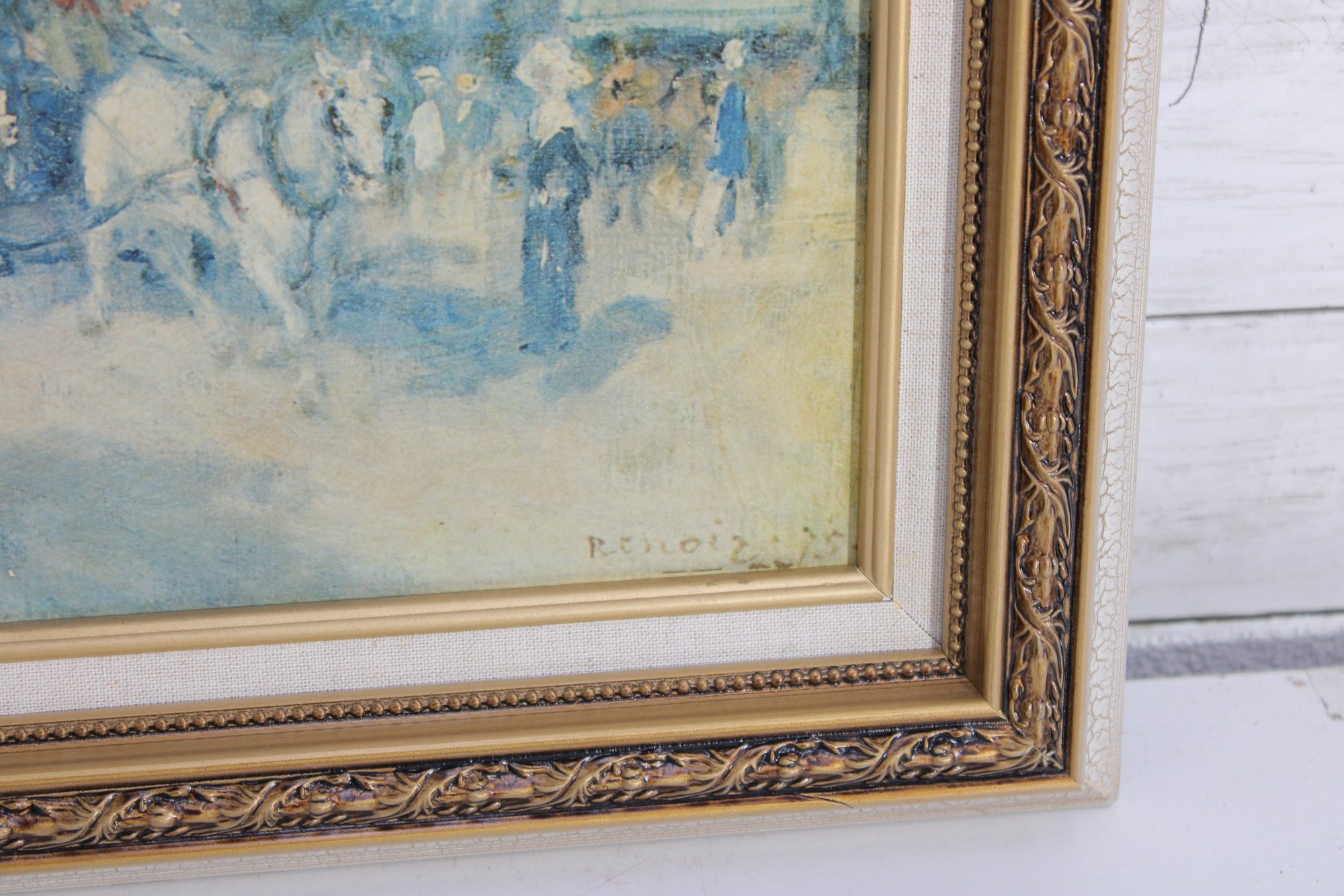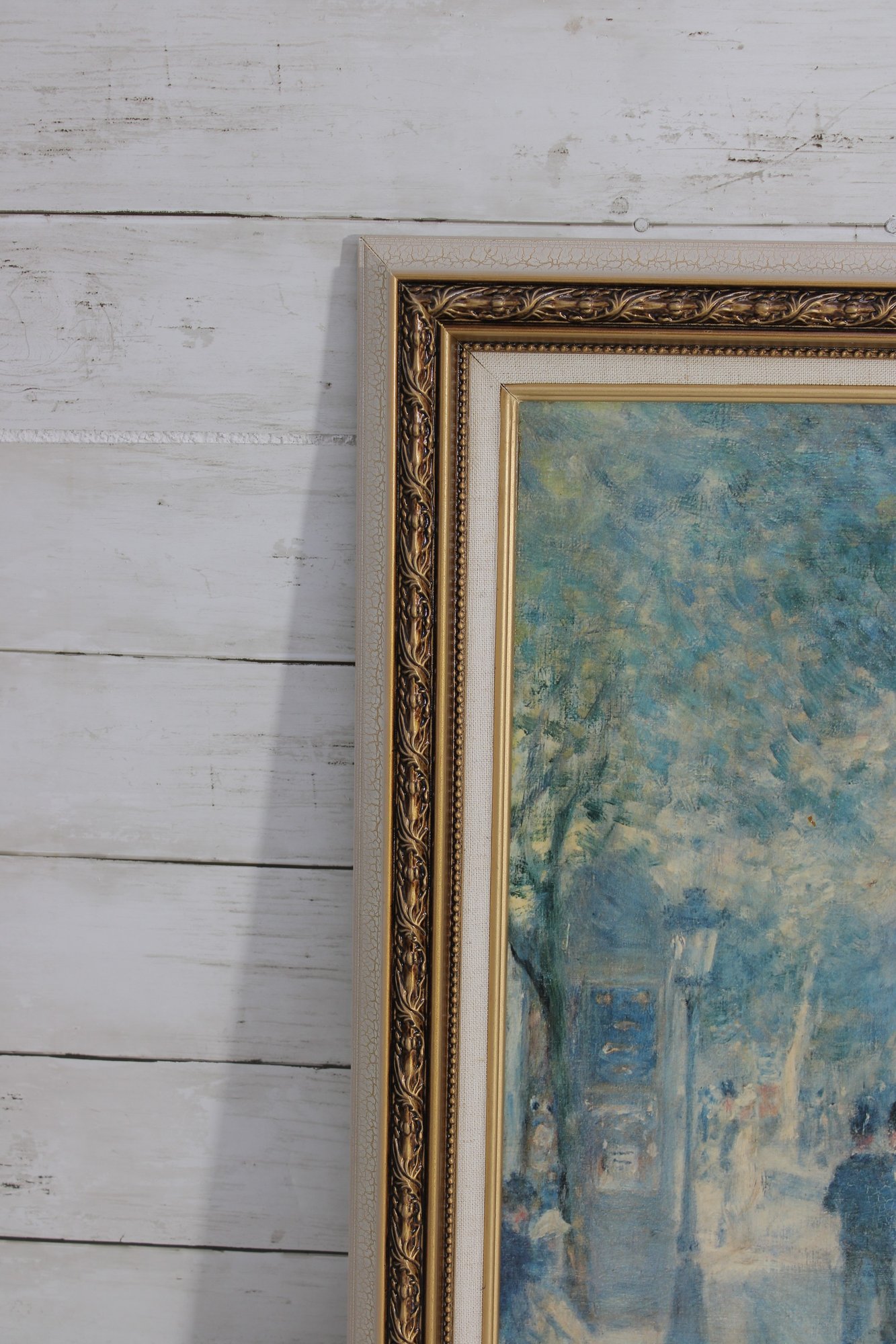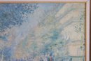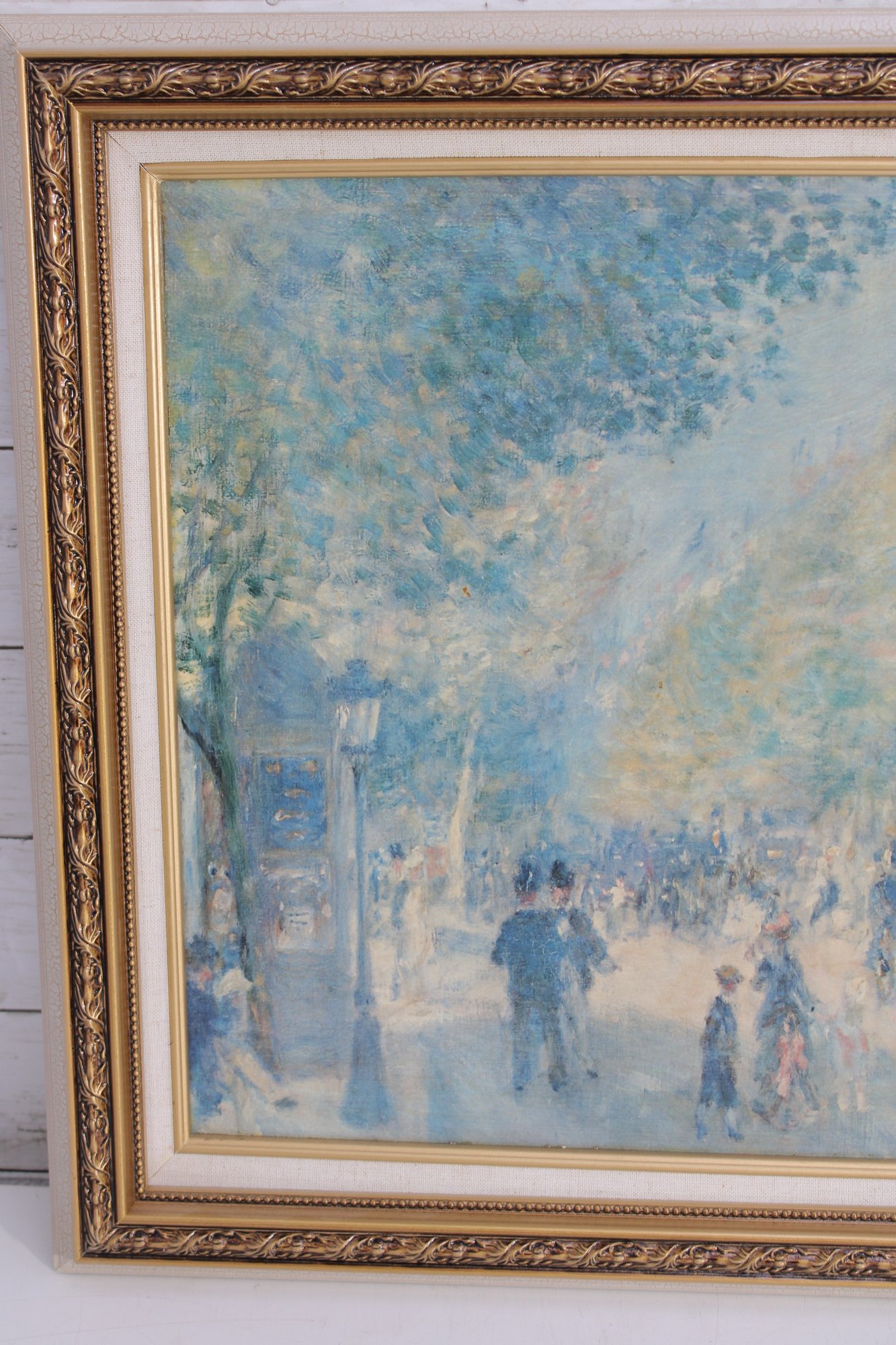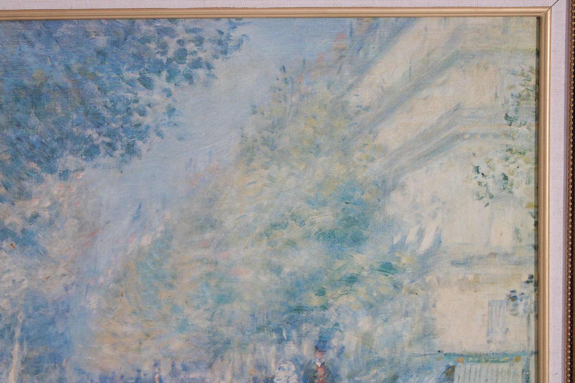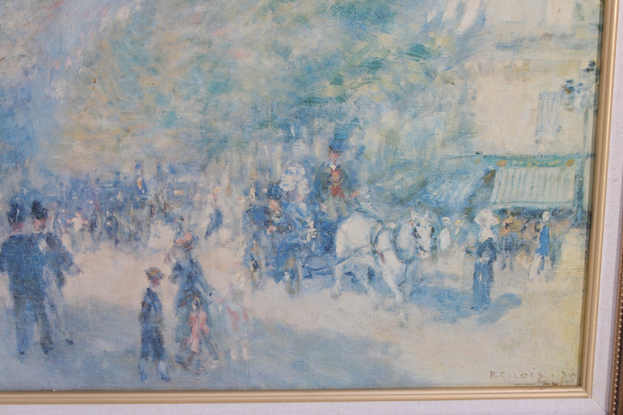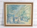 print captures a lively impressionist-style street scene, reminiscent of a Parisian boulevard. Soft, airy brushstrokes depict pedestrians, horse-drawn carriages, and sun-dappled trees, creating a dreamy atmosphere filled with movement and light. The palette of pale blues, creams, and gentle pastels gives the piece a timeless, romantic quality.