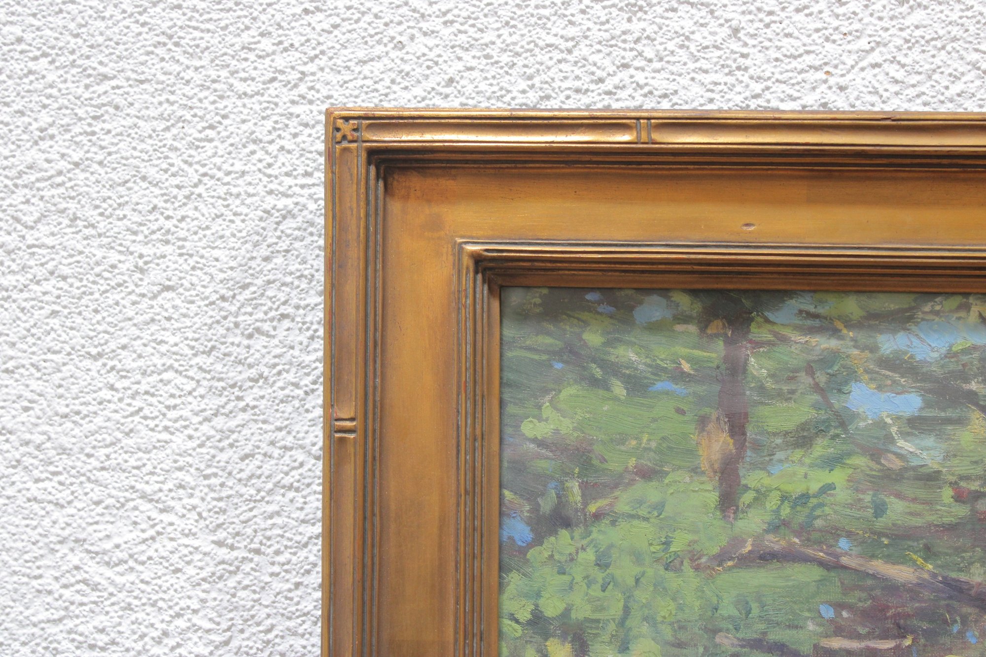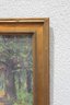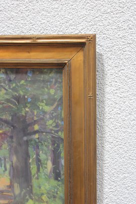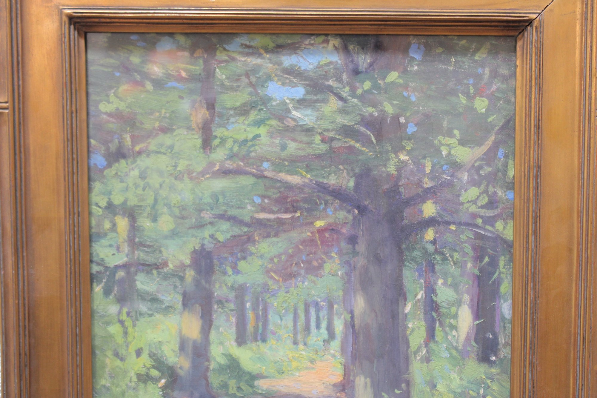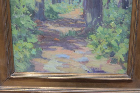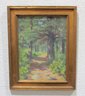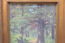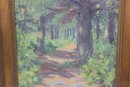 This charming landscape painting depicts a sun-dappled woodland path winding through tall trees and lush greenery, rendered in an expressive impressionist style. Confident brushwork and layered color create depth and movement, while soft light filtering through the canopy gives the scene a peaceful, inviting atmosphere.