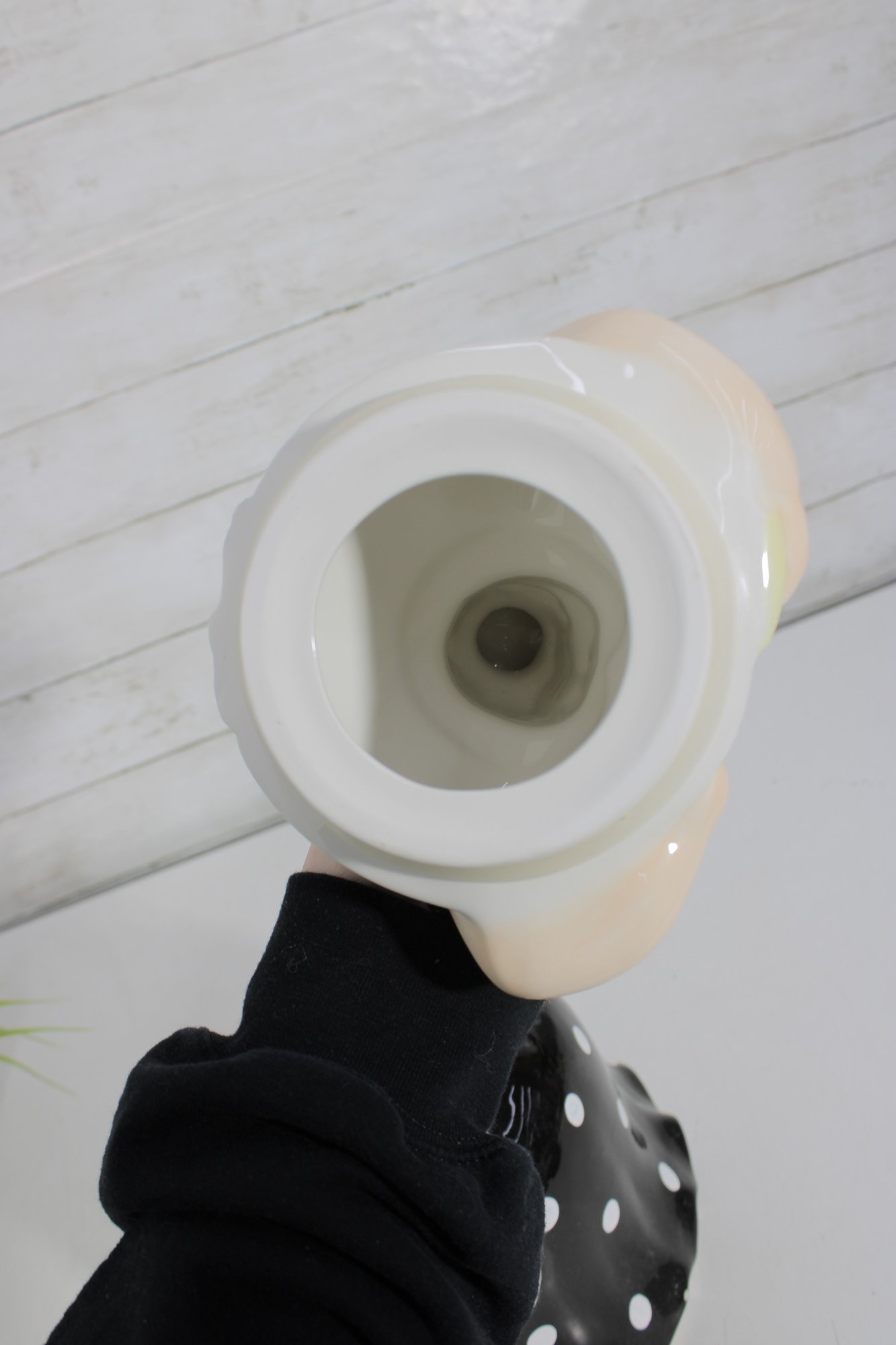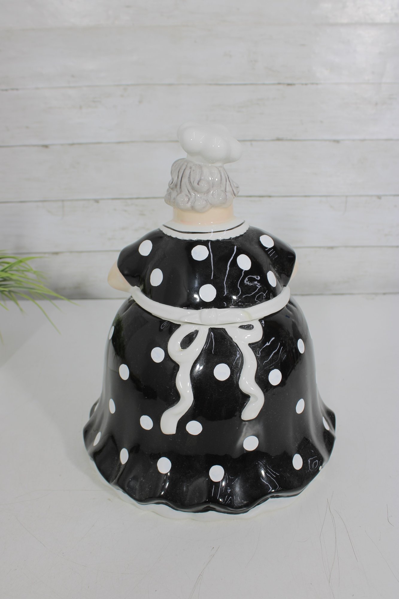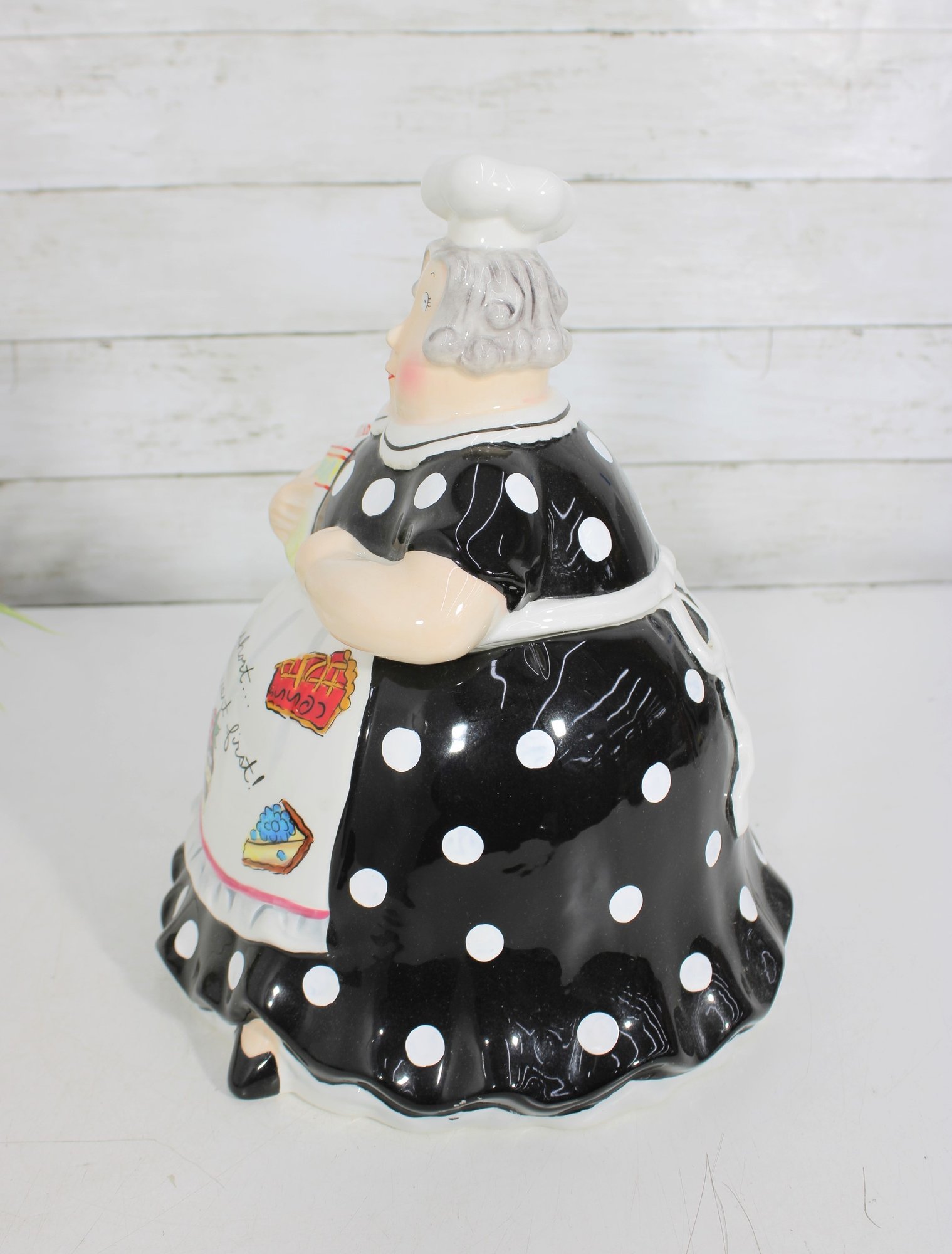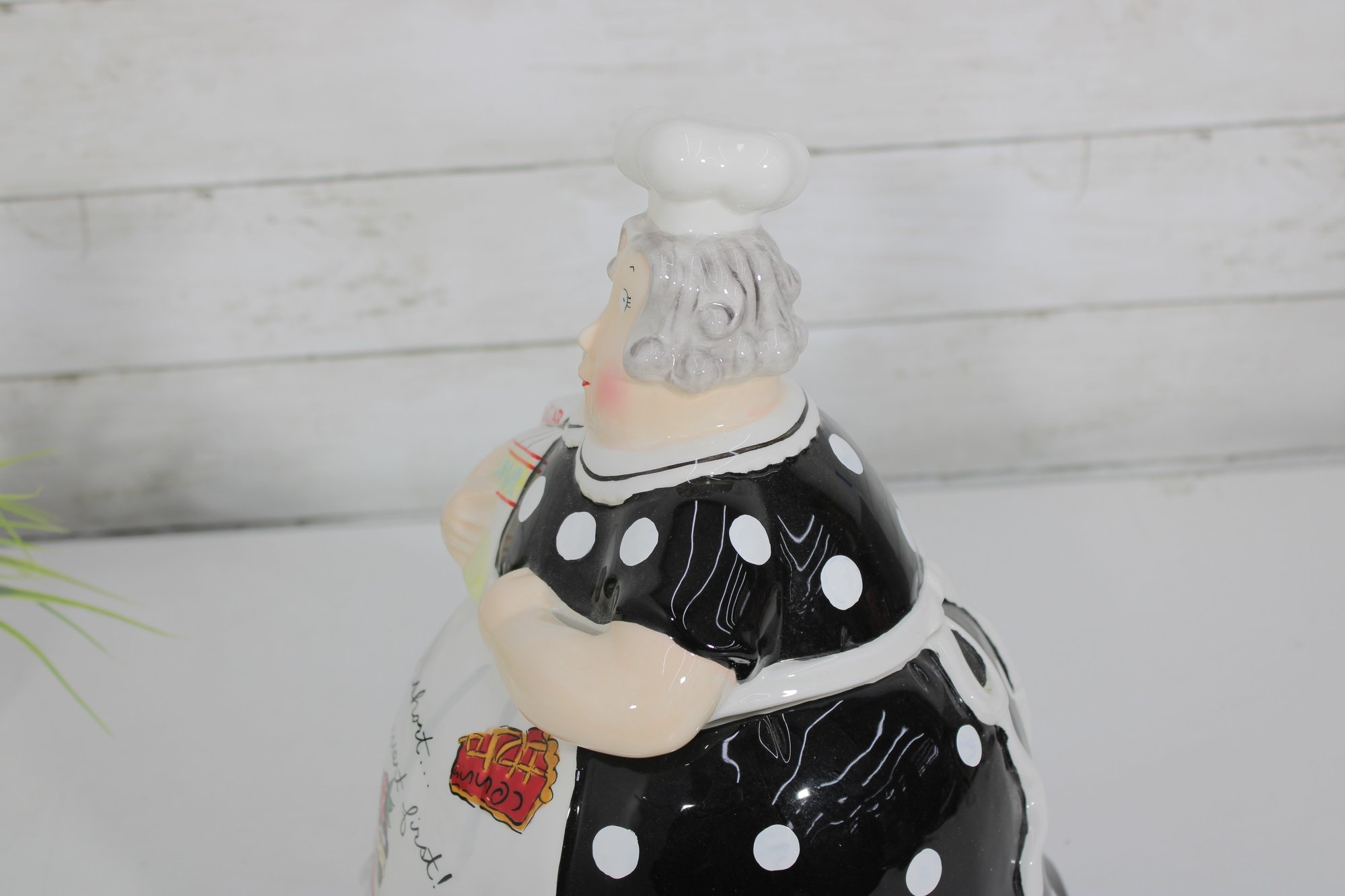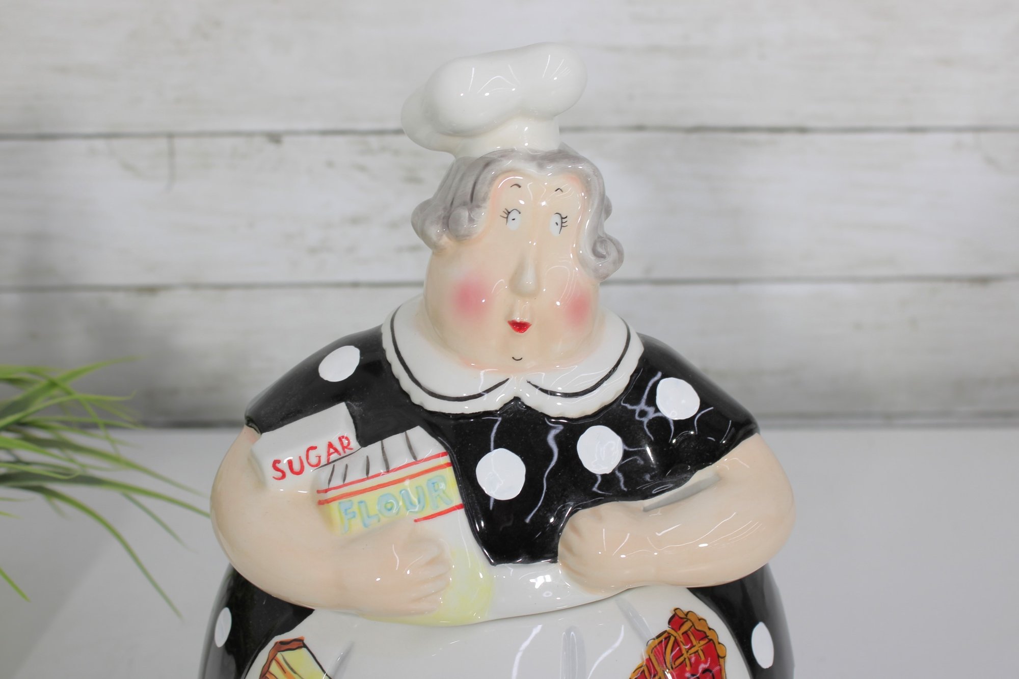 this whimsical Mud Pie baker lady cookie jar, standing 12 inches tall. Bursting with charm and color, this piece is both functional storage and cheerful countertop décor.