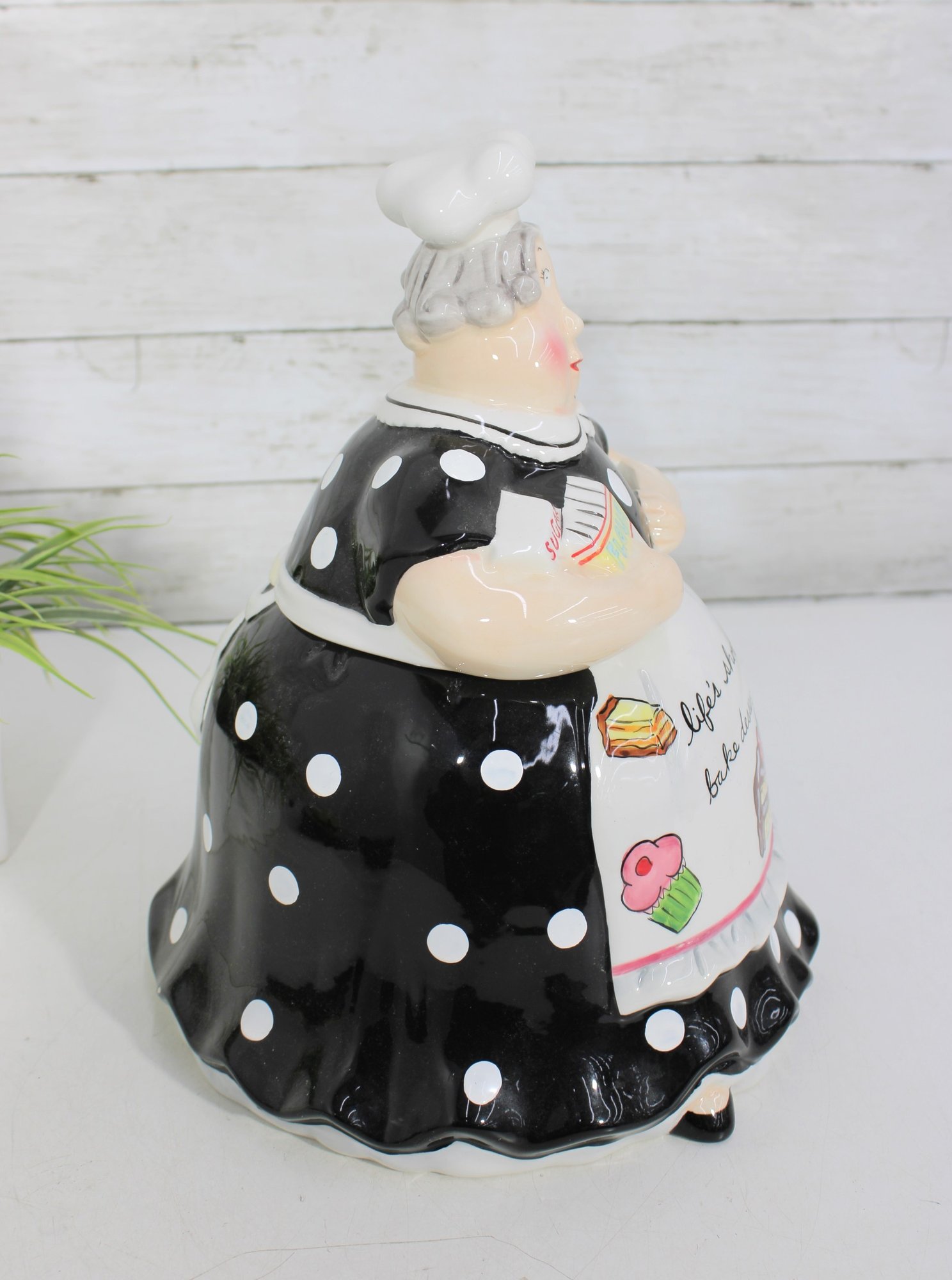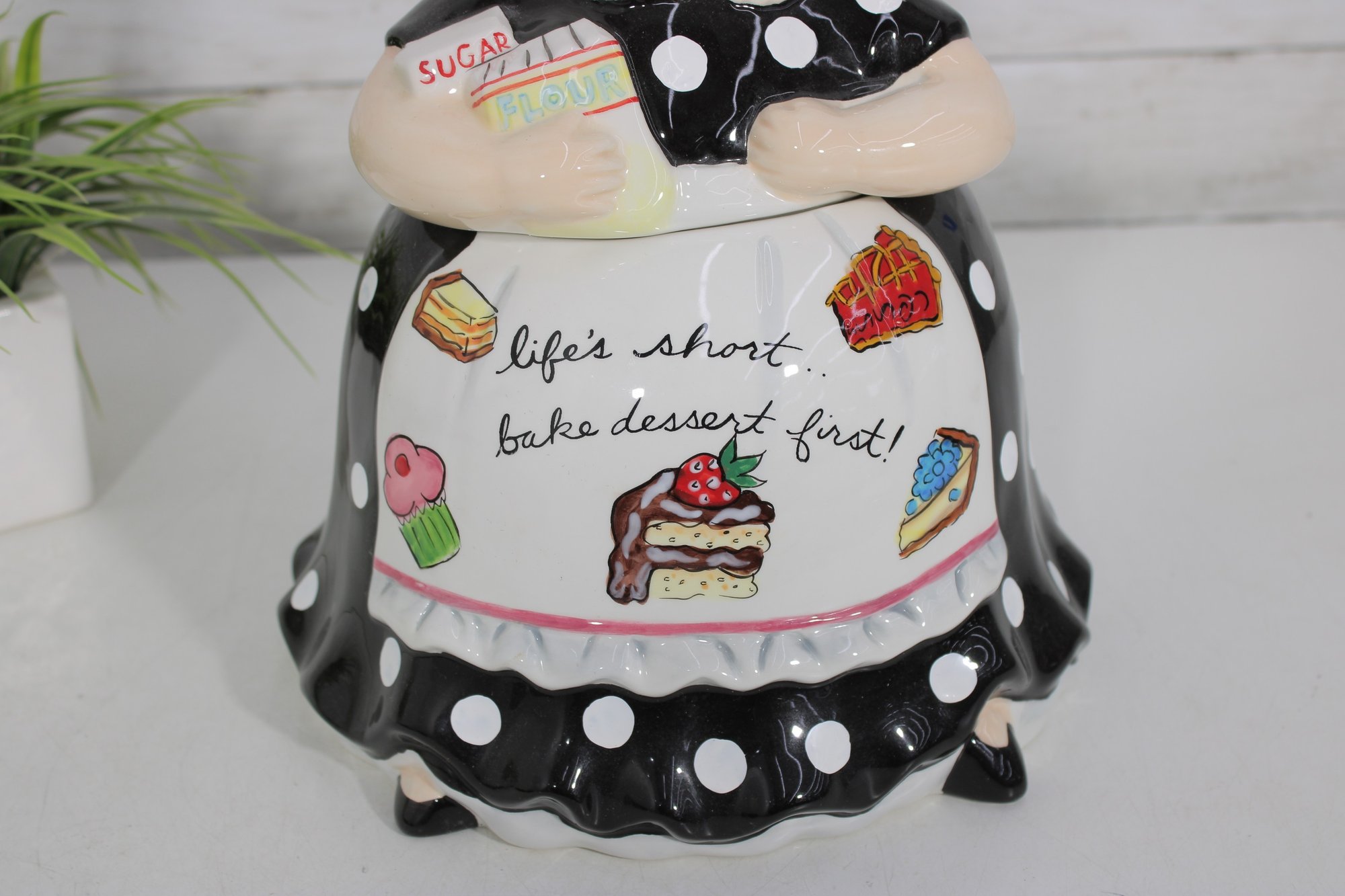 The jar features a smiling baker figure dressed in a black and white polka-dot outfit with a decorative apron that reads: “Life’s short, bake dessert first!”