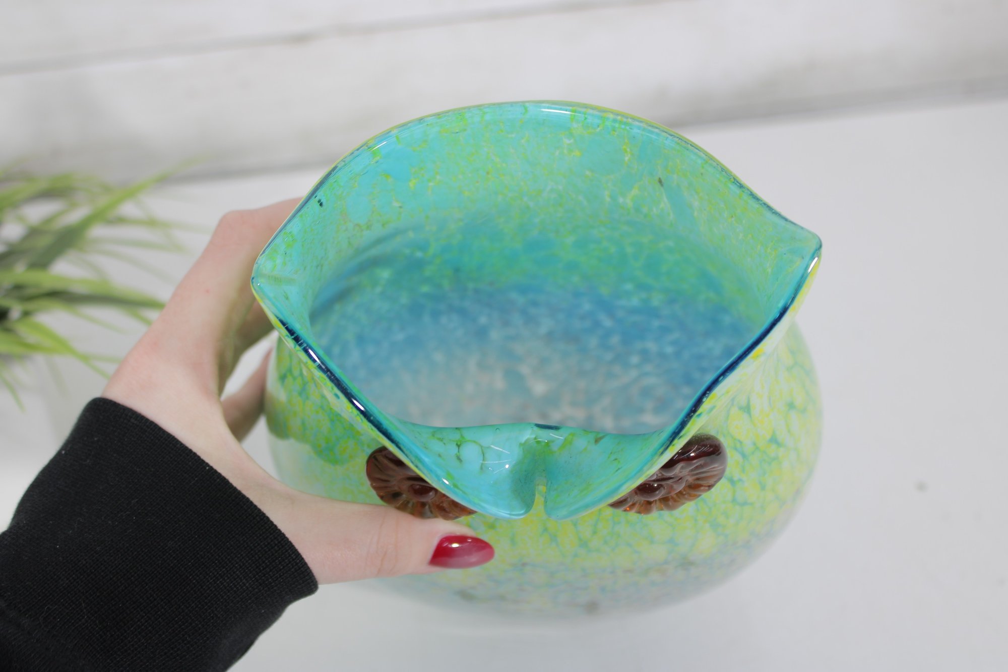 This beautifully hand-blown piece showcases a stylized owl form, with applied circular eyes and a gracefully shaped rim that suggests the owl’s ears. The glass transitions from bright lime green at the top into soft blue tones toward the base, creating a striking visual effect typical of Murano craftsmanship.