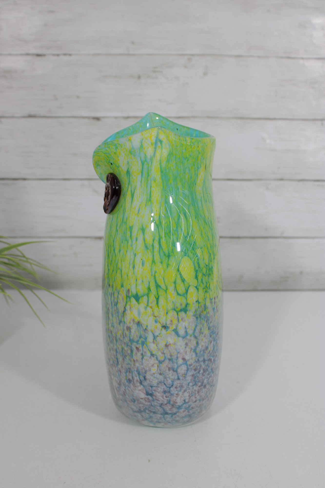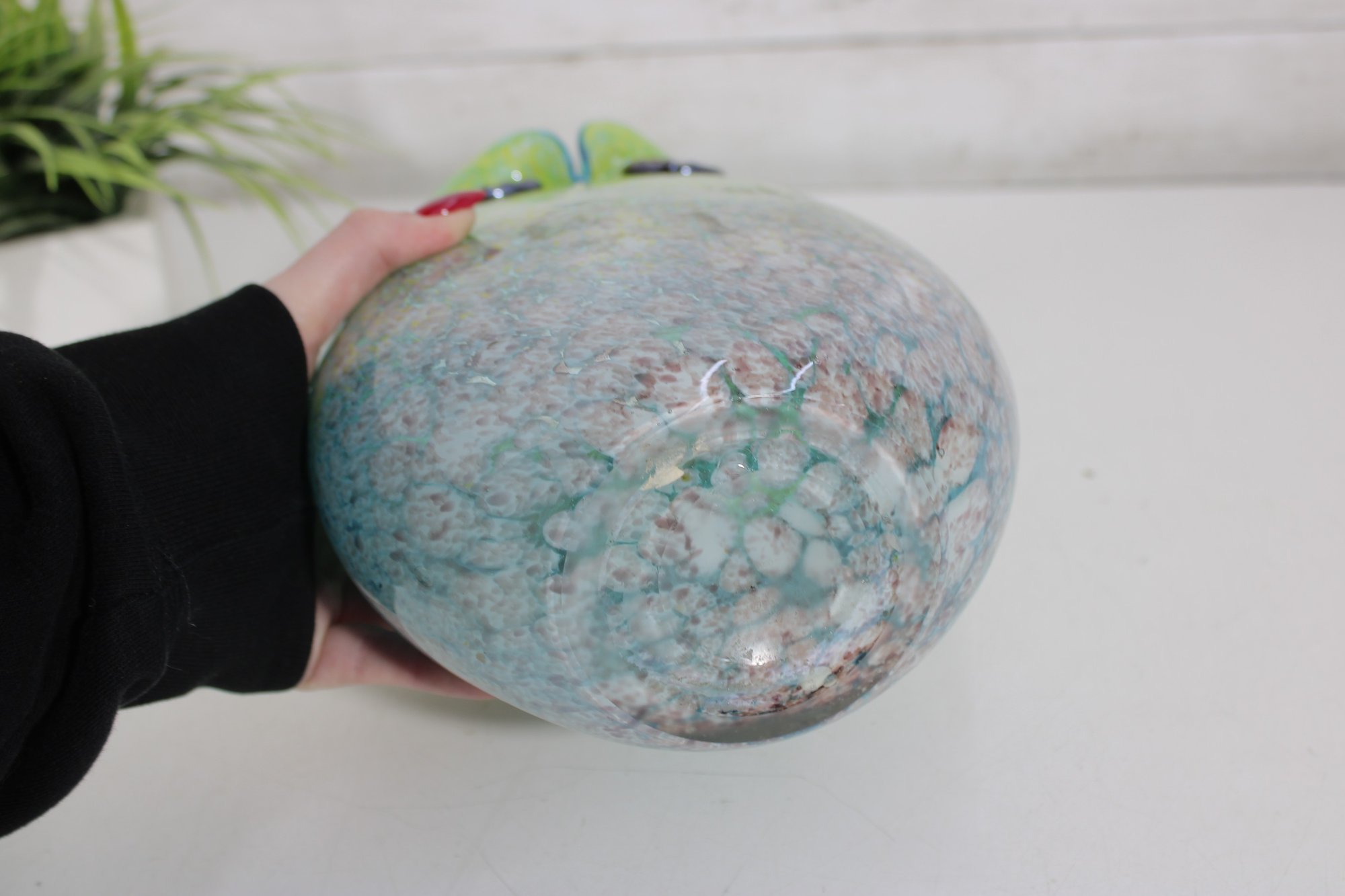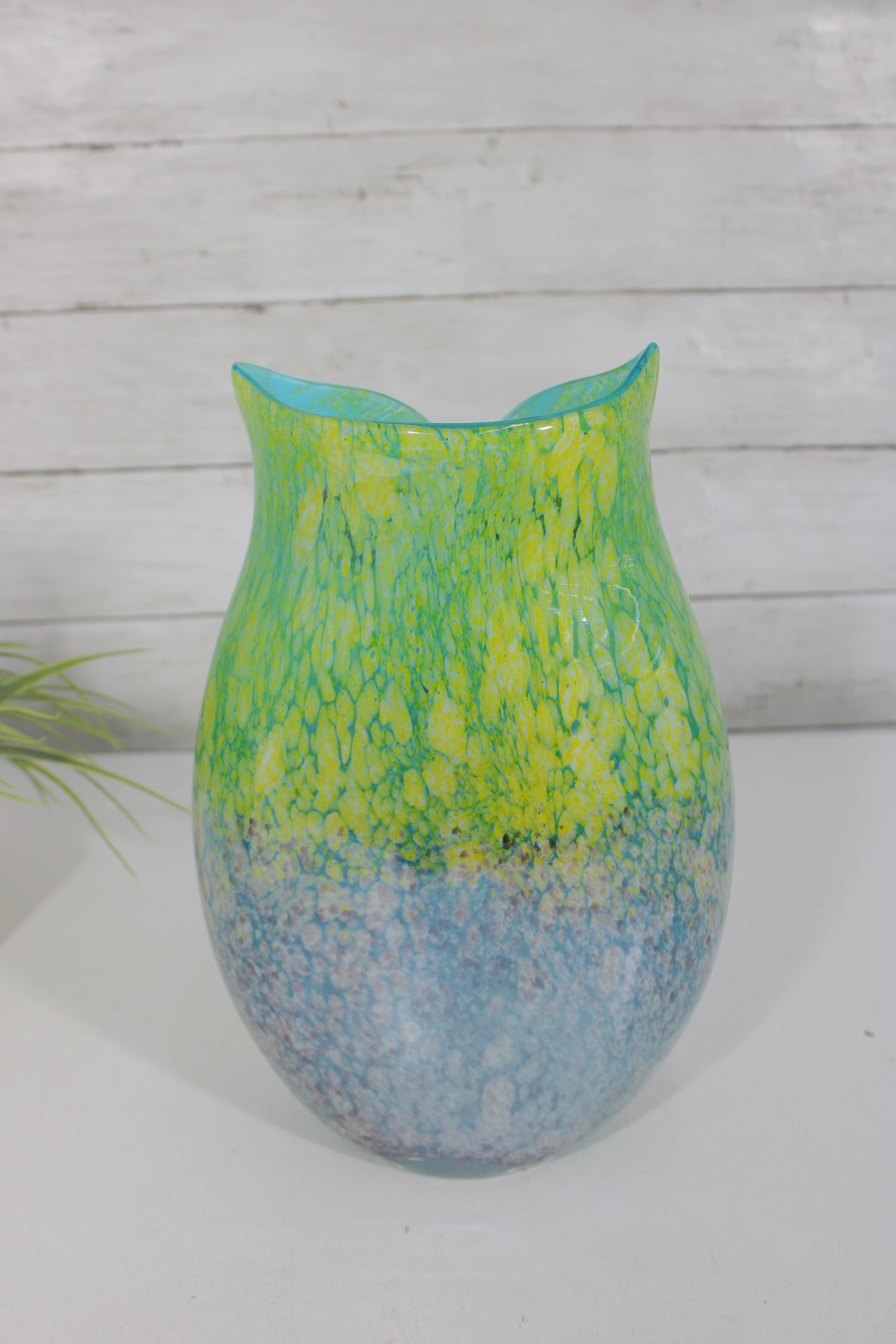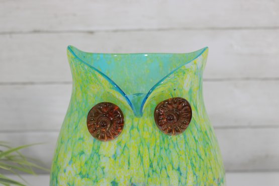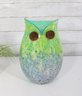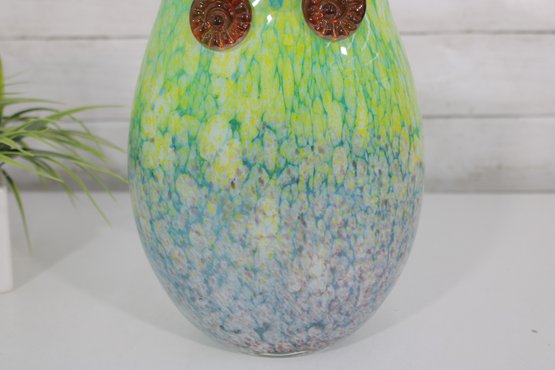 here is a gorgeous Murano art glass owl vase, featuring a stunning green-to-blue color gradient with a vibrant, speckled finish.