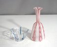 This exquisite Murano art glass set includes a 6-inch pink latticino vase and a 2-inch blue ribbon glass bowl, both showcasing masterful craftsmanship with intricate detailing.