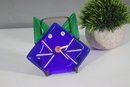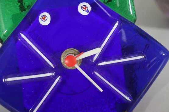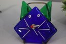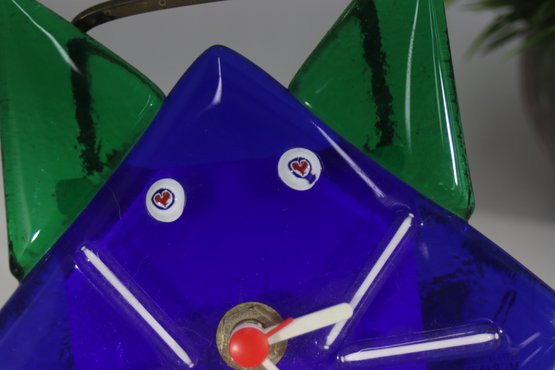 This unique and whimsical Murano glass clock is a charming handcrafted piece from Italy, featuring a bold cobalt blue and green fused glass design in the shape of a stylized cat. Its quirky expression and playful whisker details make it a standout collectible for art glass enthusiasts and cat lovers alike.