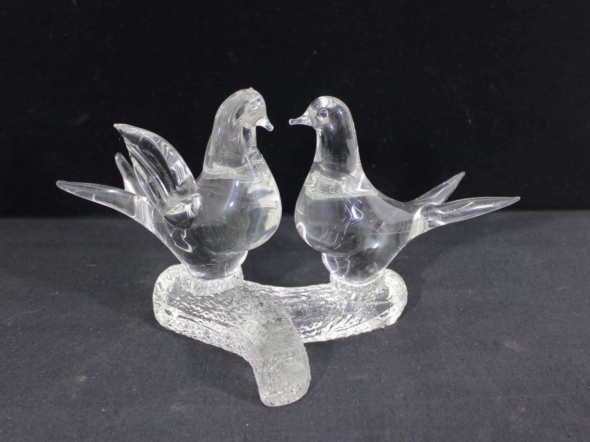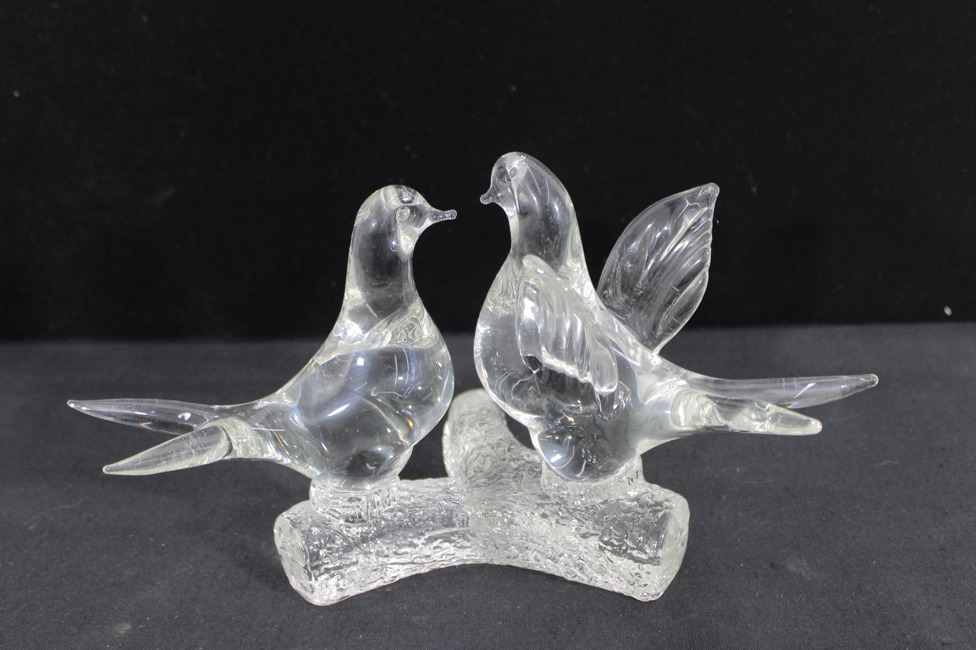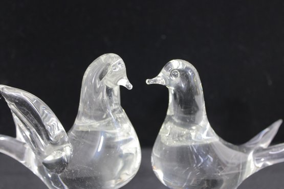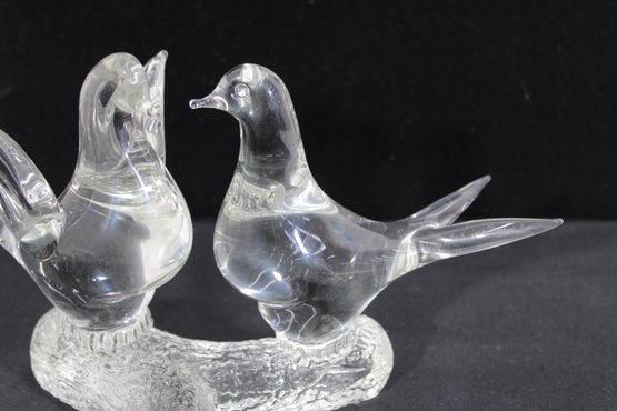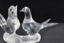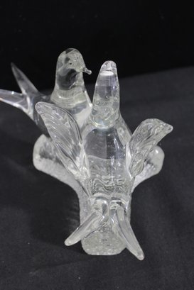 A charming Murano-style art glass sculpture featuring three beautifully formed birds perched together on a textured branch. Crafted in clear glass, this piece highlights elegant, fluid lines and smooth contours, capturing a sense of movement and interaction between the birds.