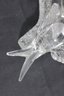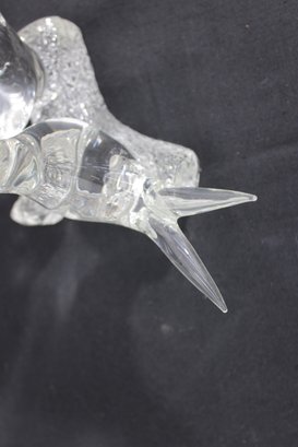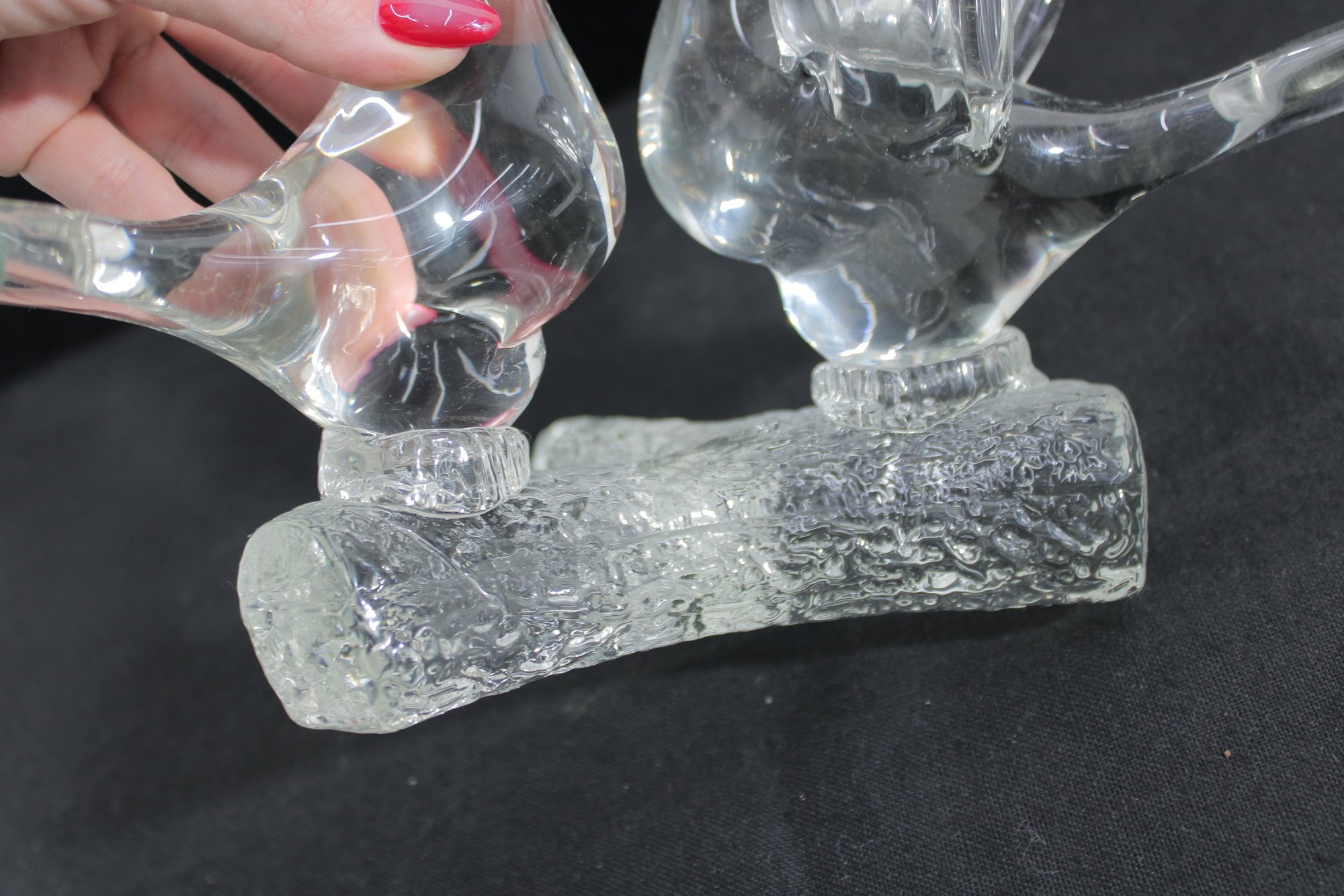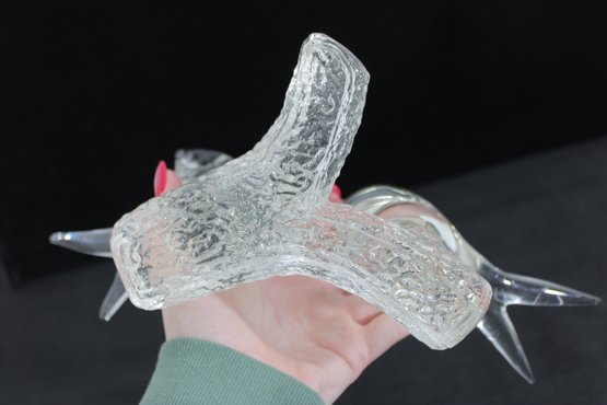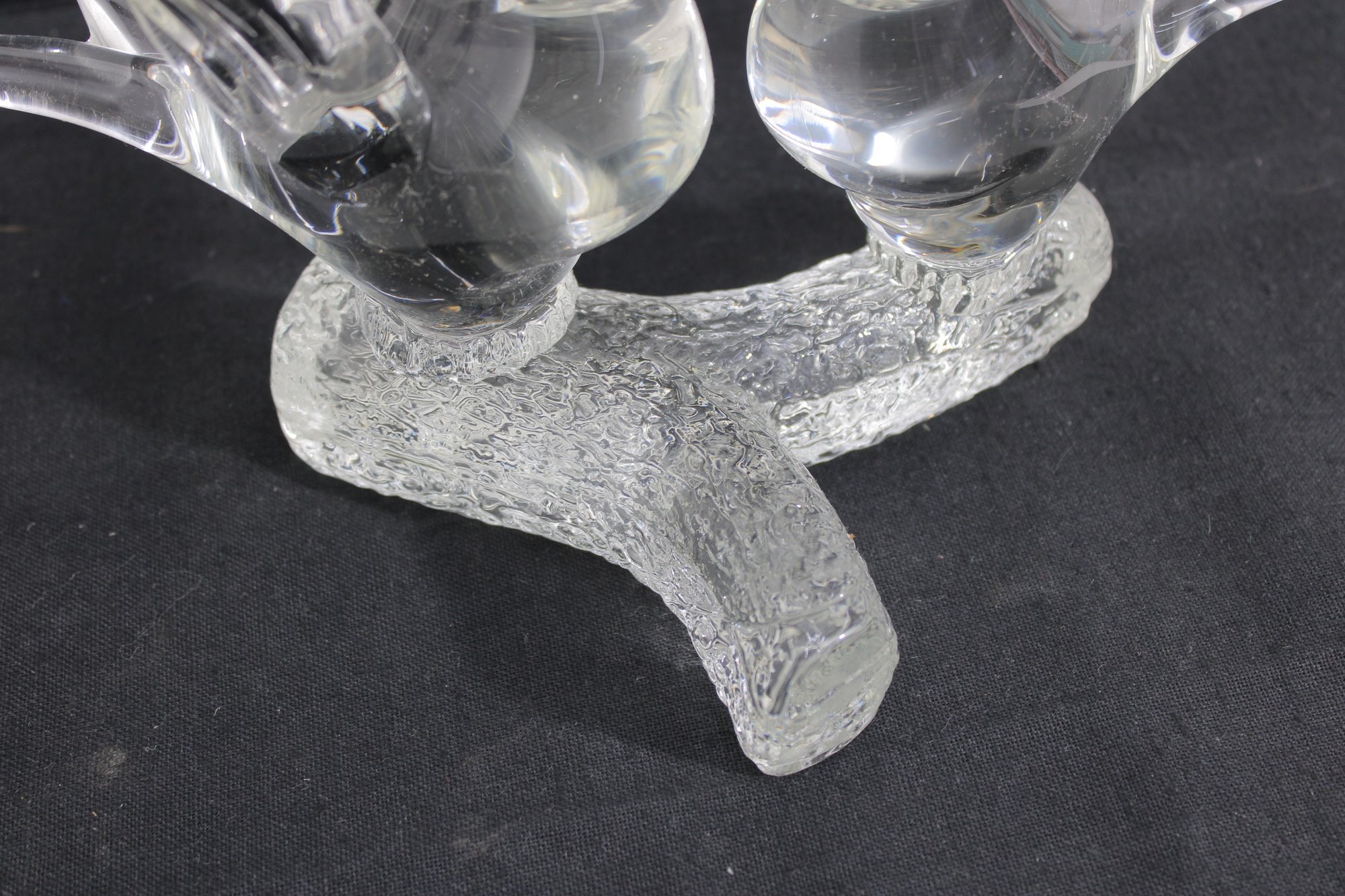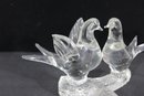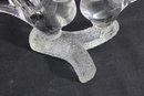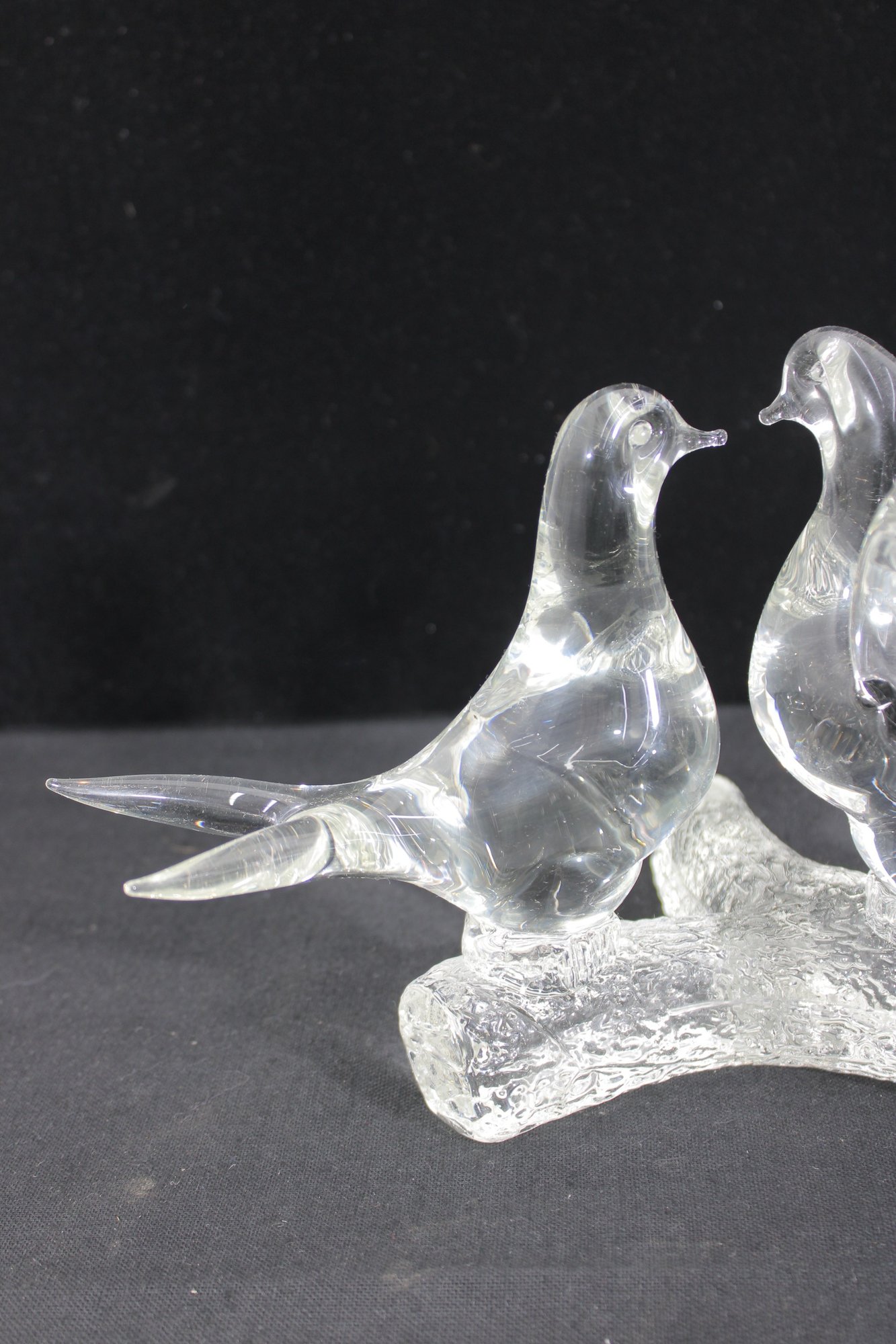 A charming Murano-style art glass sculpture featuring three beautifully formed birds perched together on a textured branch. Crafted in clear glass, this piece highlights elegant, fluid lines and smooth contours, capturing a sense of movement and interaction between the birds.