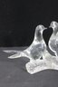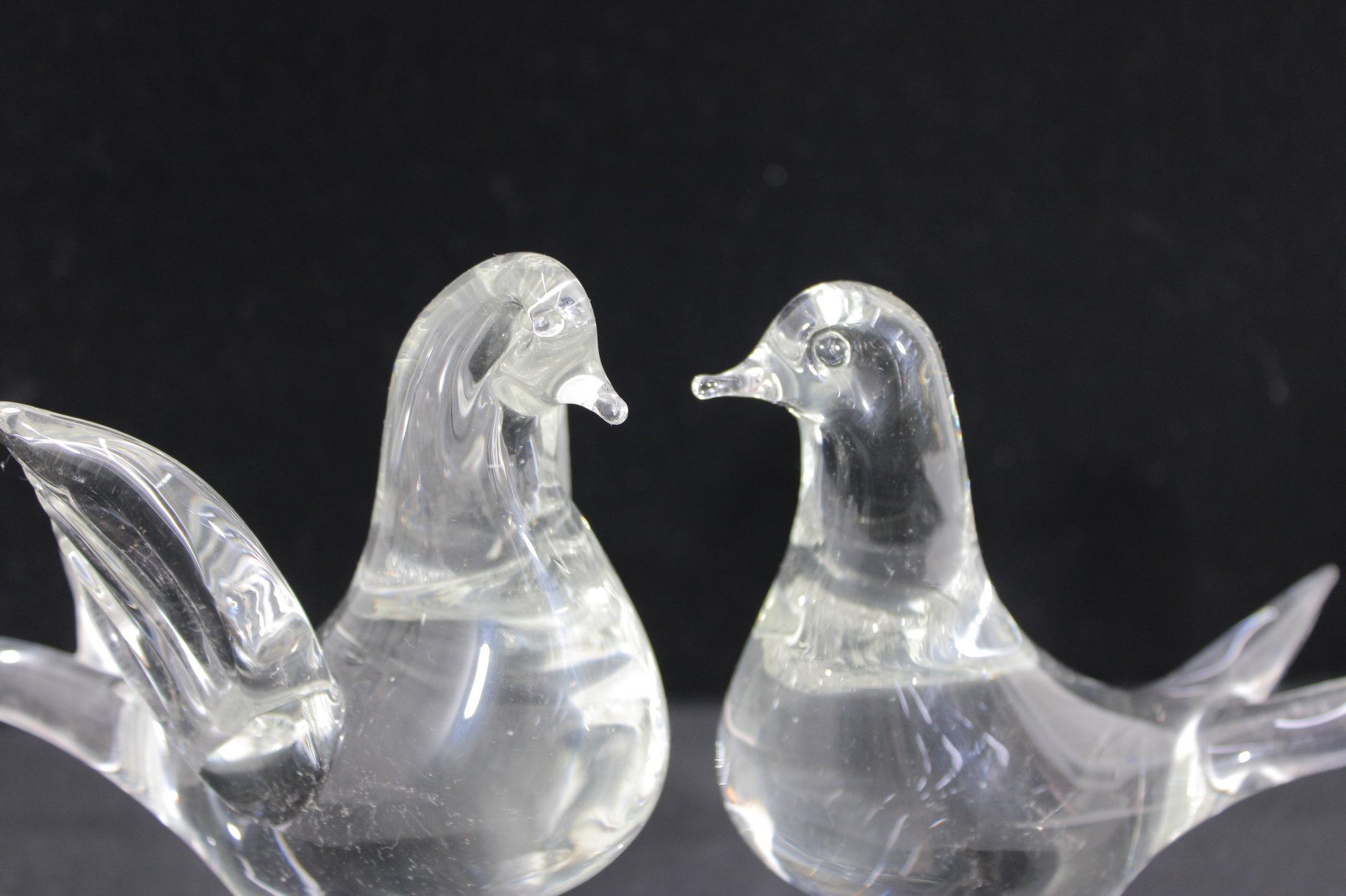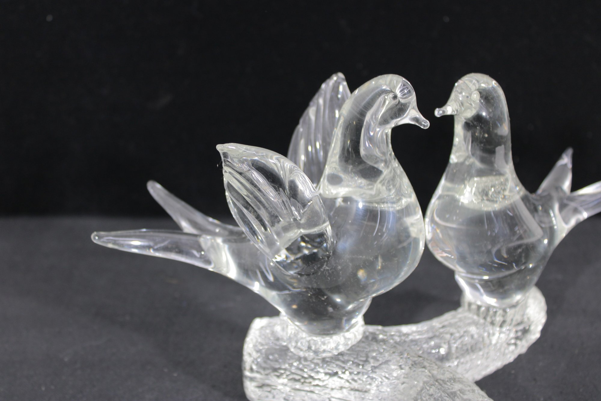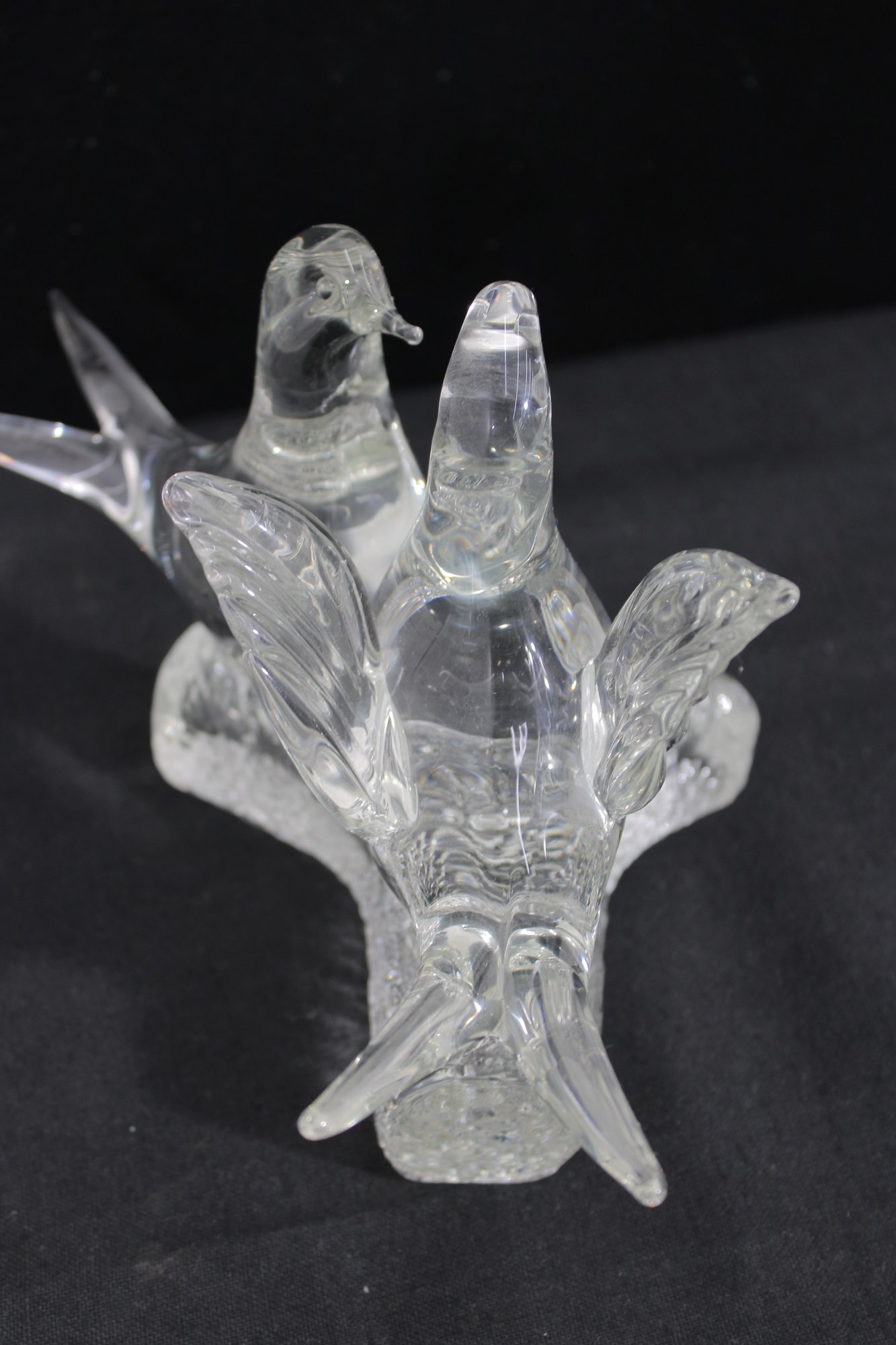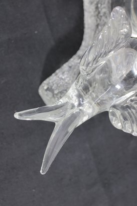 The sculptural design showcases classic Murano-inspired techniques, with delicate detailing in the wings, tails, and rounded bodies. The frosted-texture branch base contrasts nicely with the polished clarity of the birds, adding visual depth and interest.