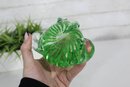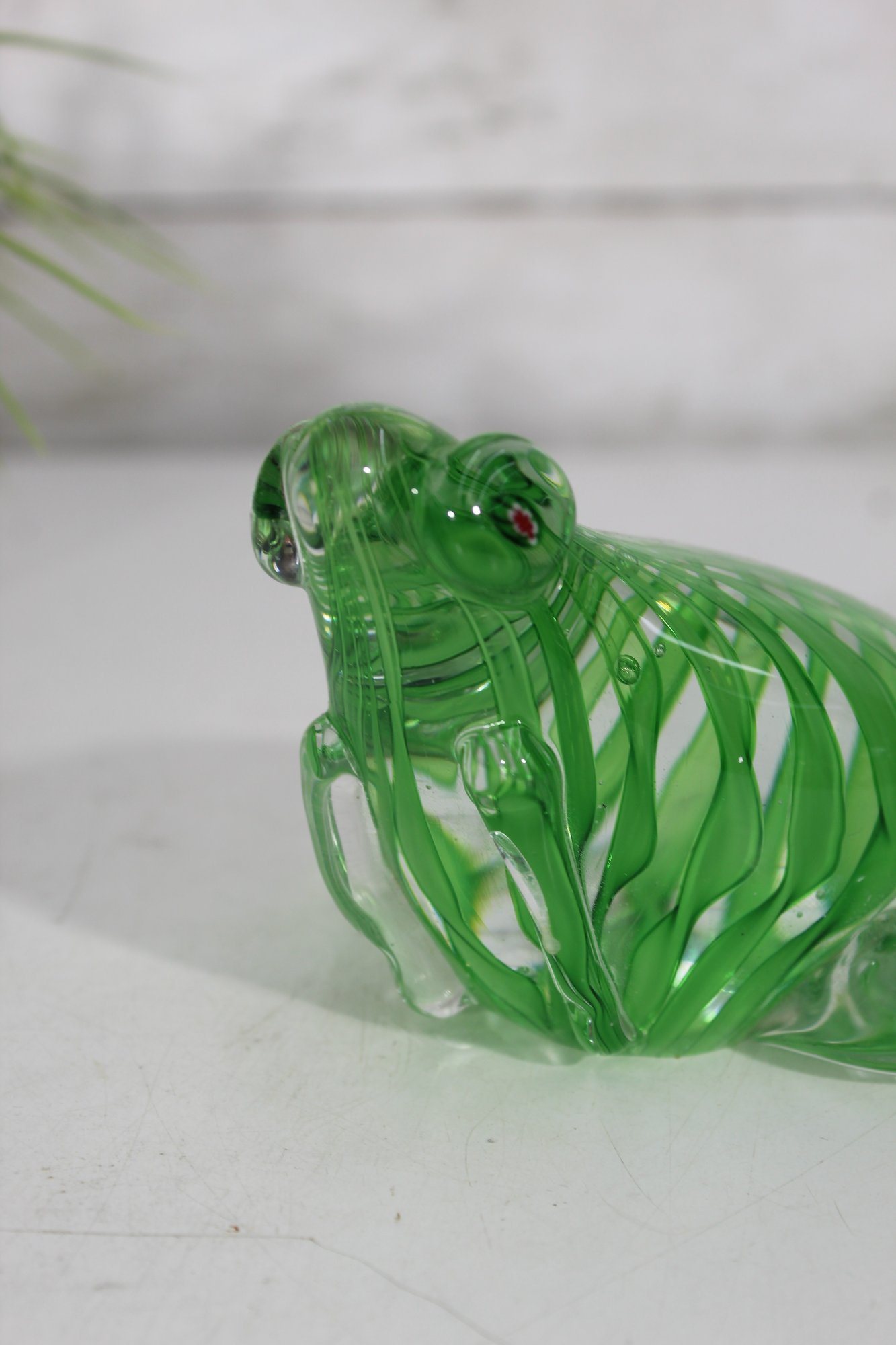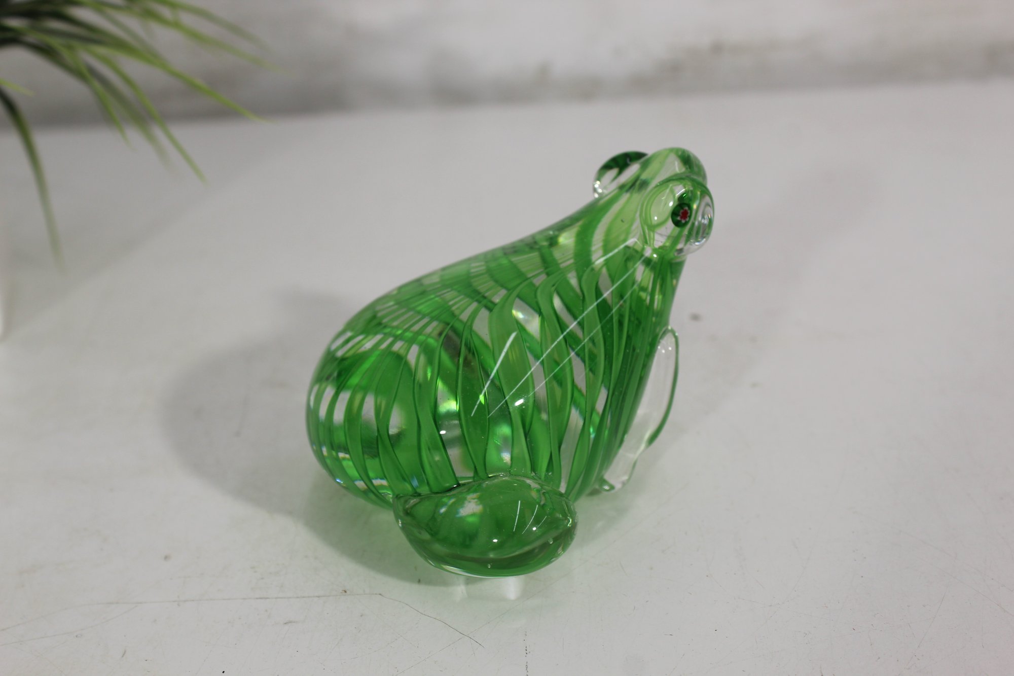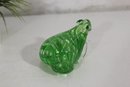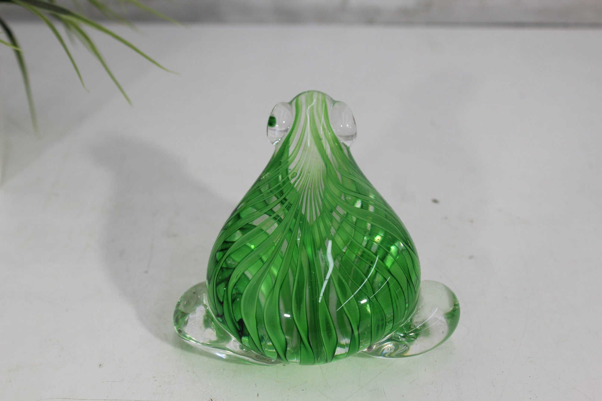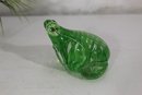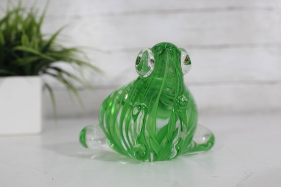 Beautifully crafted in vibrant green and clear glass, this Murano-style art glass frog figurine captures the elegance of hand-blown artistry. The piece features a striking ribbon swirl pattern within the body and expressive applied glass eyes, adding charm and depth to its lifelike form.