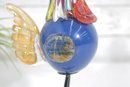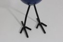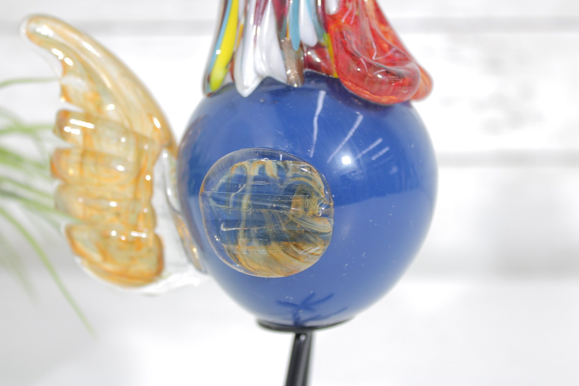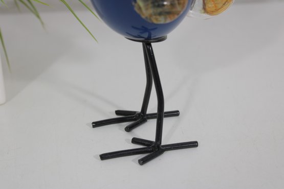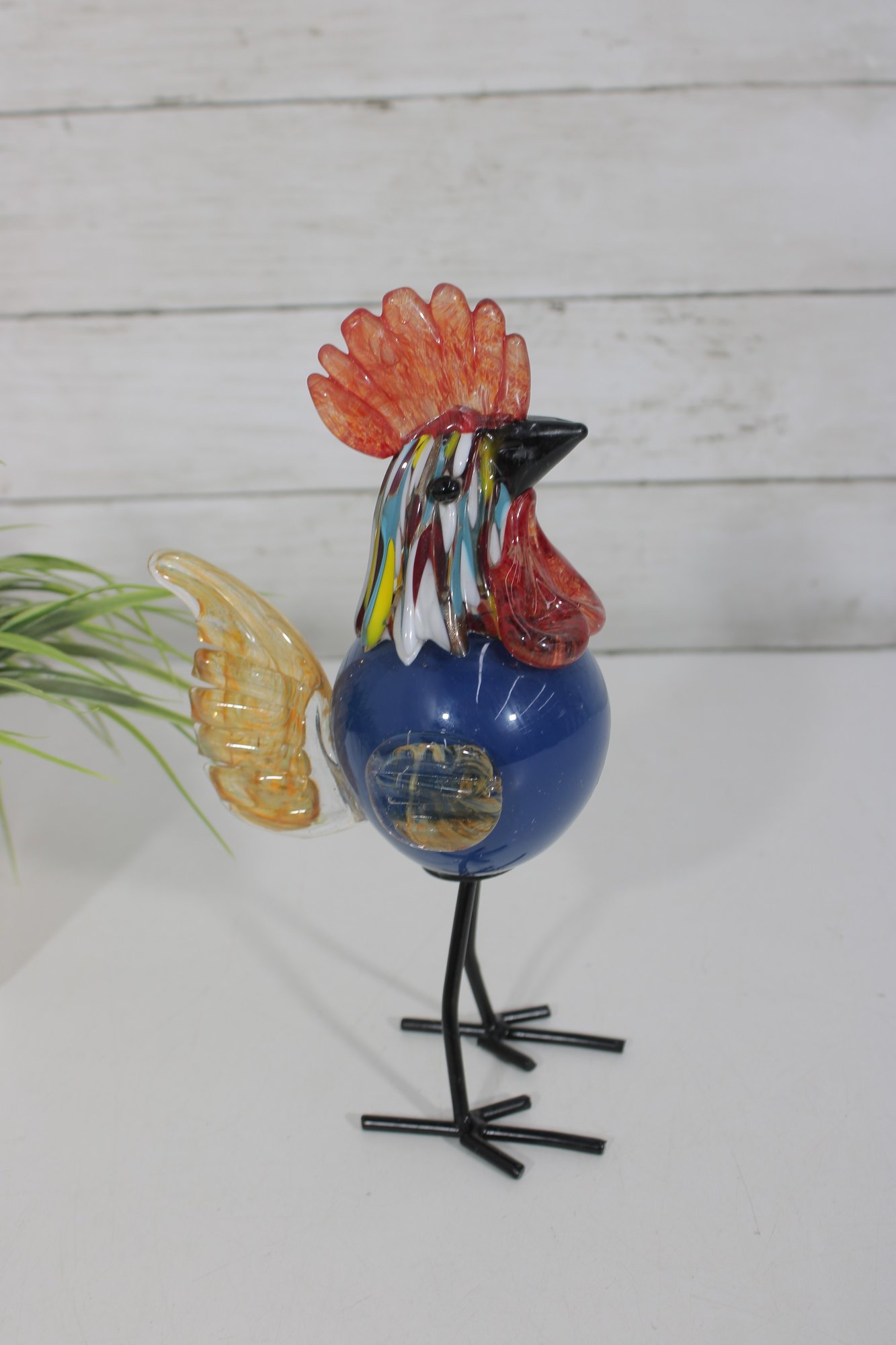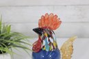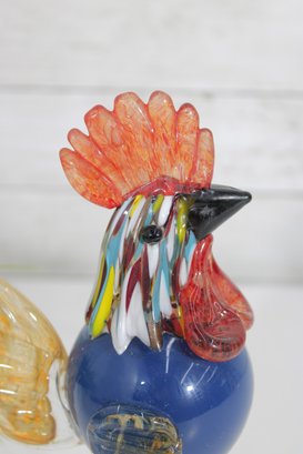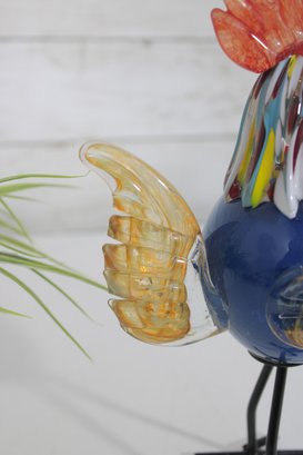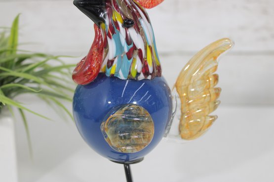 Vibrant and eye-catching art glass rooster sculpture, crafted in a Murano-style hand-blown design. This whimsical piece features a rich cobalt blue body accented with colorful streaked glass in the neck, along with a striking red comb and amber-toned wings.