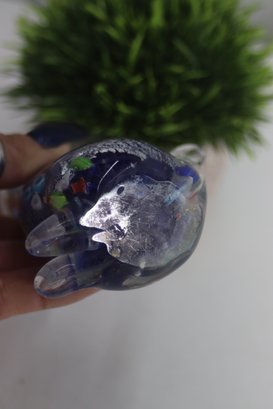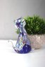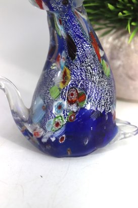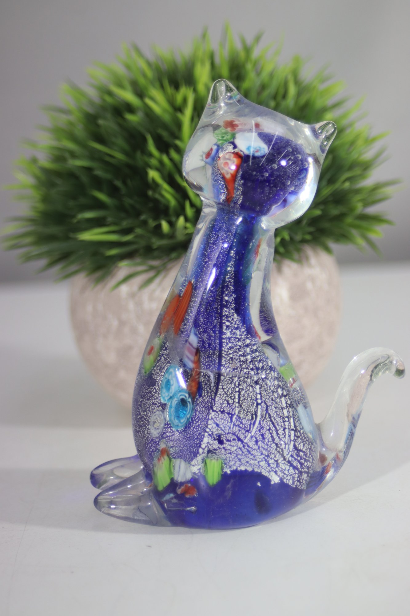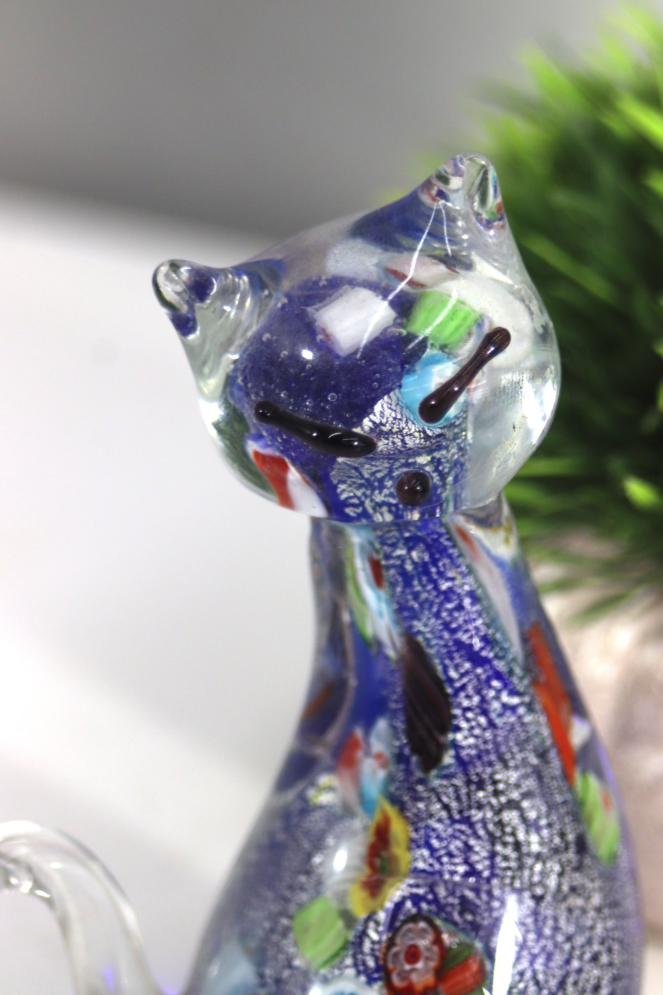 This stunning Murano-style art glass cat figurine is a mesmerizing blend of vibrant colors, delicate millefiori floral accents, and intricate swirling patterns encased in crystal-clear glass. The cat’s elegant pose, long curled tail, and expressive face make it a striking decorative piece. Featuring a deep blue base with shimmering silver flecks, this handcrafted sculpture reflects exquisite craftsmanship and artistry. Perfect for collectors, cat lovers, or as a unique statement piece for your home décor.