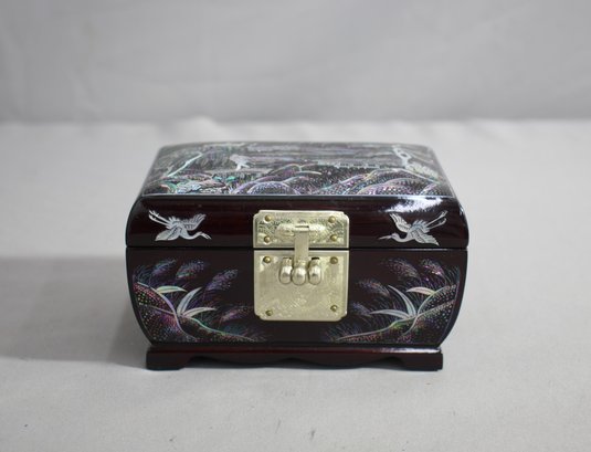 The box’s surface plays canvas to a spellbinding landscape design, intricately inlaid with shimmering mother of pearl the box is edged with polished, ebony-toned wood that complements the lustrous sheen of the mother of pearl. The interior of the box is as functional as it is elegant, perfect for housing your precious jewels and keepsakes