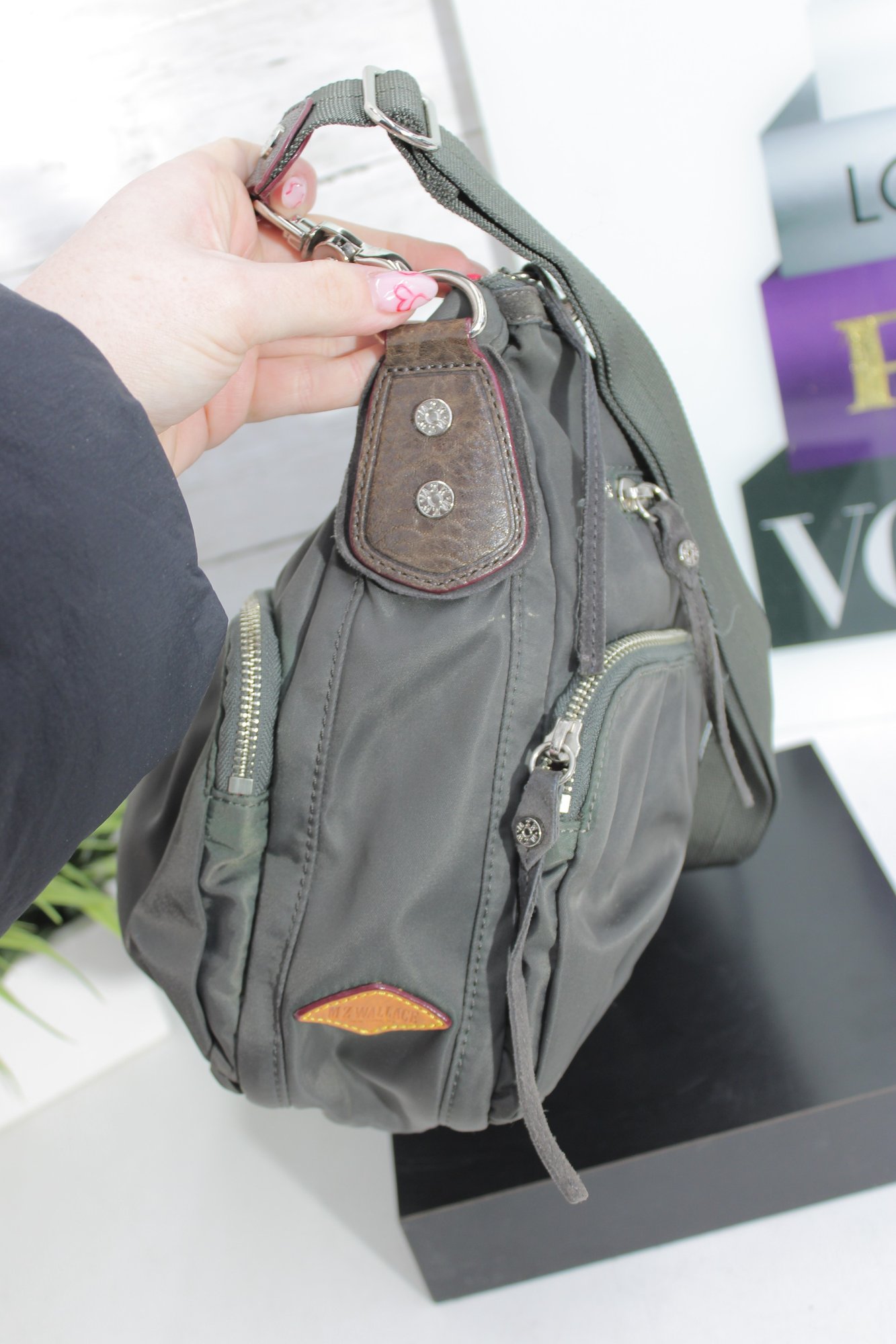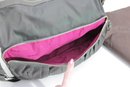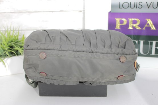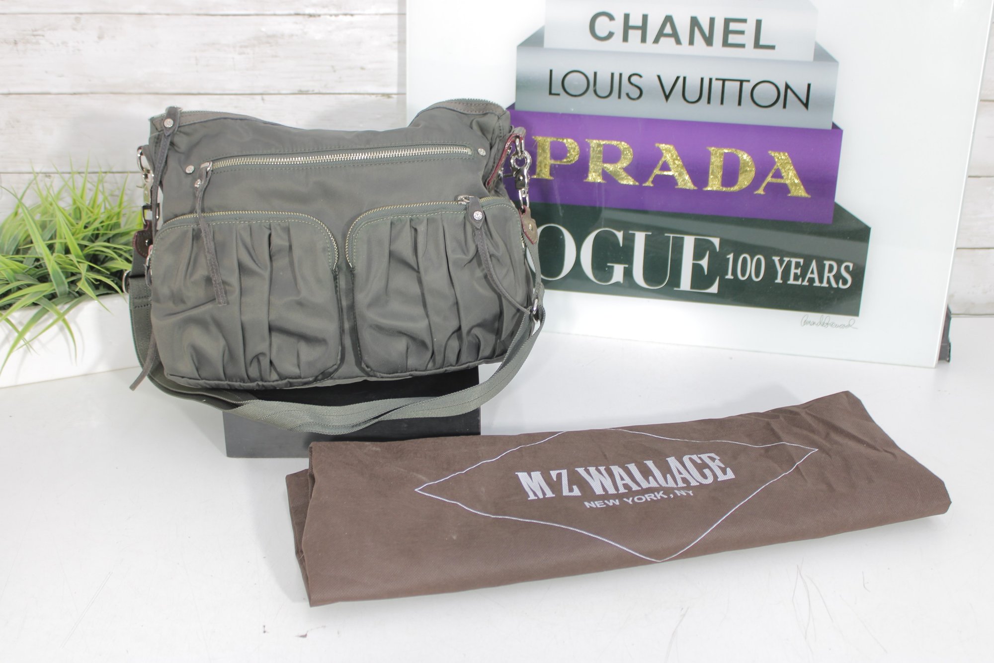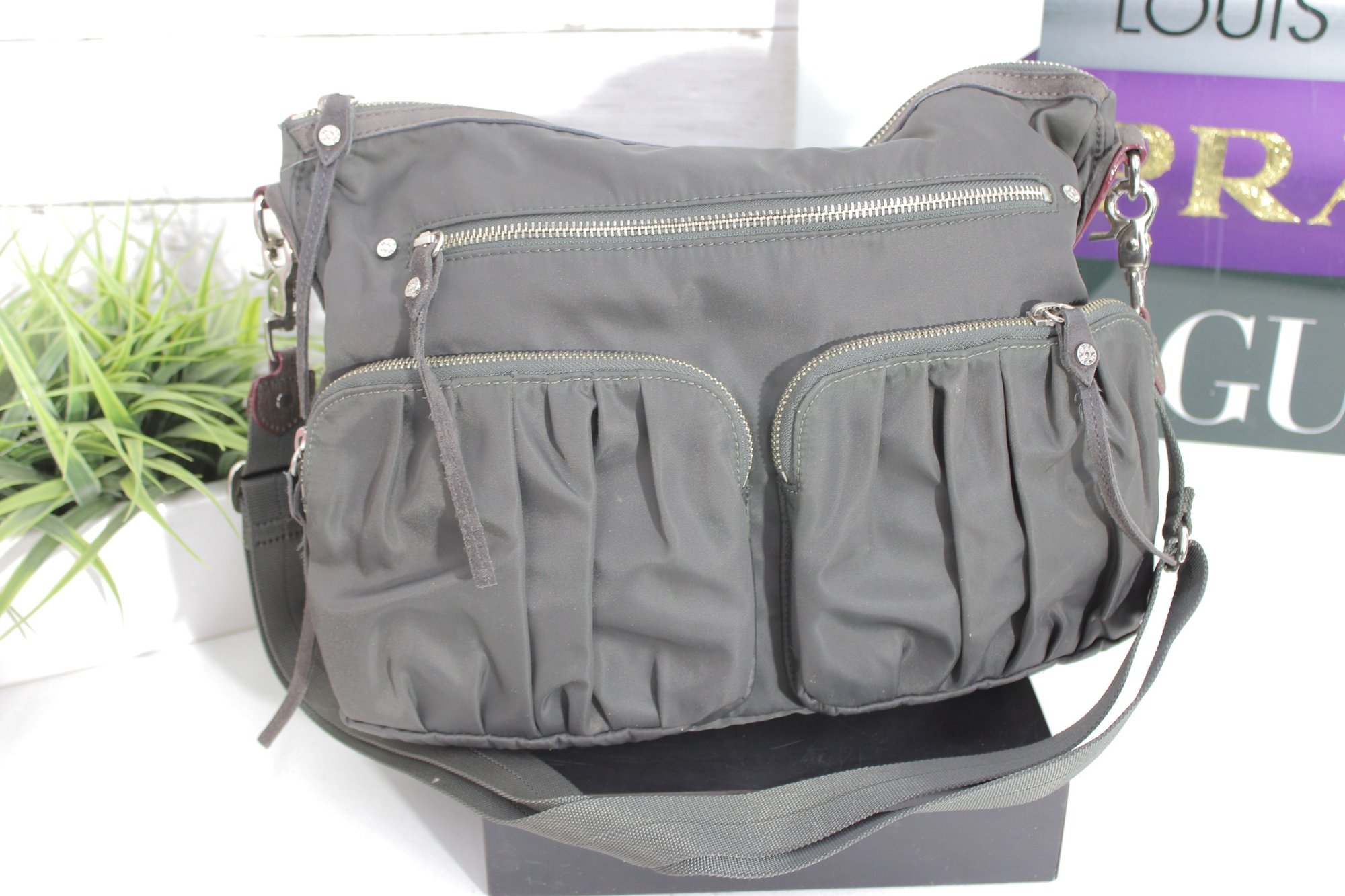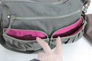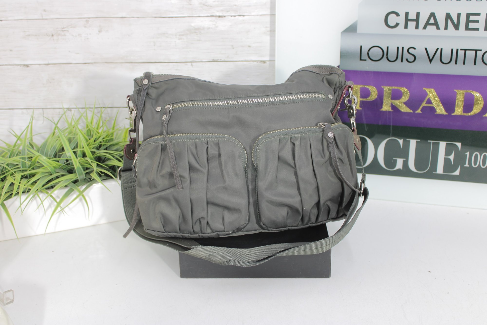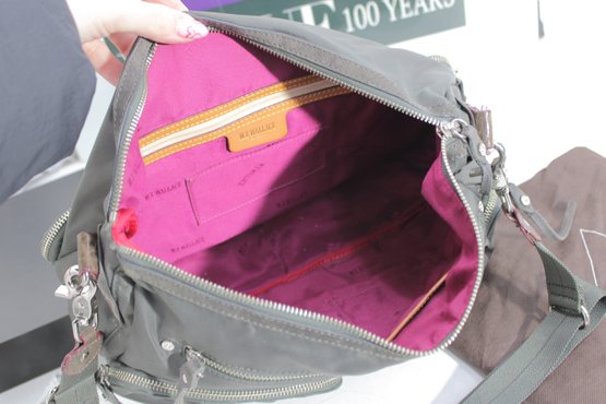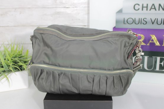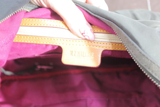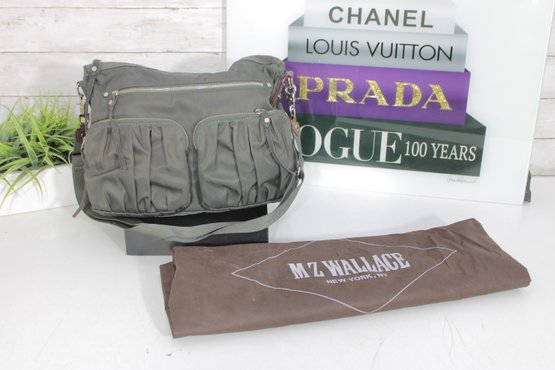 a stylish and highly functional MZ Wallace crossbody shoulder bag in a versatile gray nylon with leather trim accents. This lightweight designer bag is perfect for everyday use, travel, or work, offering excellent organization in a sleek silhouette.