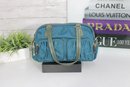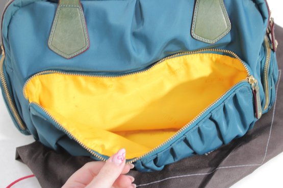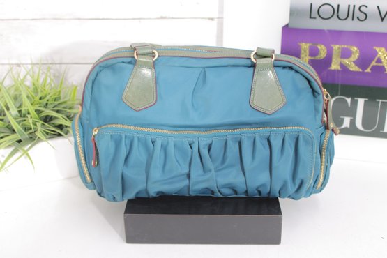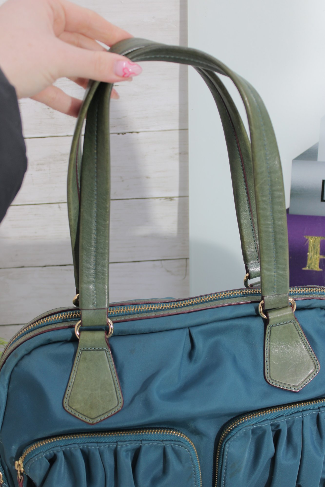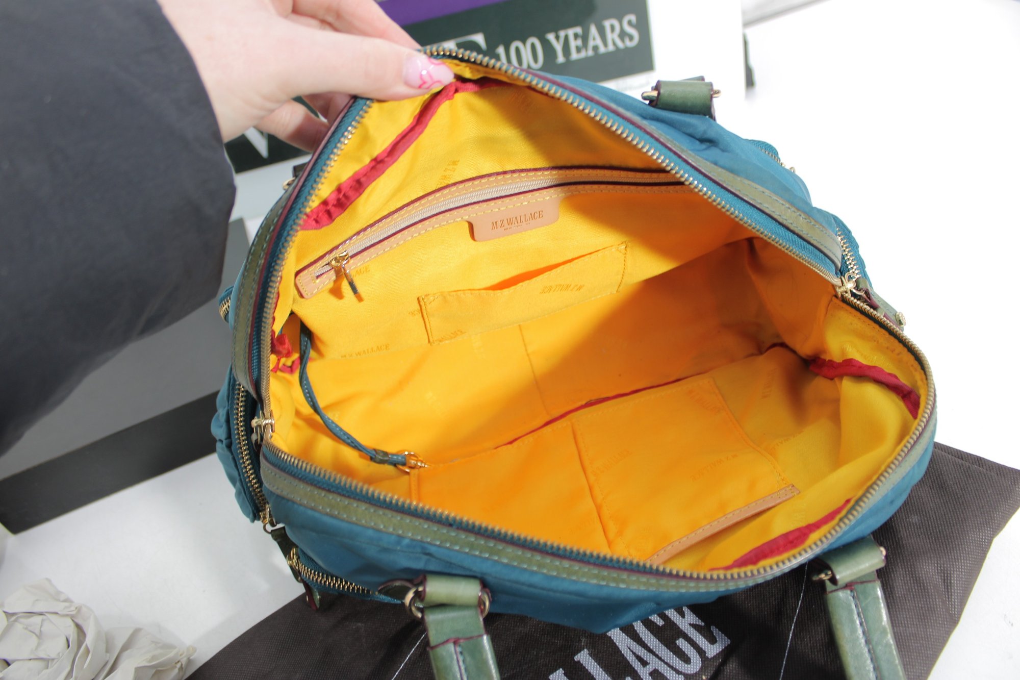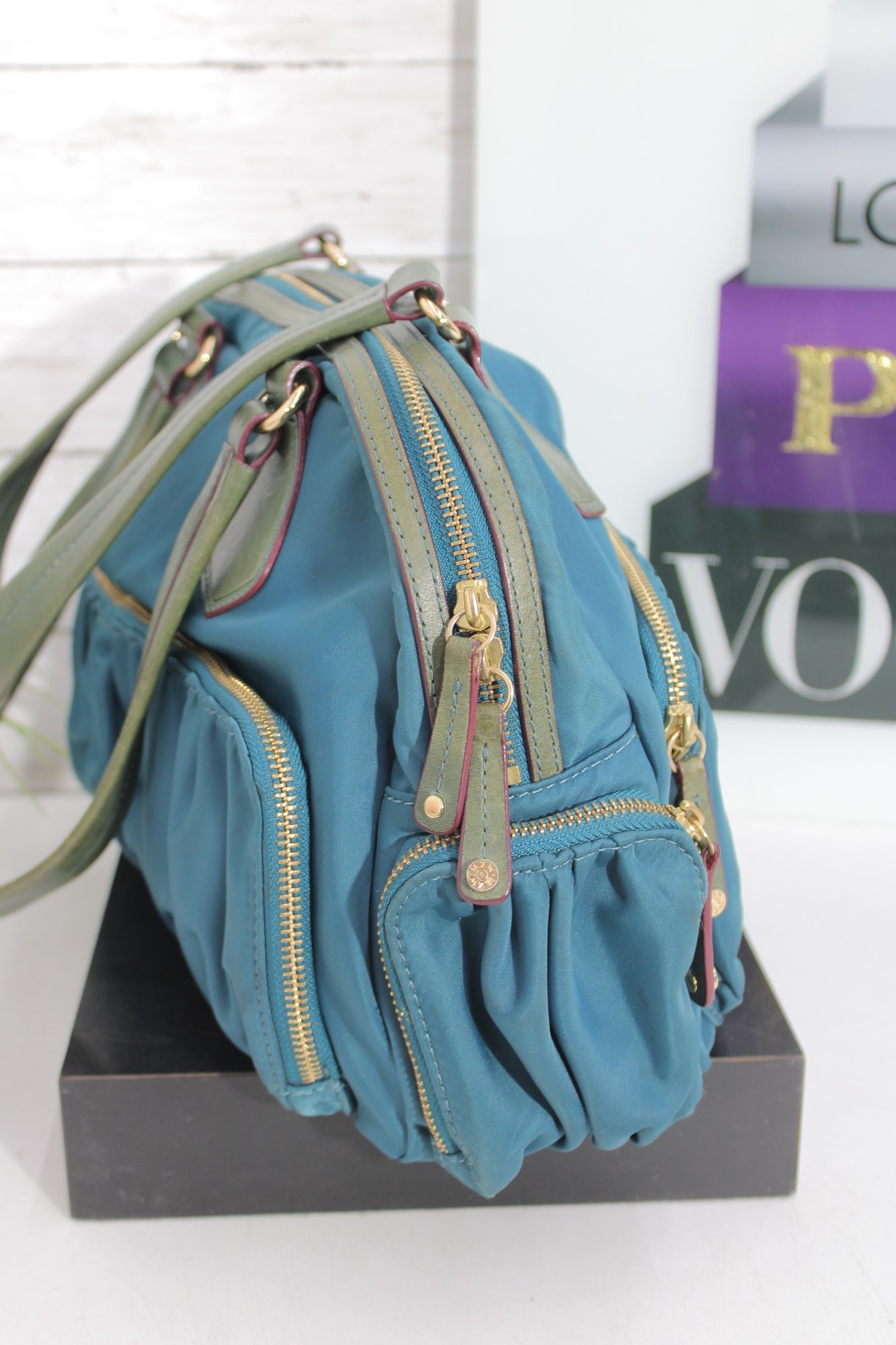 a stylish and functional MZ Wallace satchel handbag in a beautiful teal nylon with green leather trim and handles. Known for their lightweight yet durable construction, MZ Wallace bags combine luxury styling with everyday practicality.