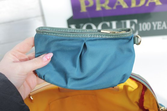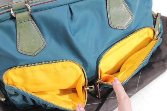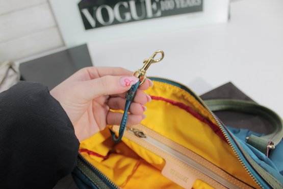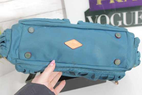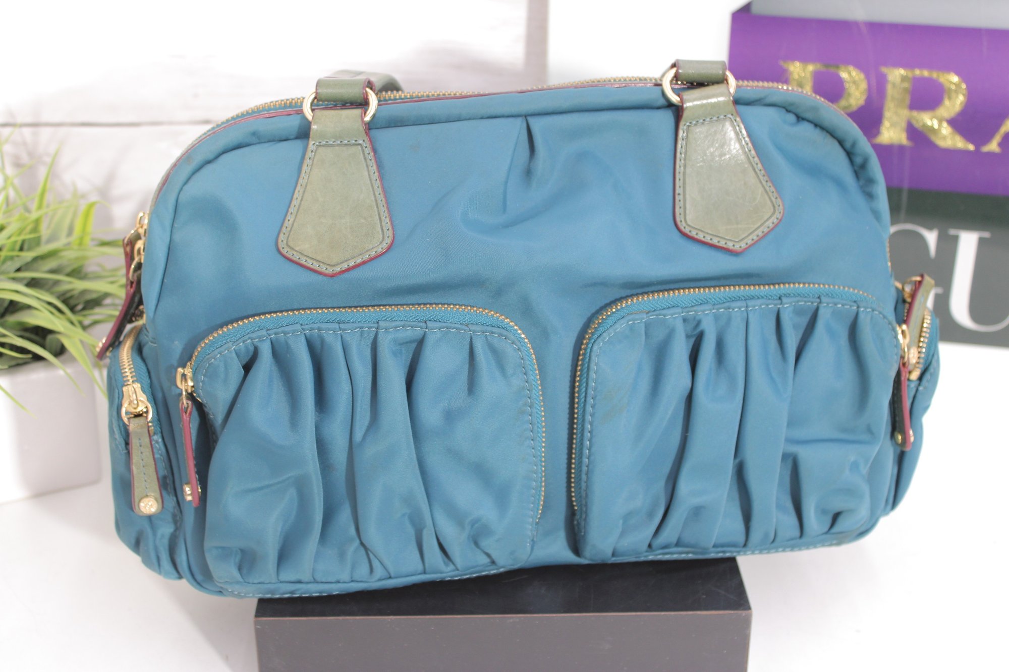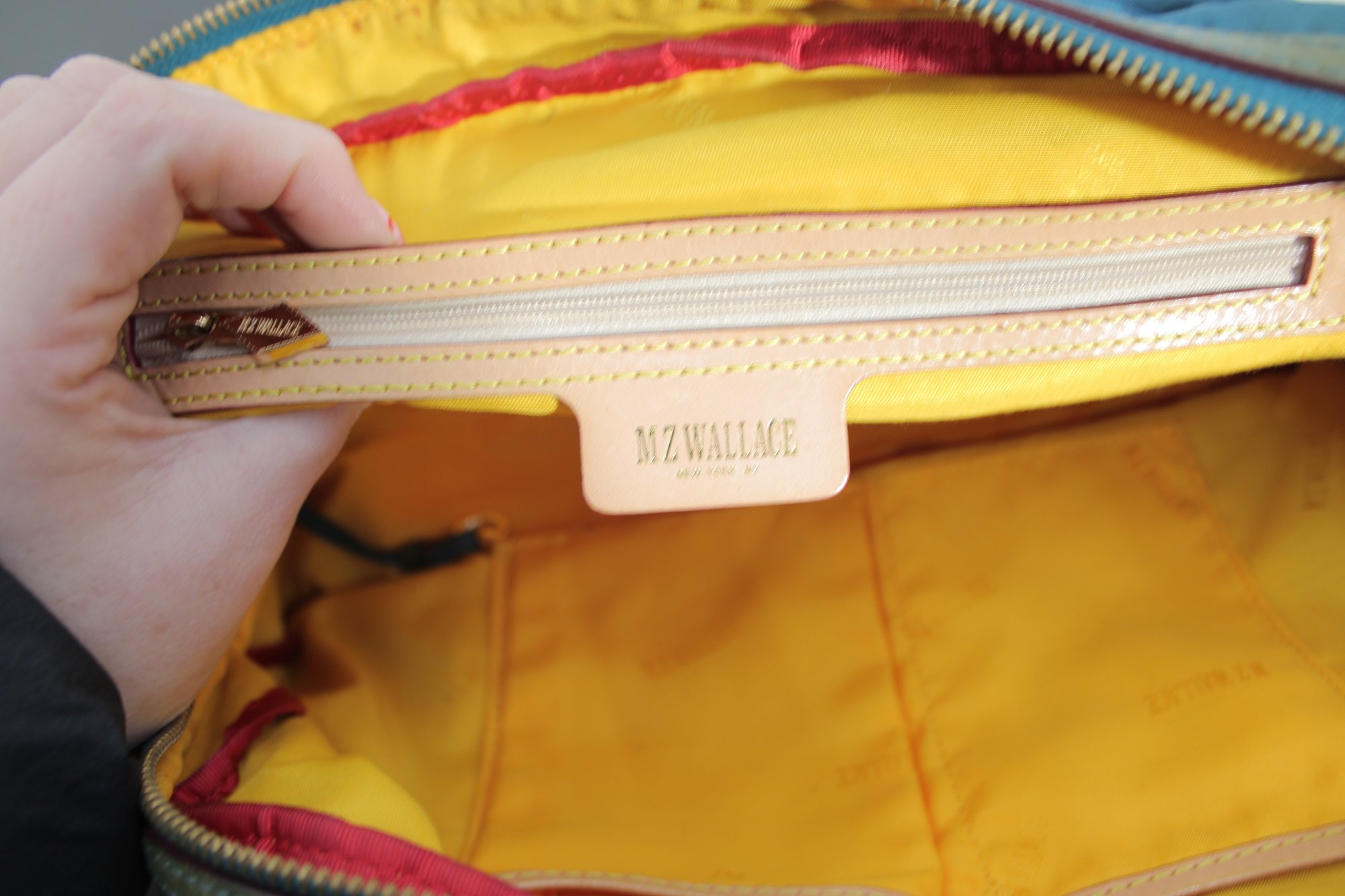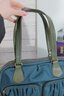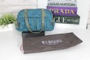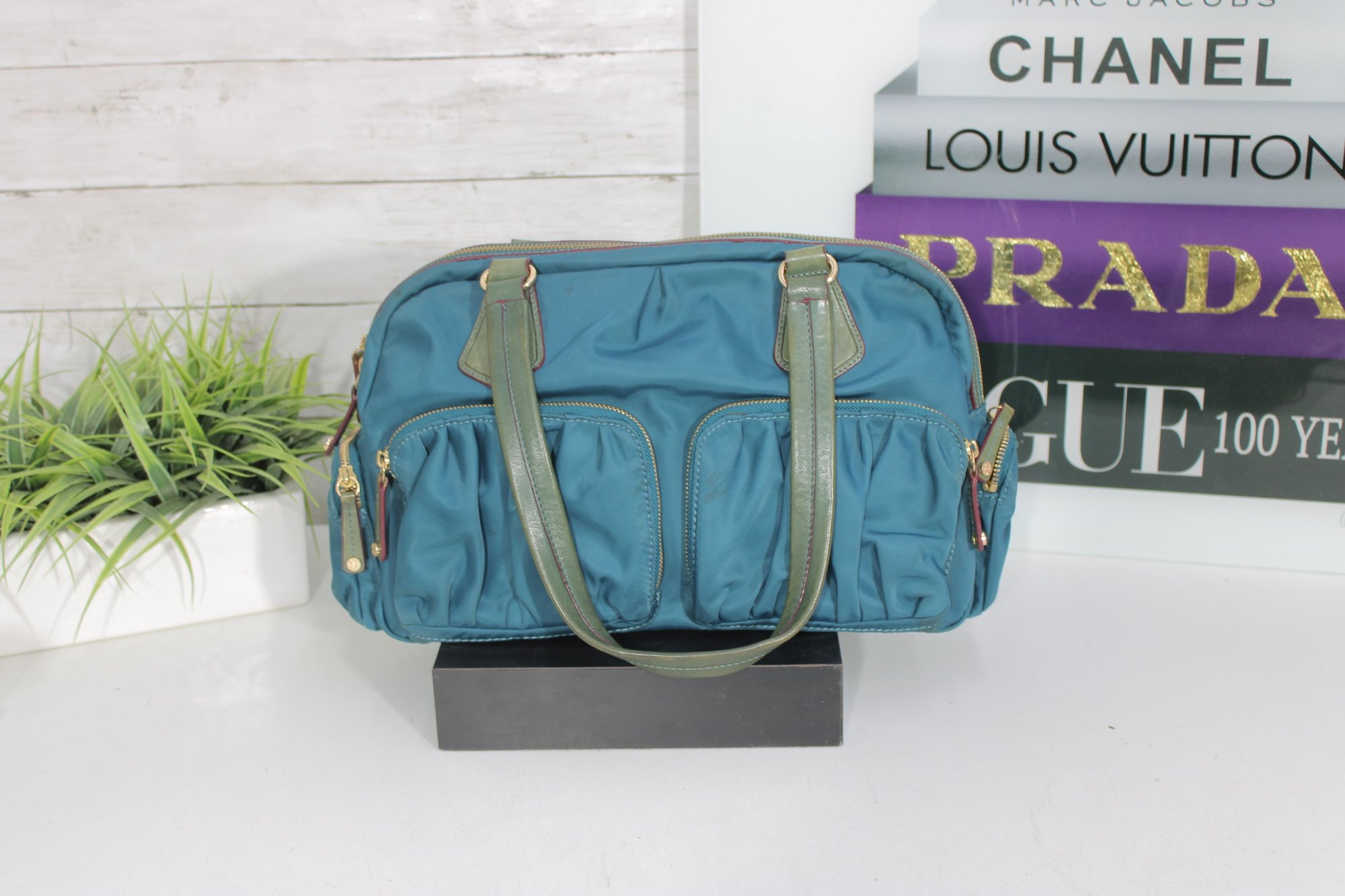 a stylish and functional MZ Wallace satchel handbag in a beautiful teal nylon with green leather trim and handles. Known for their lightweight yet durable construction, MZ Wallace bags combine luxury styling with everyday practicality.