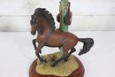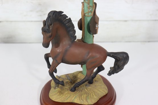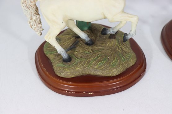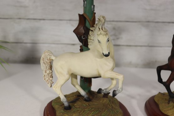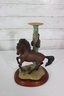 a beautiful pair of “Noble Stallions” candlesticks, featuring detailed rearing horse figures mounted on decorative bases. Each piece showcases a finely sculpted horse in motion, finished in realistic tones and set atop a scenic base with a classic candlestick holder rising behind the figure.