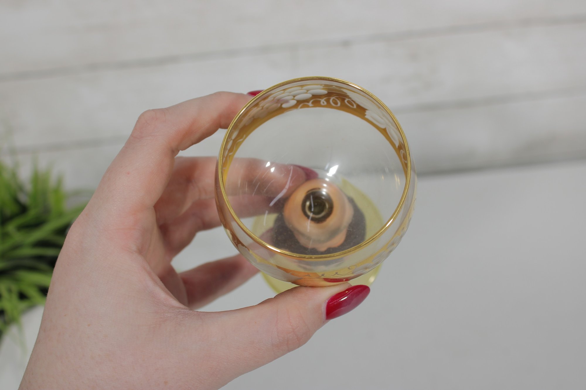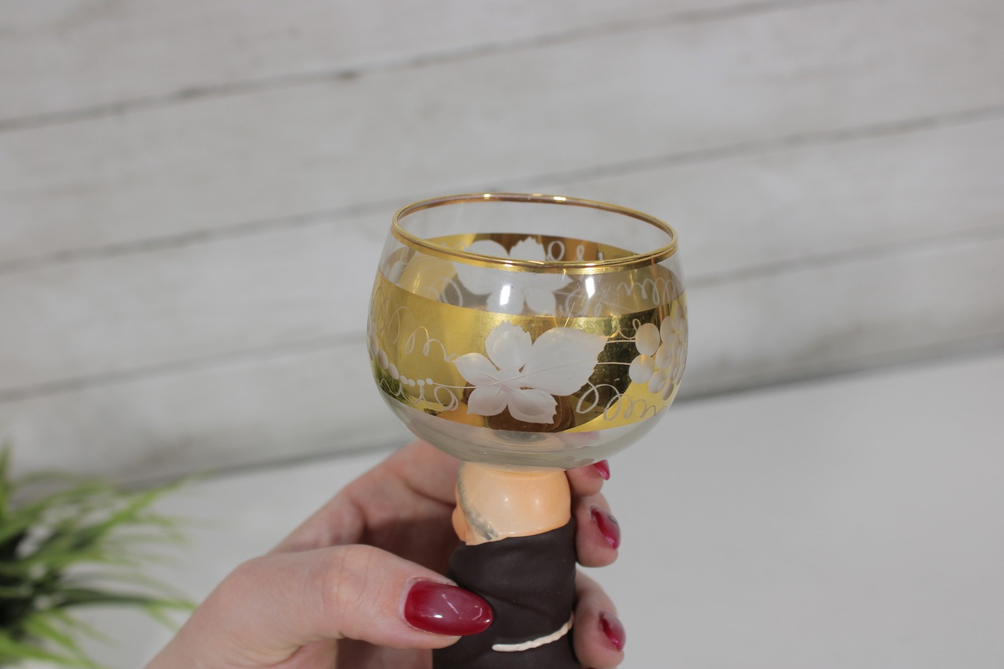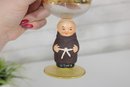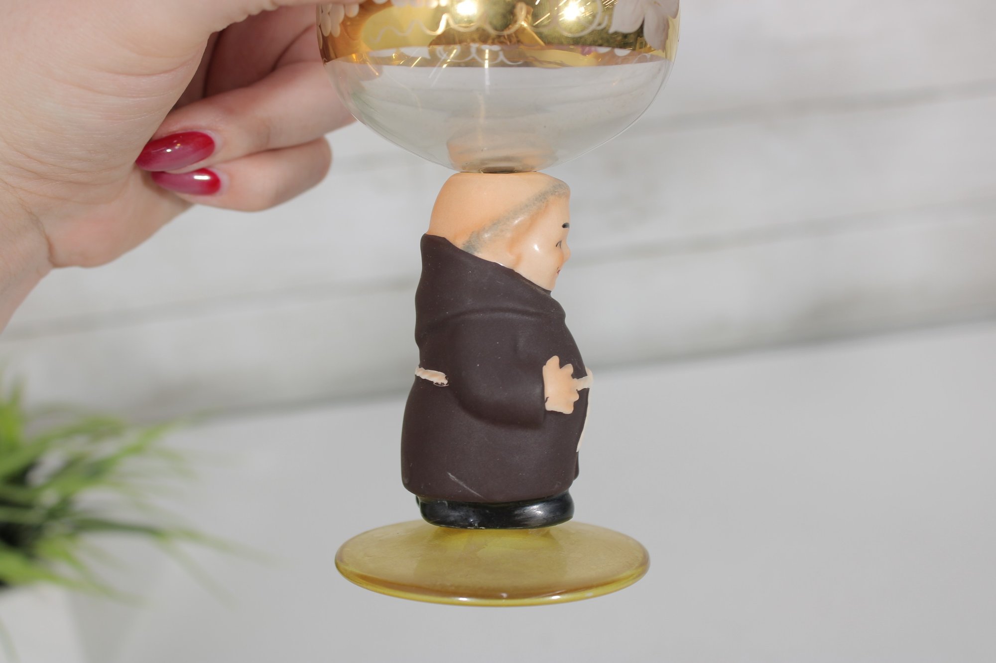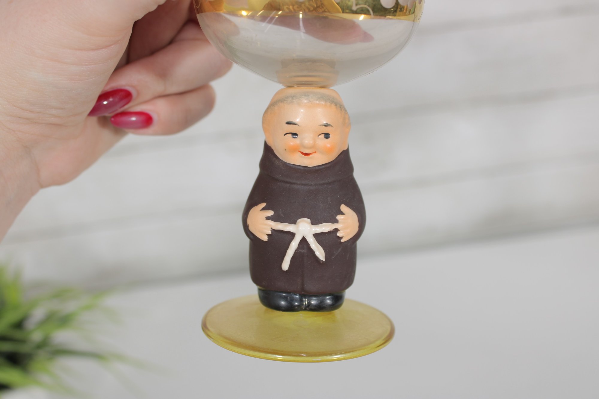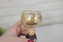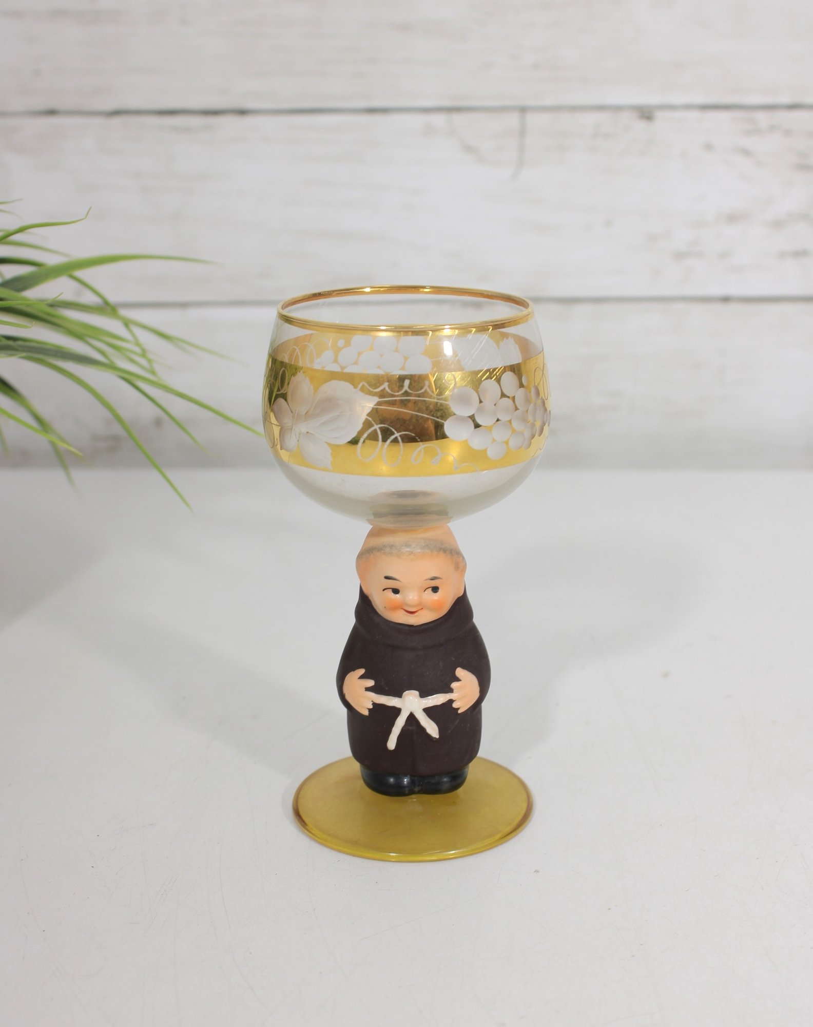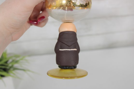 Charming vintage Goebel wine goblet featuring the beloved Friar Tuck monk figure as the stem. The hand-painted monk base adds a whimsical touch, while the bowl is decorated with delicate etched floral motifs and finished with elegant gold trim.