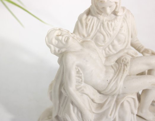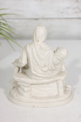 Beautiful and meaningful Goebel Sacrart figurine depicting the classic Pietà scene, with the Virgin Mary tenderly holding Jesus. This finely detailed religious sculpture captures a powerful moment of compassion and devotion, rendered with graceful lines and serene expression.