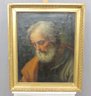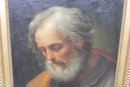 oil on canvas painting presents a deeply contemplative portrait of an elderly bearded man, rendered in a classical, old-master style. Shown in three-quarter view with eyes cast downward, the figure conveys a sense of introspection and quiet gravity. The artist’s sensitive handling of flesh tones, hair, and drapery demonstrates strong technical skill and an understanding of traditional portrait conventions.