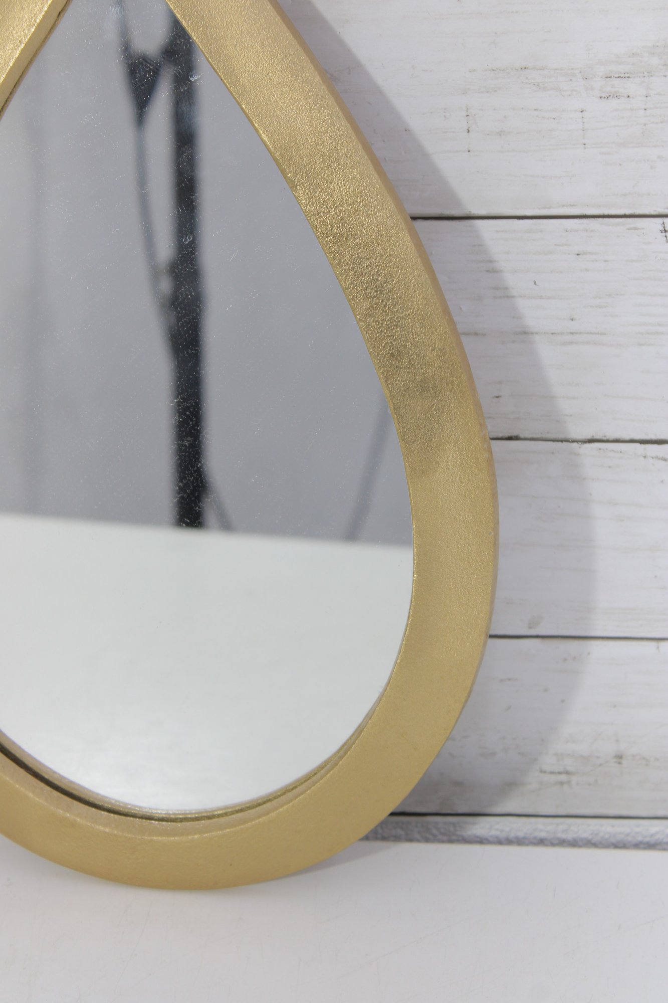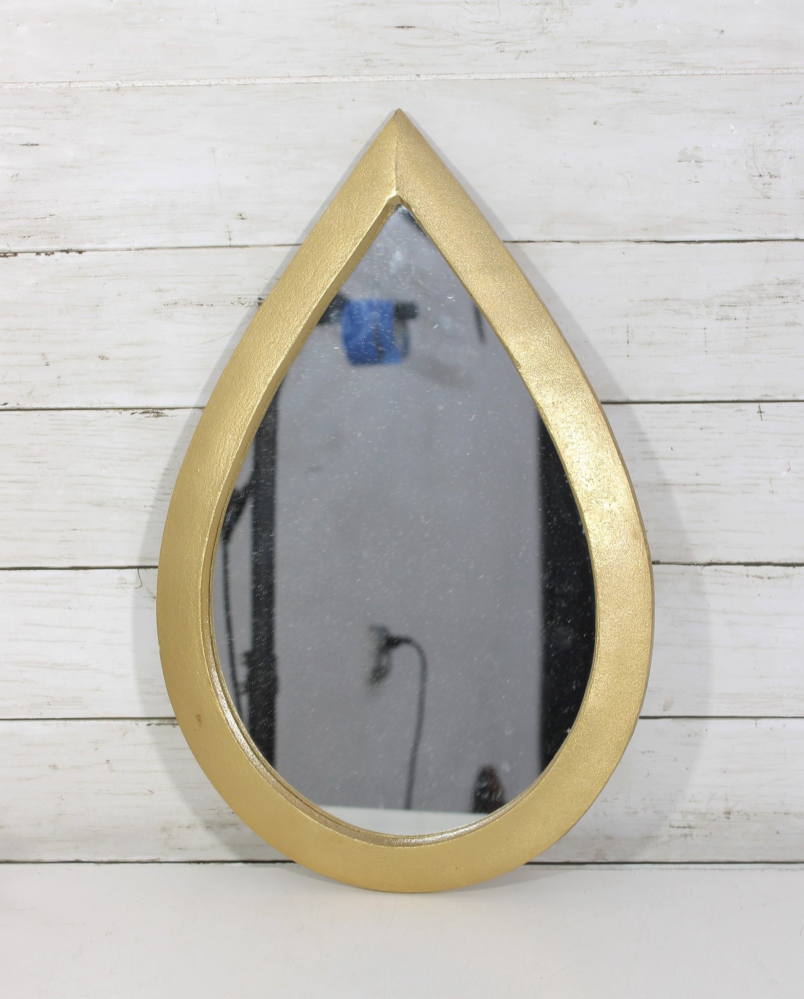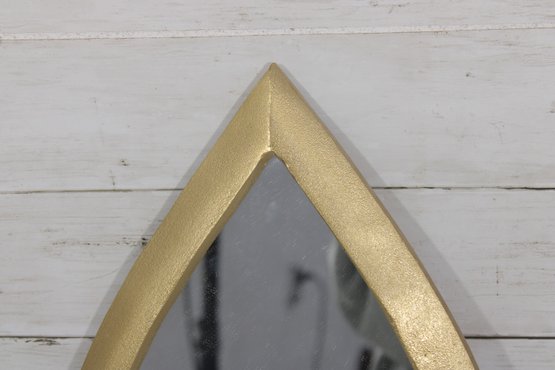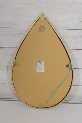 teardrop-shaped wall mirror featuring a gold-tone frame and sleek modern styling. This decorative accent mirror has a clean, simple silhouette that works beautifully in a bathroom, entryway, bedroom, powder room, or gallery wall arrangement.