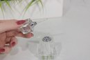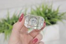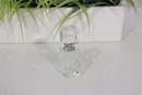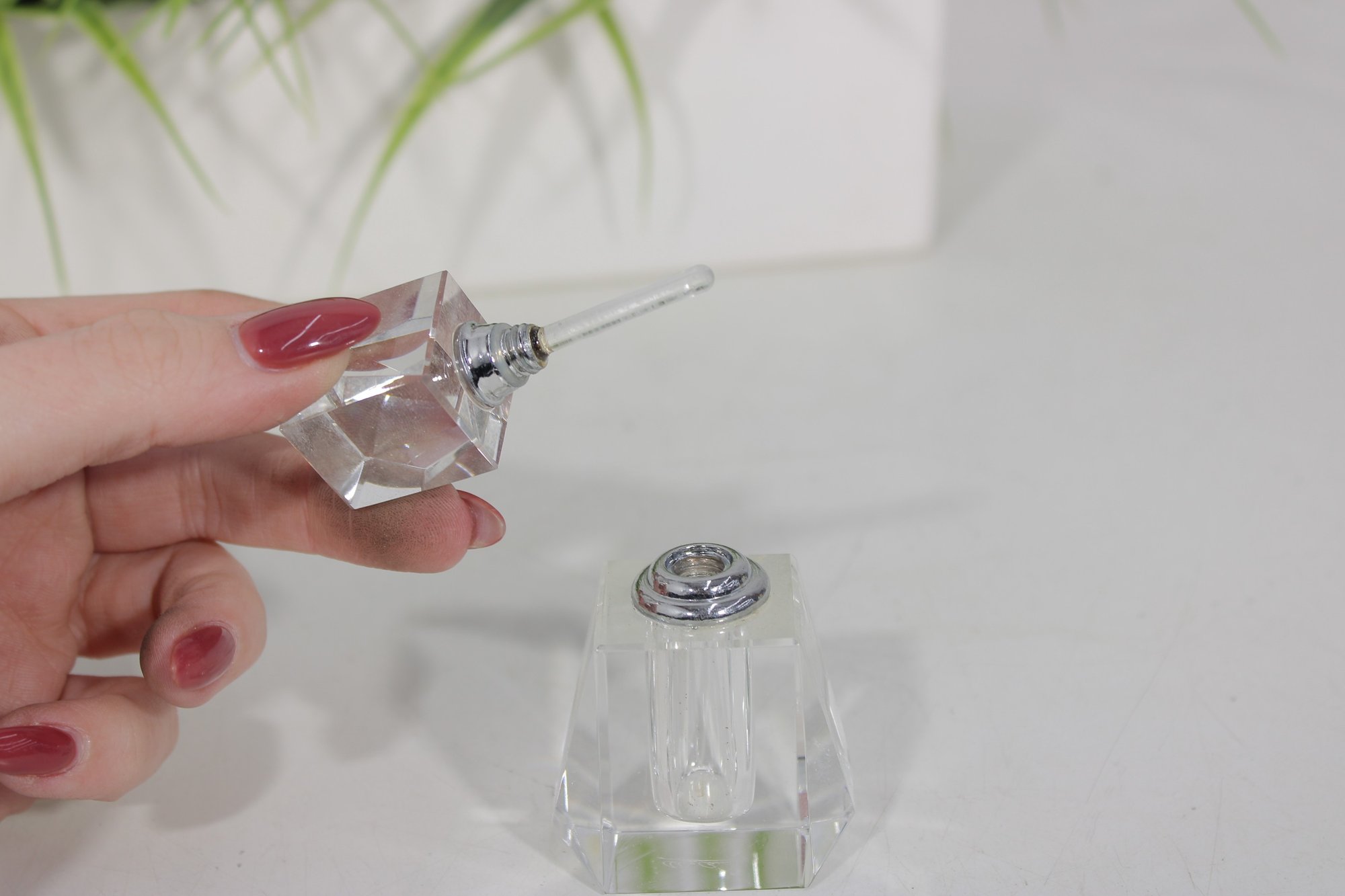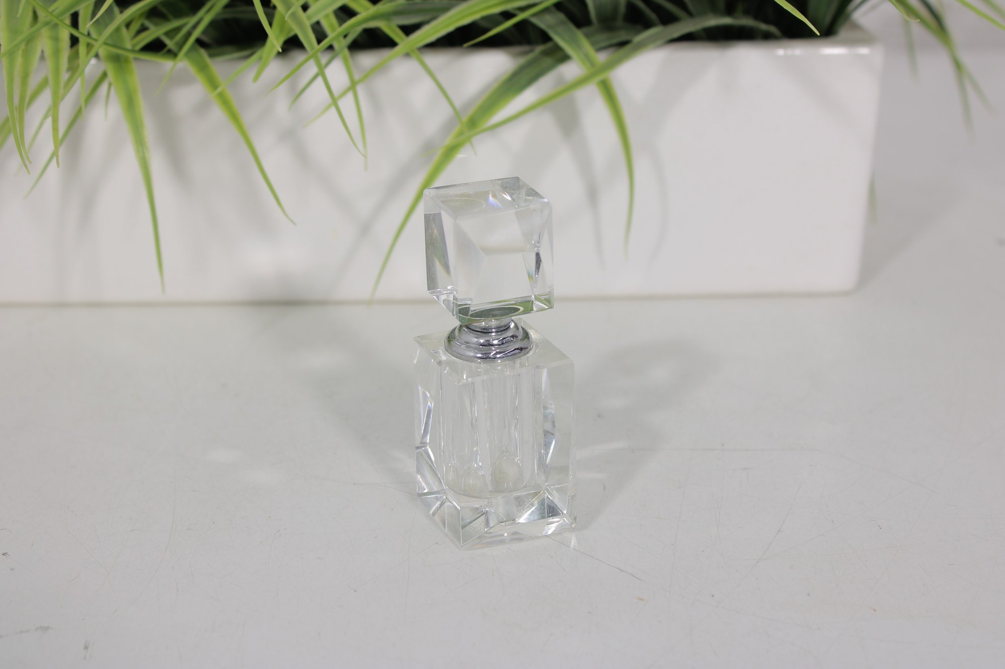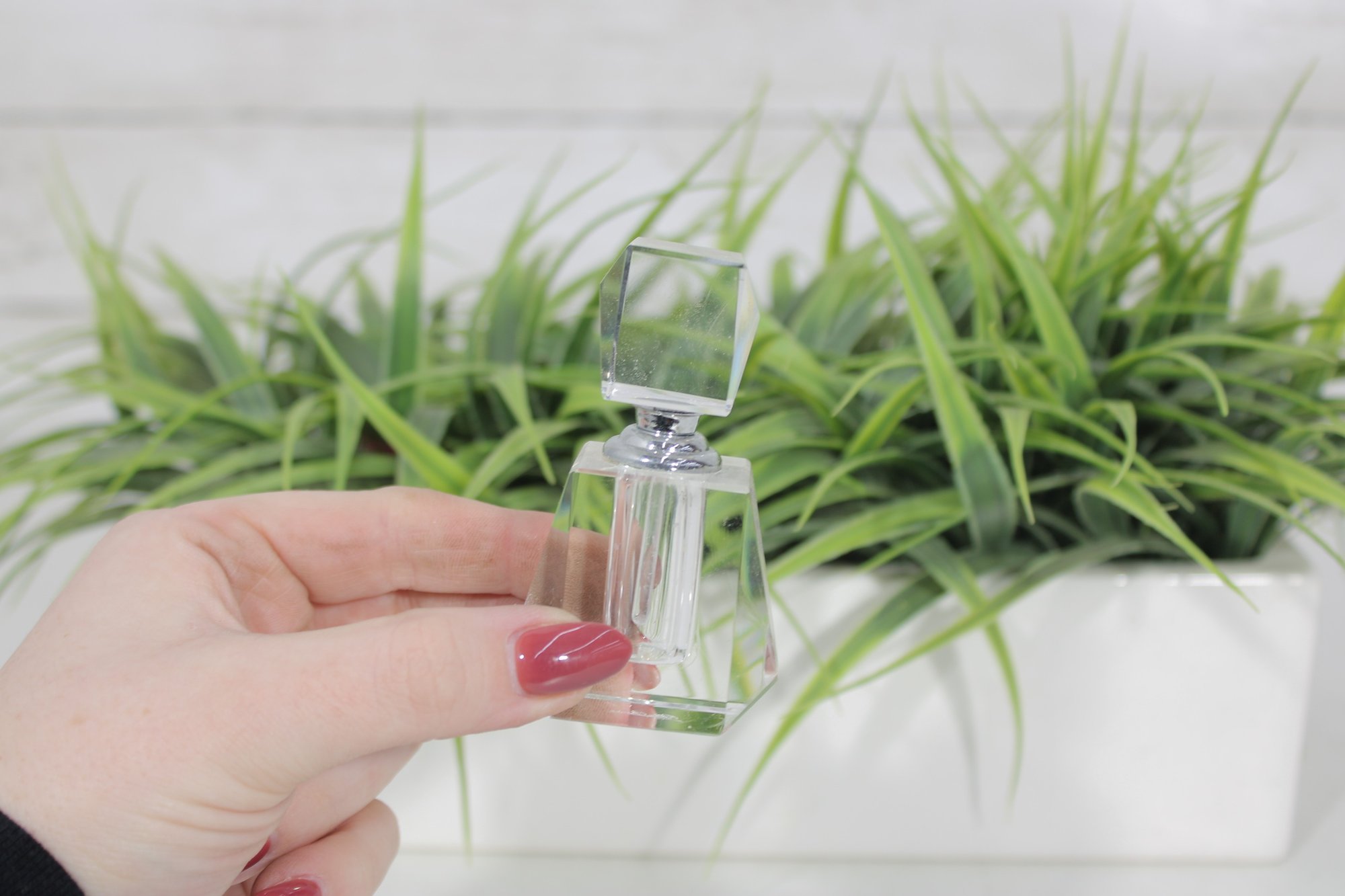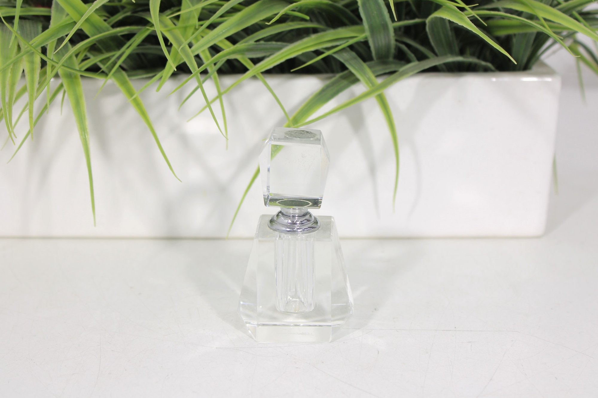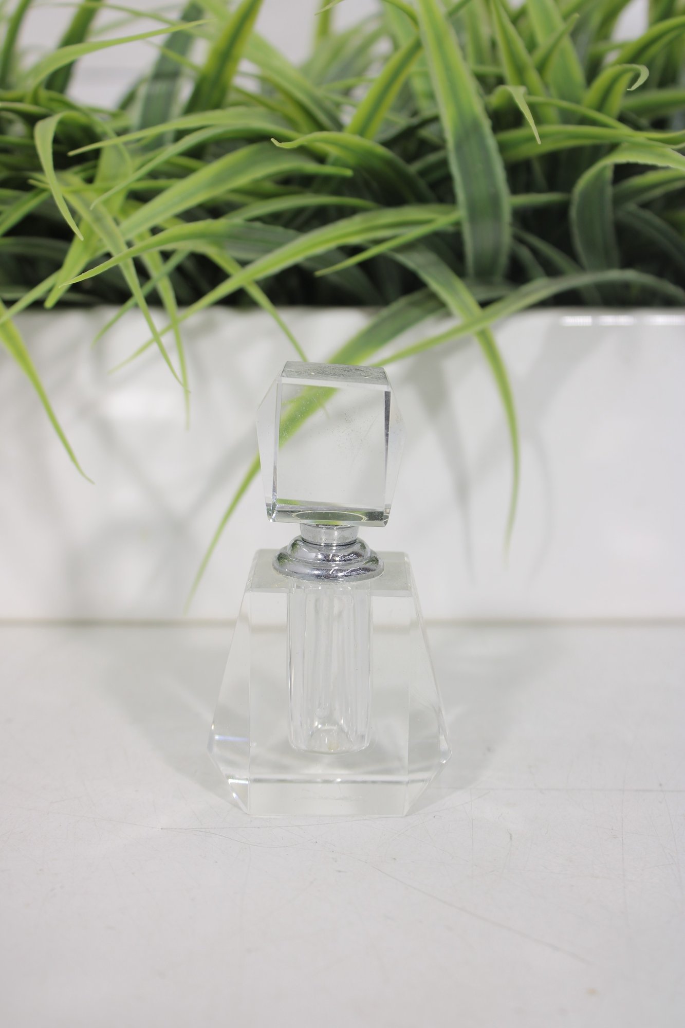 This elegant bottle features a faceted geometric design with vertical fluting and a square base. The matching stopper is tall and angular, adding a refined and modern touch to the overall silhouette.