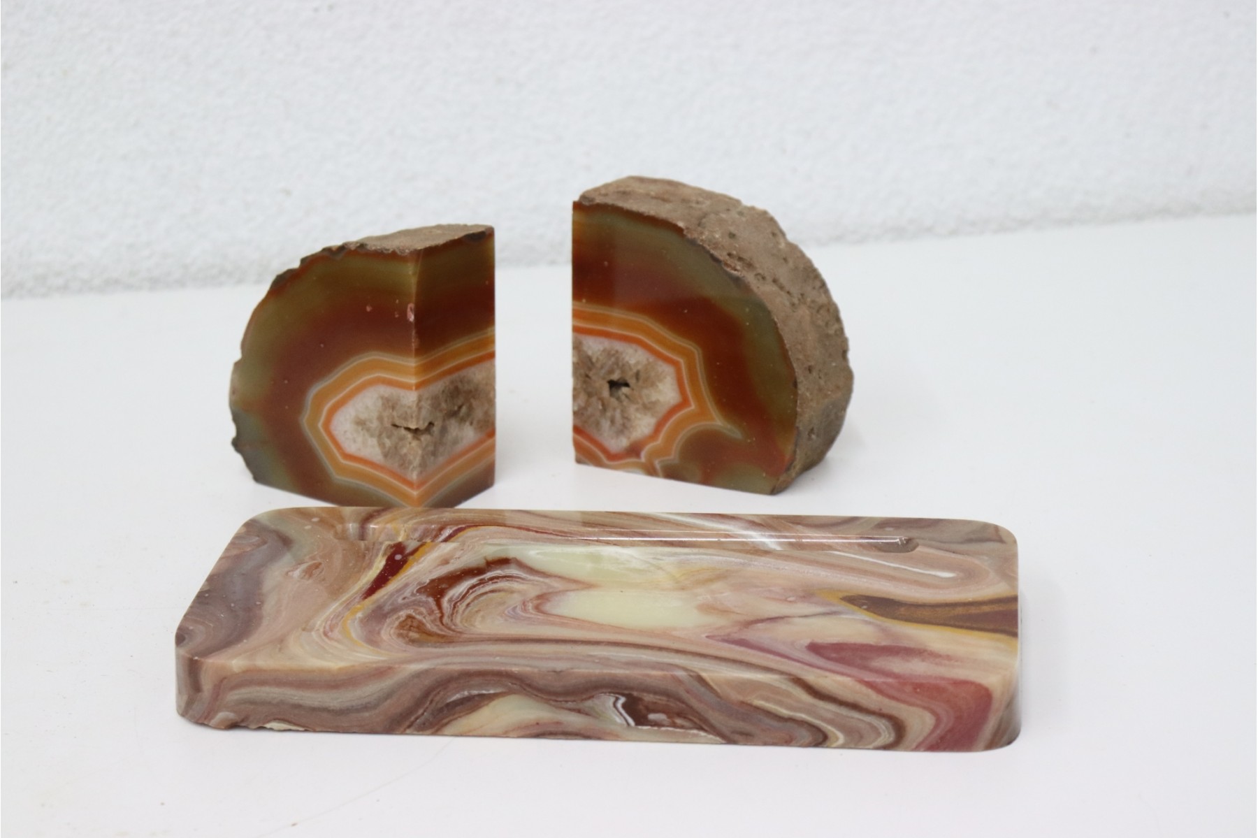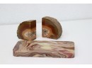 Polished Agate Crystal Geode Slice Bookends And A Polished Agate Desk Tray